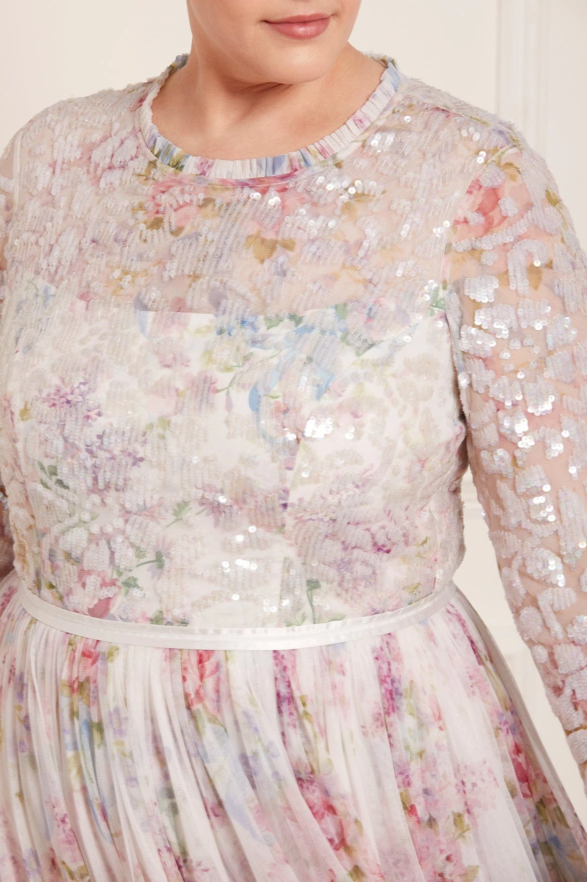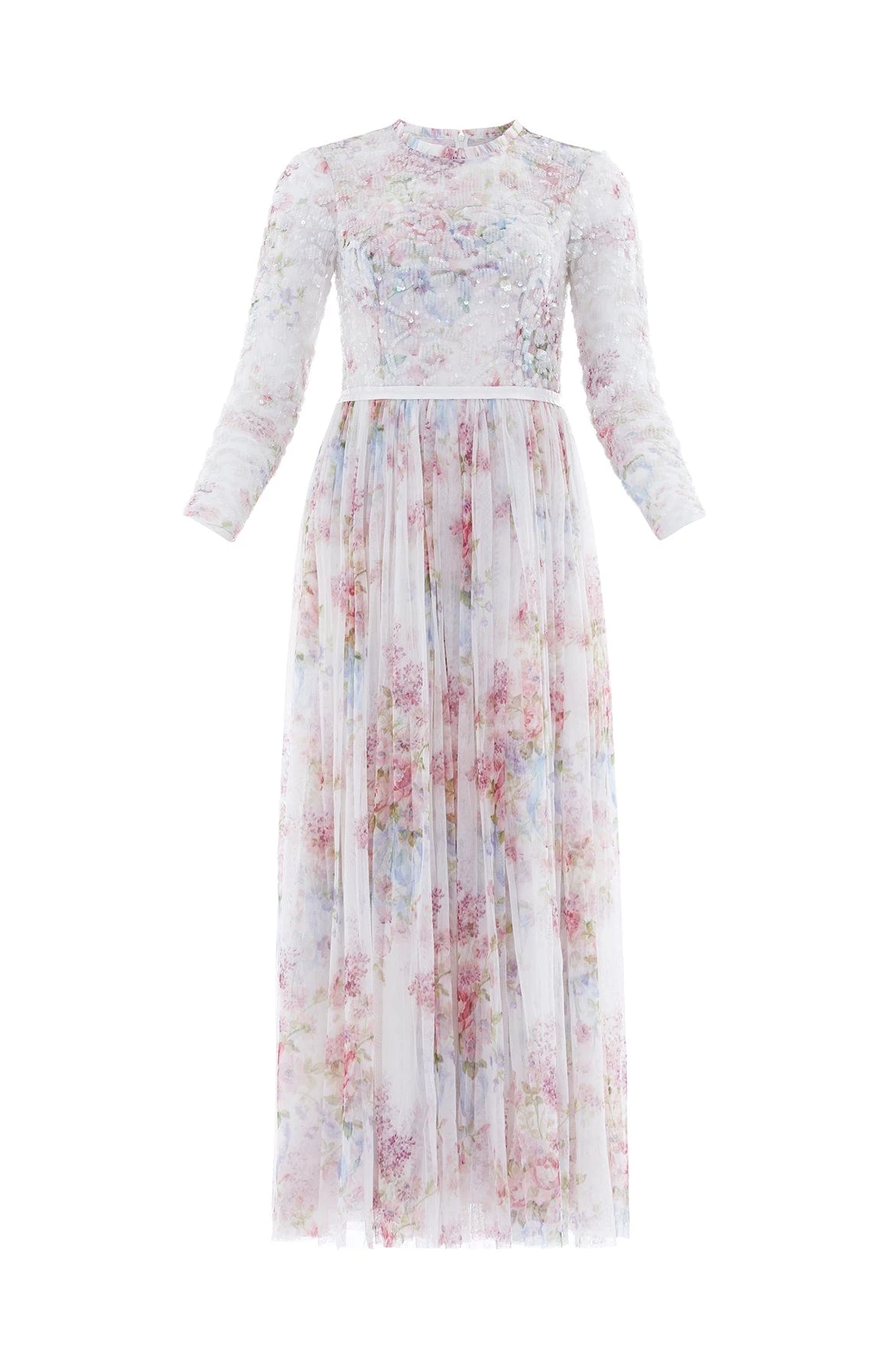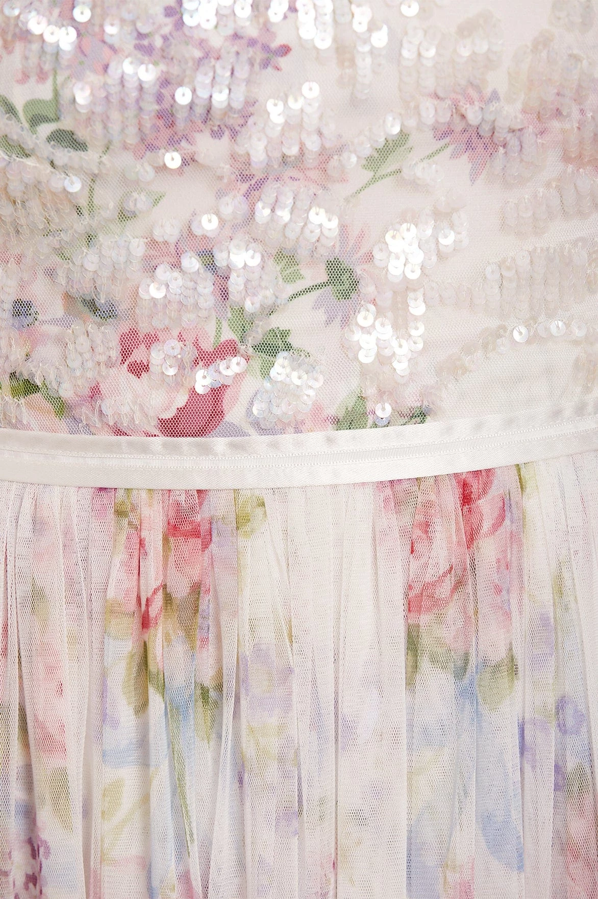 NEW SEASON. The Floral Wonder Bodice Ankle Gown in Moonshine. The bodice of this gown is adorned with shimmering iridescent sequins in romantic lace motifs. The skirt of this dress is layered beautifully in a floral bouquet print taken from a 1900’s hand painted artwork. Designed with a signature Needle & Thread waistband and tulle detail neckline. Beautifully crafted with a voluminous silhouette, creating a romantic look. A staple for your wardrobe.