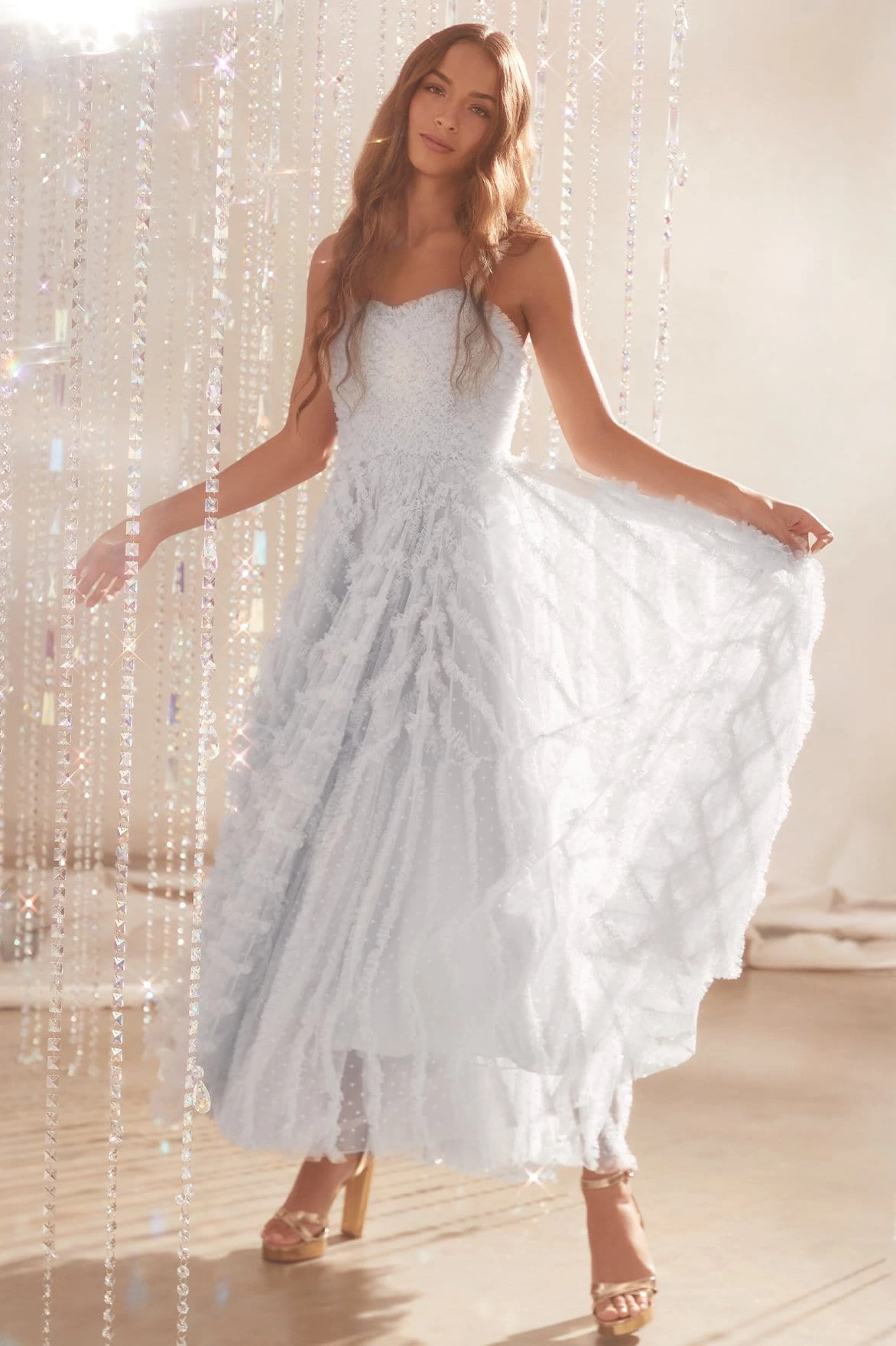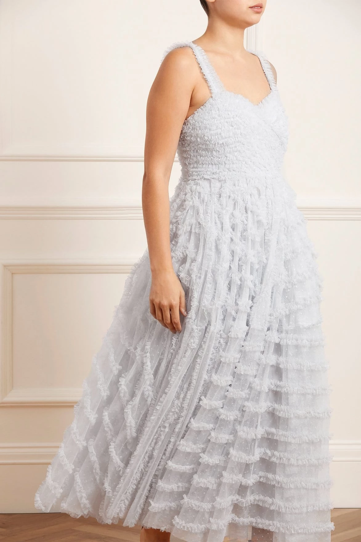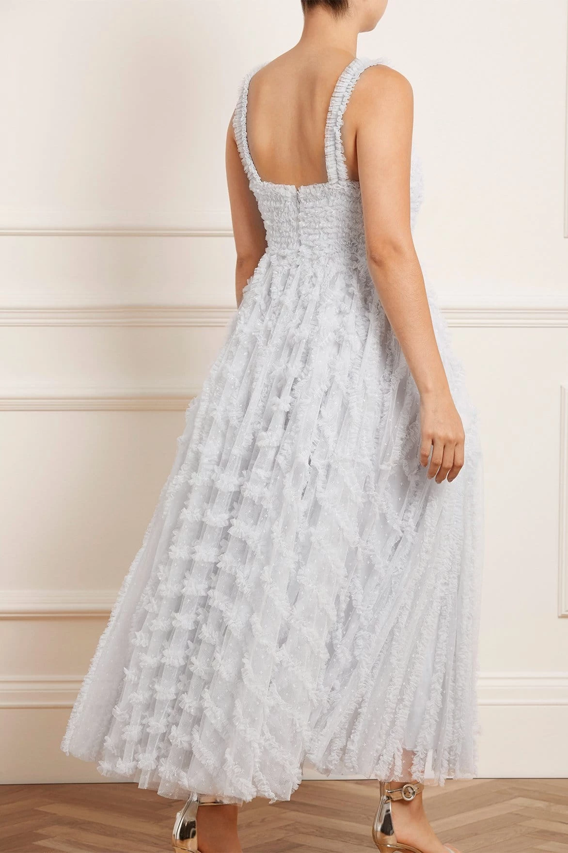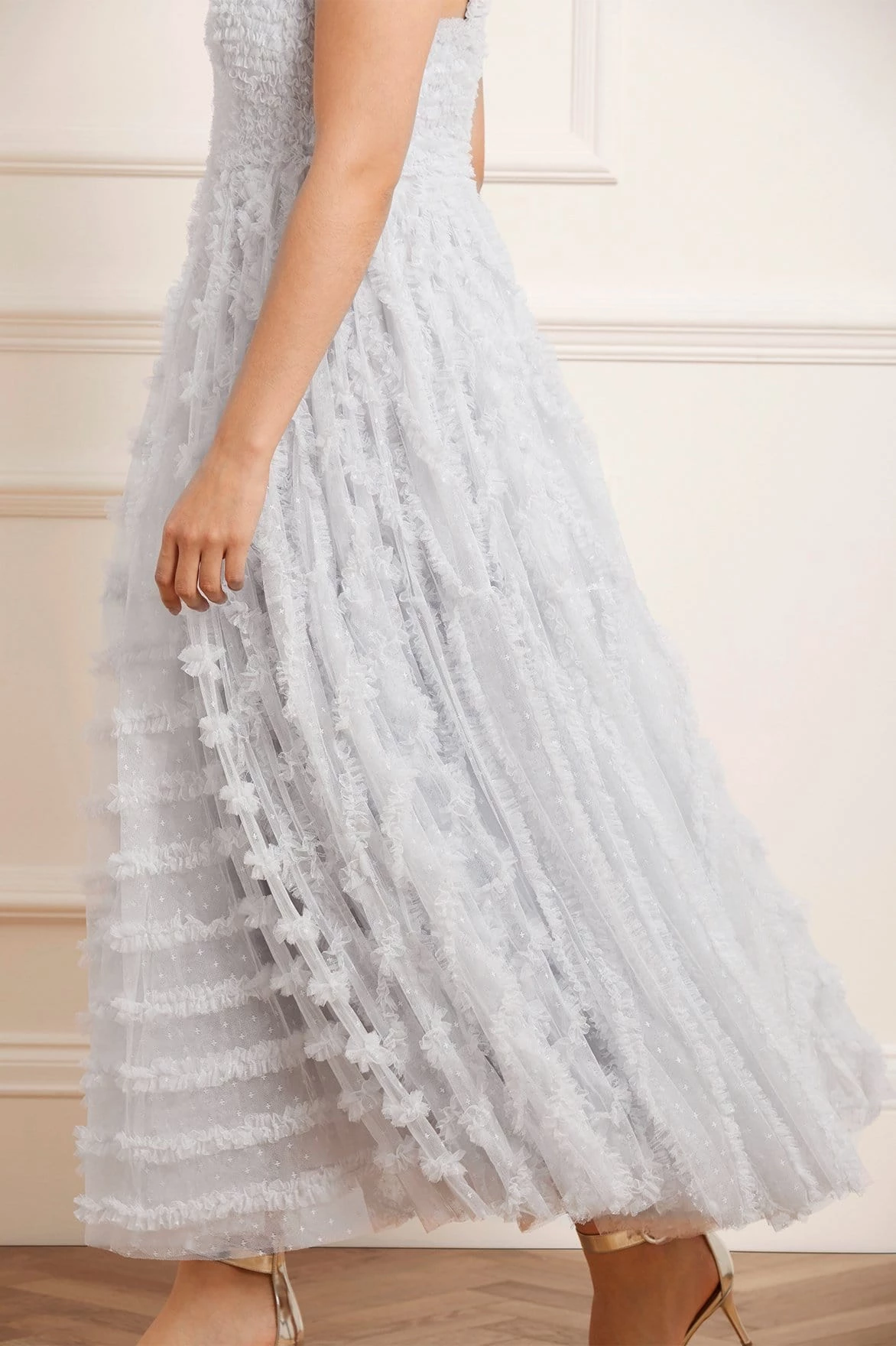 NEEDLE & THREAD EXCLUSIVE. The Florence Cami Ankle Gown in Ice Blue. This statement gown is designed with gentle ruffles throughout, creating a romantic, flattering effect. The skirt of the dress is crafted in circular pieces for dramatic volume and a sweeping hemline. A key piece of the season.