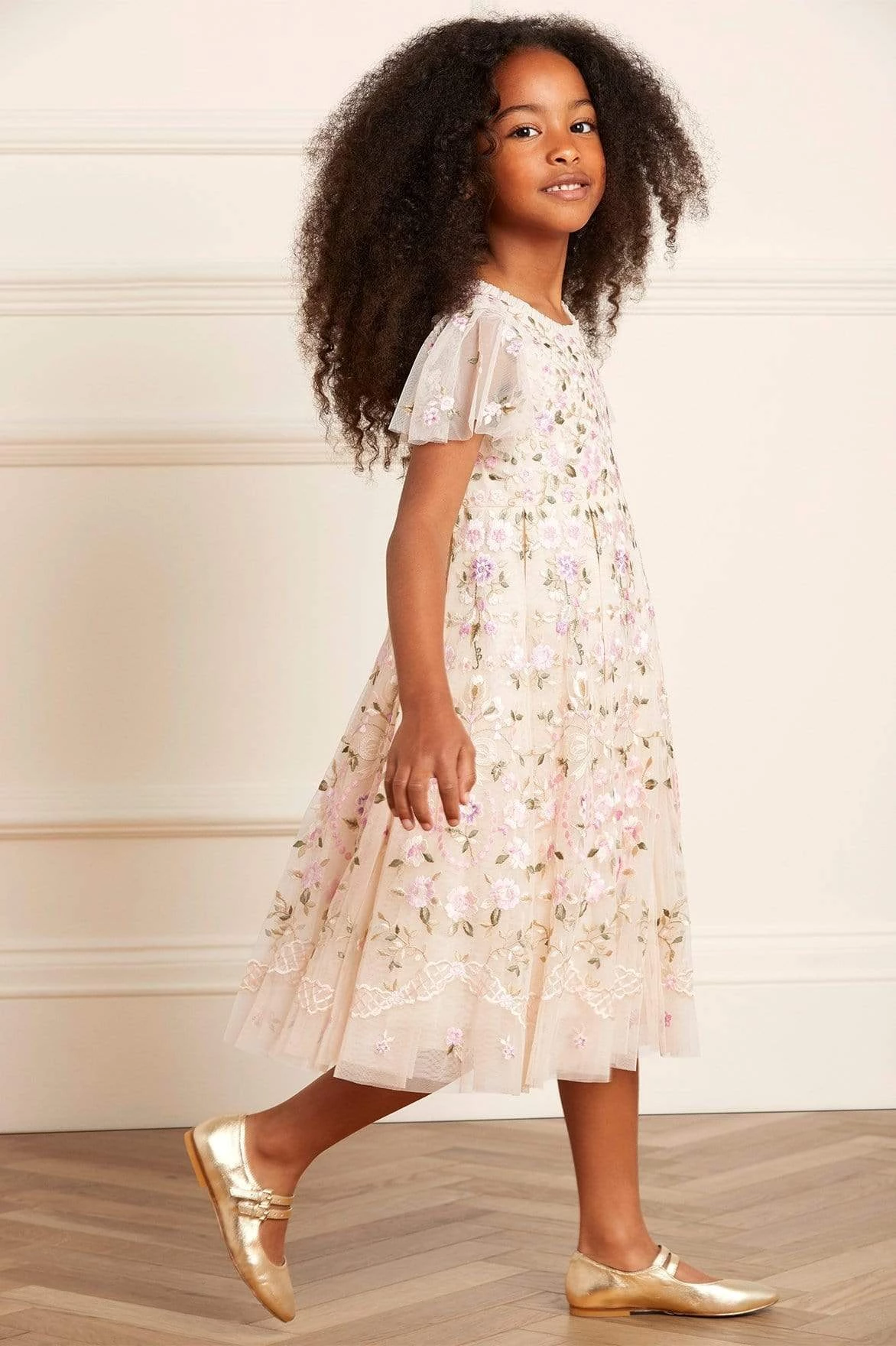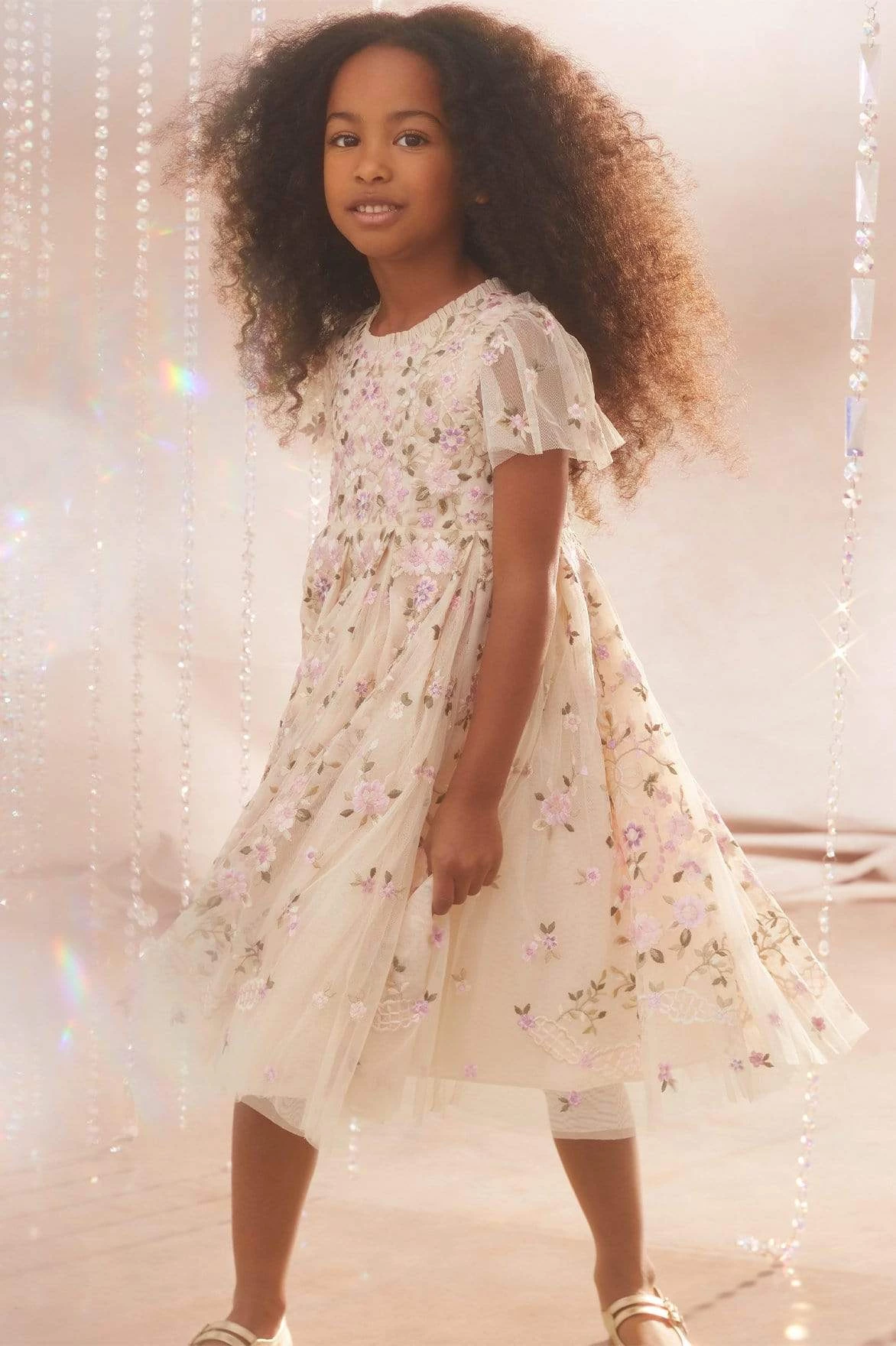 NEW SEASON | NEEDLE & THREAD EXCLUSIVE. The Floret KIDS Prom Dress in Champagne. This dress is embroidered with floral, trellis and ribbon bow motifs in multi-coloured artwork, inspired by vintage lace and garden flowers. The skirt has a couture-inspired silhouette with a generous box pleat to create dramatic volume and movement. The perfect statement piece for your little one’s wardrobe.