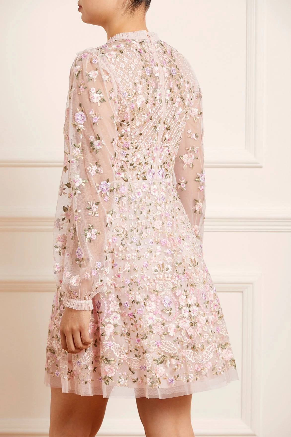 The Floret Mini Dress in Petal Pink. This piece is inspired by vintage lace and garden florals and fully embroidered in rich, multi-coloured thread. Beautifully decorated with intricate flowers and delicate trellis motifs, resulting in an effortless silhouette. A style you’ll keep coming back to.