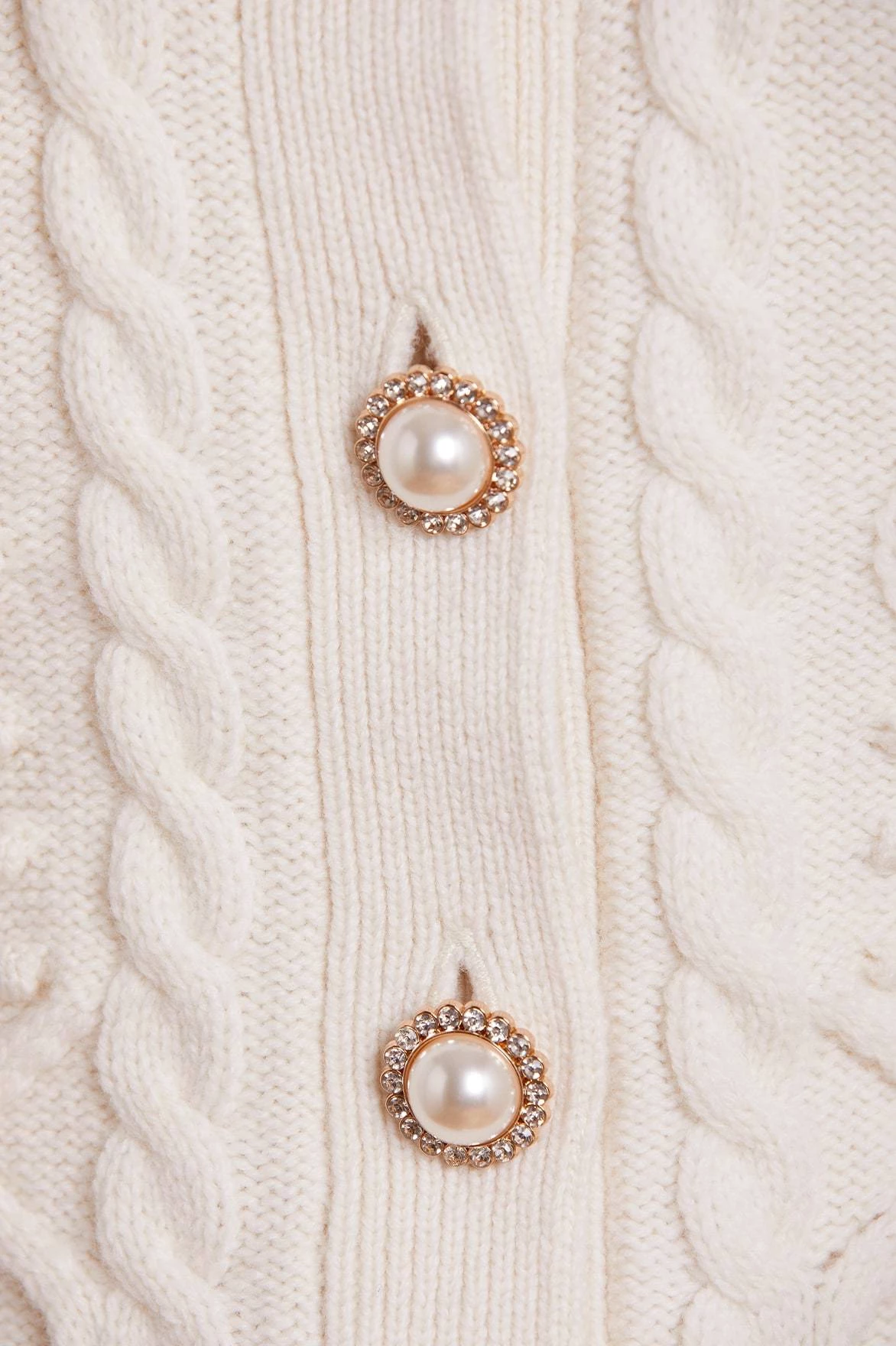 NEEDLE & THREAD EXCLUSIVE. The Flower Applique Short Cardigan in Cream. Made from soft wool, this cardigan is beautifully decorated with faux pearl and crystal-embellished buttons. Designed with pretty crochet flowers, intricate trailing cables and bobbles, creating feminine detail throughout. The knit you will be forever thankful for.