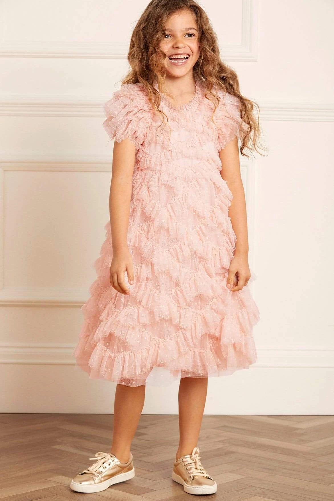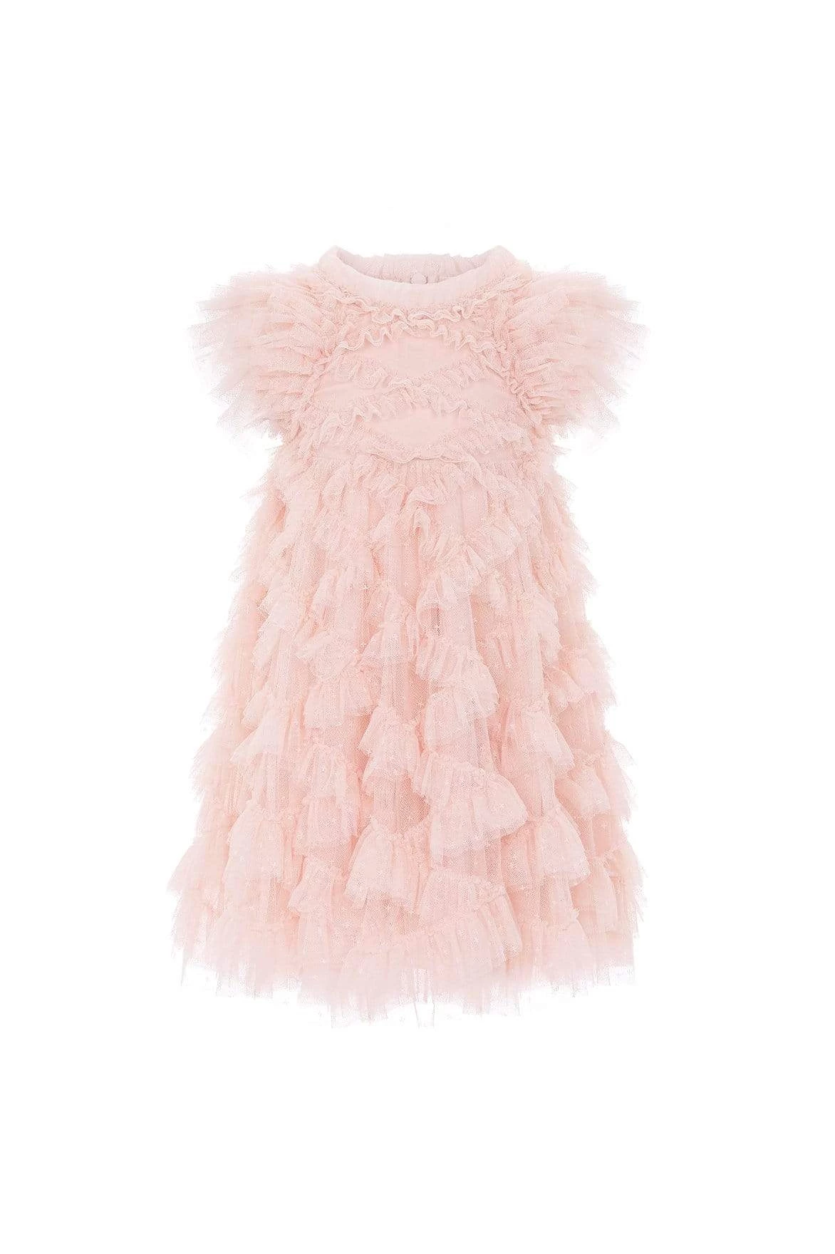 NEW SEASON | The Genevieve KIDS Dress in Petal Pink. This frothy textured dress is designed with playfully dramatic sleeves to create frilly fullness at the shoulders. It also features diamond stitch detailing resulting in a beautifully tactile finish. Let your little one take centre stage in this statement piece.