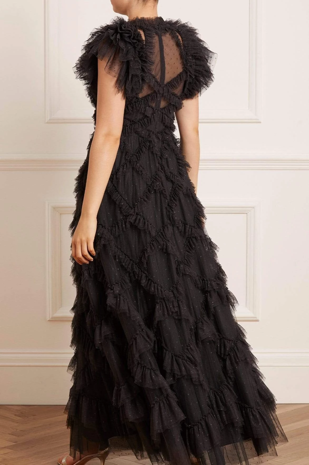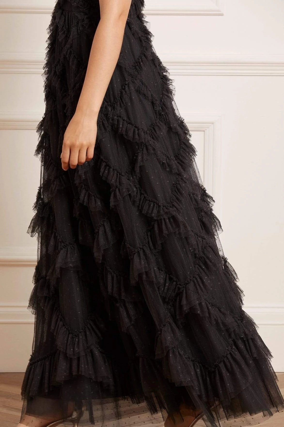 NEEDLE & THREAD EXCLUSIVE. The Genevieve Rose Gown in Graphite. This statement gown is inspired by 1930s Hollywood glamour. Beautifully designed with diamond tulle details and trims. Crafted with multiple layers of ruffled, frothy tulle sculpted for dramatic effect. Make the ultimate style statement this season.