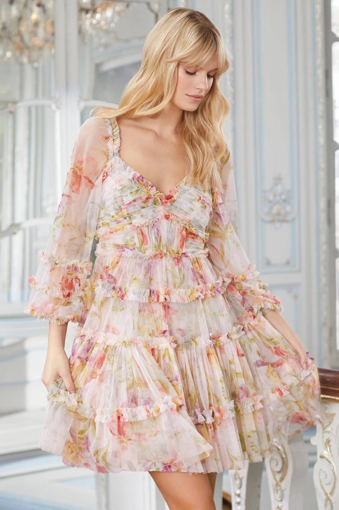 The Iris Bloom Mini Dress in Moonshine. Beautifully decorated in oversized iris flowers, ditsy blooms and lace-inspired motifs, creating a statement artwork. Designed with a flattering gathered silhouette and panelled bodice creating romantic movement. This pretty piece is crafted with layers of soft tulle and tiered with ruffle trims. A new Needle & Thread favourite.