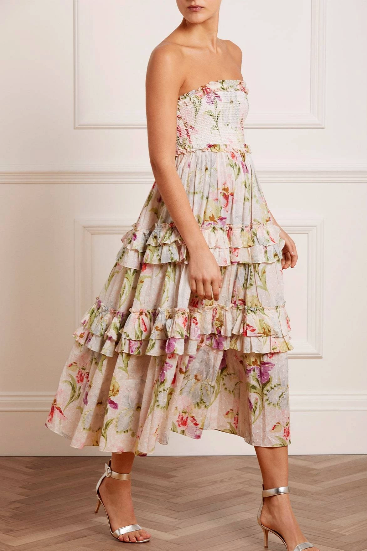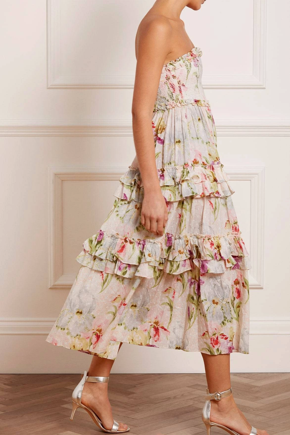 NEEDLE & THREAD EXCLUSIVE. The Iris Cotton Smocked Bandeau Ballerina Dress in Moonshine. Beautifully adorned with oversized iris flowers, ditsy blooms and lace-inspired motifs, creating a statement artwork. Designed with an elasticated smocked bodice for comfort and pretty detailing. This bandeau design has a generous full skirt and a subtle weave texture. Make an effortless statement at your next event.