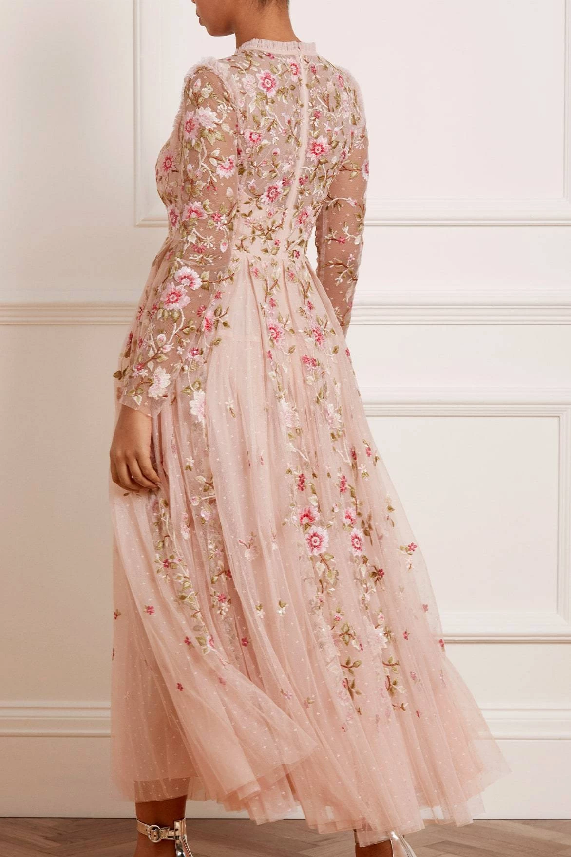 The Lillian Rose Ankle Gown in Petal Pink. This beautiful dress is inspired by a floral artwork taken from an intricate Victorian fan. Crafted elaborately with layers of tulle and net, creating a romantic silhouette with sheer, elegant sleeves. Decorated with embroidered trailing rose motifs, engineered throughout in rich pinks. Make space in your wardrobe for the Lillian.