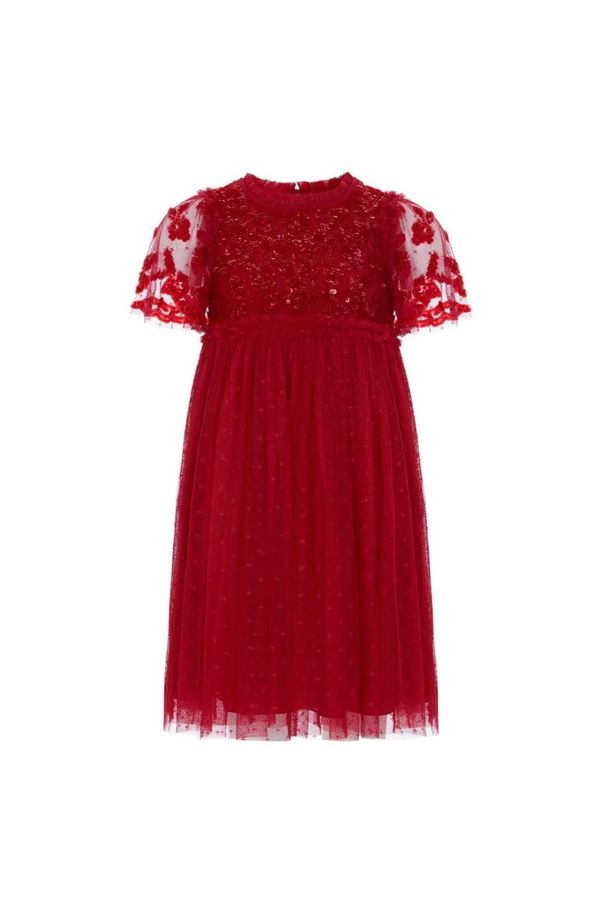 NEW SEASON | NEEDLE & THREAD EXCLUSIVE. The Lilybelle KIDS Dress in Deep Red. This dress is beautifully embellished with tonal sequins scattered across the bodice. An intricately designed style with tulle trims around the neck and waistline, featuring a multi-layered frothy tulle skirt to add elegance. Dress her up in the Lilybelle for any occasion.