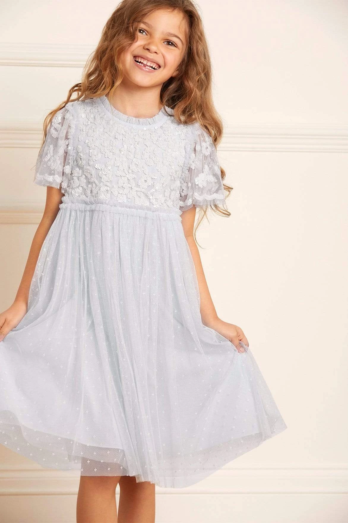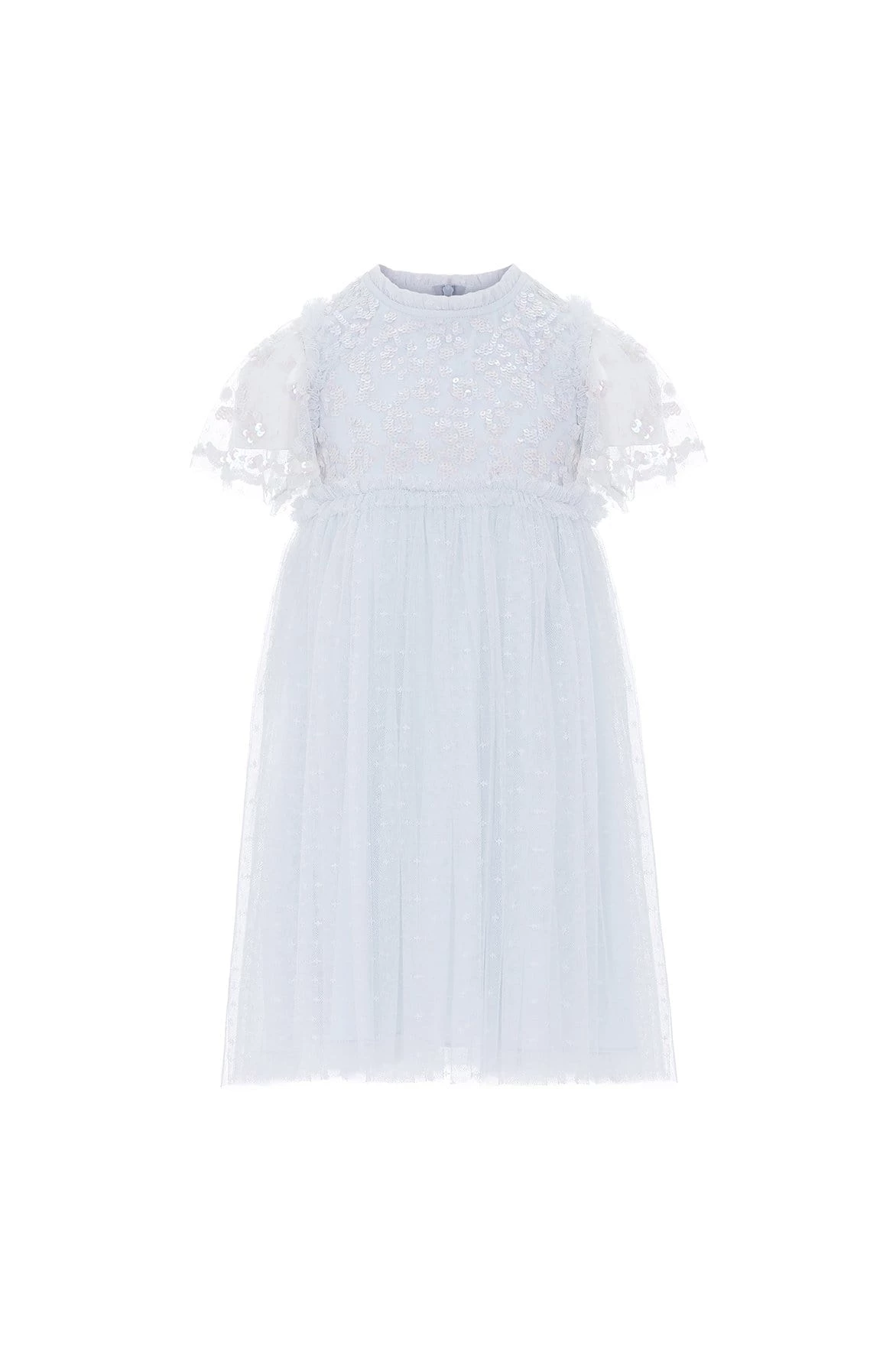 NEW SEASON | The Lilybelle KIDS Dress in Ice Blue. This dress is beautifully embellished with tonal sequins scattered across the bodice. An intricately designed style with tulle trims around the neck and waistline, featuring a multi-layered frothy tulle skirt to add elegance. Dress her up in the Lilybelle for any occasion.