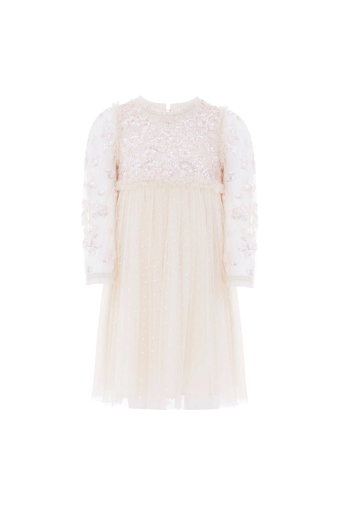 NEW SEASON | NEEDLE & THREAD EXCLUSIVE. The Lilybelle Long Sleeve KIDS Dress in Champagne / Pink. This long sleeve dress is beautifully embellished with tonal sequins scattered across the bodice. Intricately designed with tulle trims around the neck and waistline. Featuring a multi-layered frothy tulle skirt, adding a pretty, playful texture. Dress her up in the Lilybelle for any occasion.