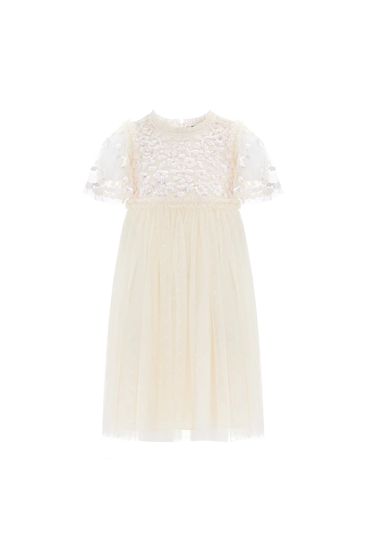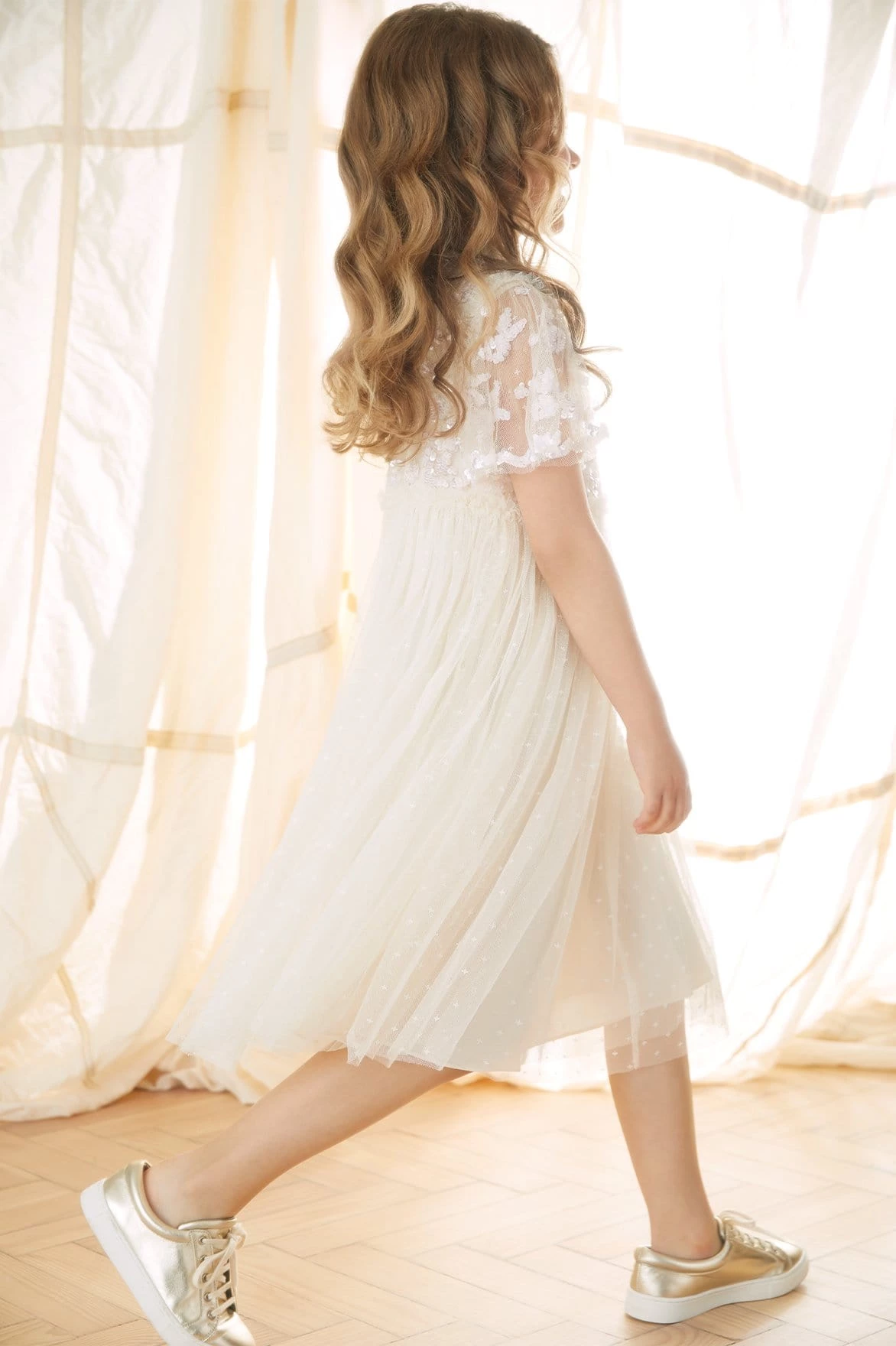 The Lilybelle KIDS Dress in Champagne/ Pink. This dress is beautifully embellished with tonal sequins scattered across the bodice. Intricately designed with tulle trims around the neck and waistline. Featuring a multi-layered frothy tulle skirt, adding an elegant texture. Dress her up in the Lilybelle for any occasion.