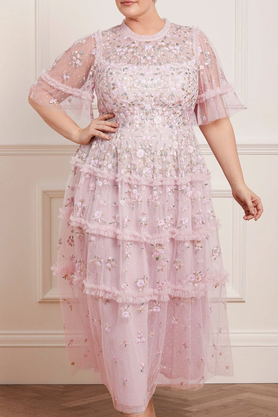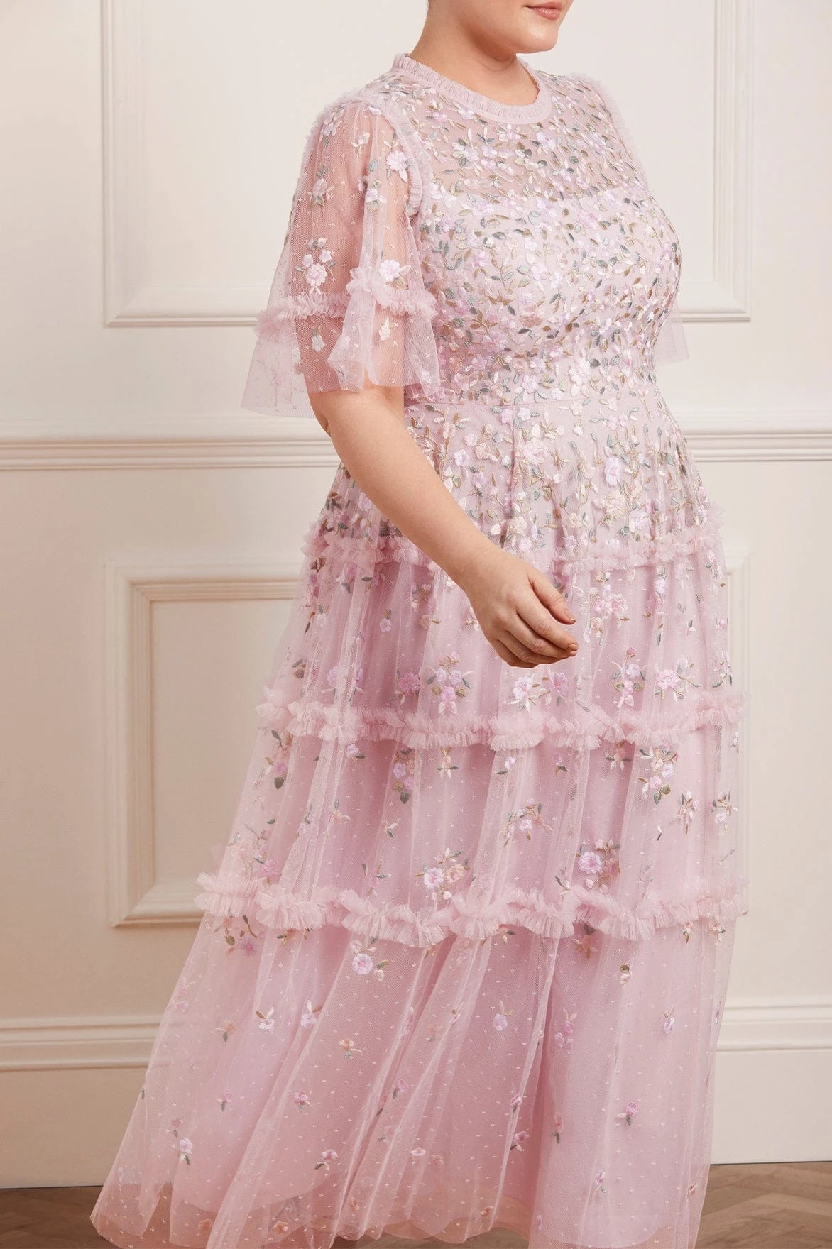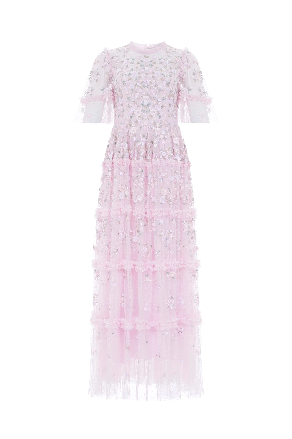 The Martha Ditsy Ankle Gown in Wisteria / Pale Pink. This ankle gown is delicately embroidered with floral motifs in soft tones, with a beautiful scattered layout. Designed with romantic sleeves featuring pretty tulle ruffles. The perfect gown for every occasion.