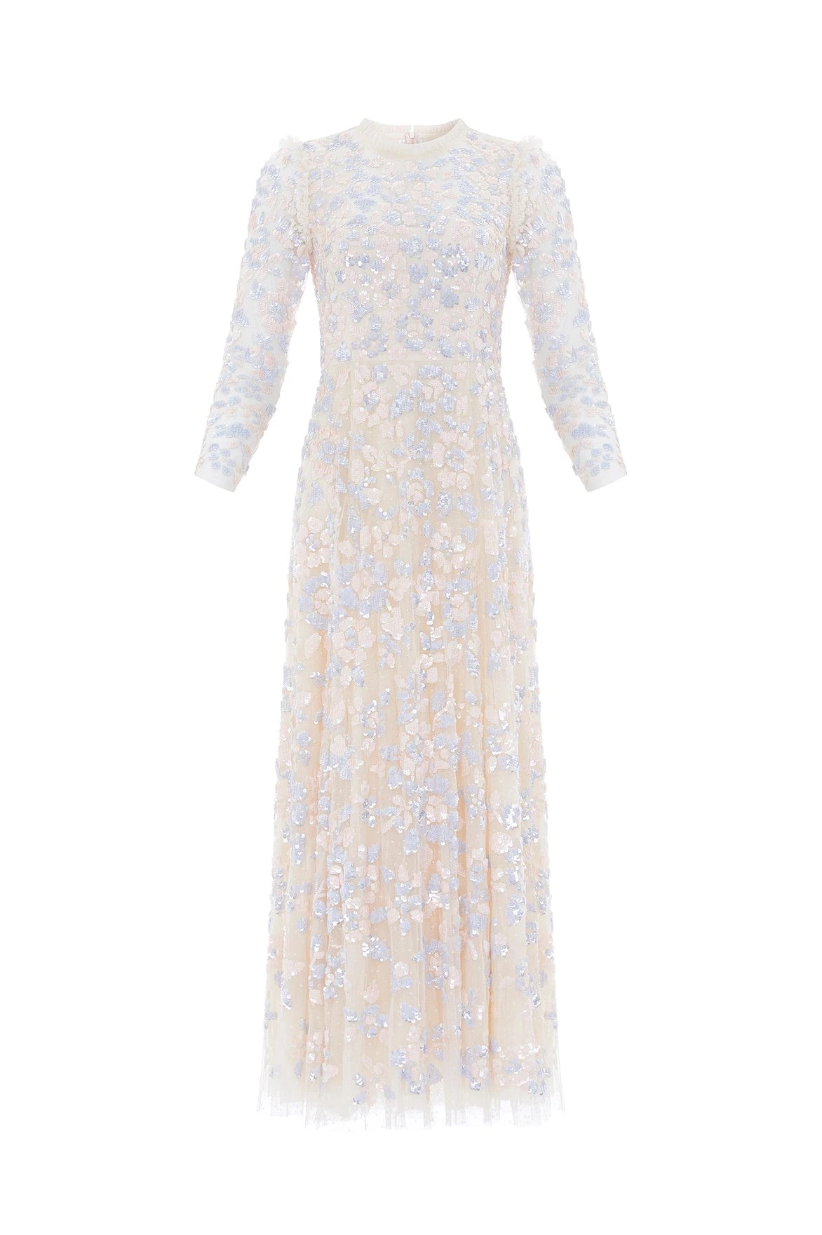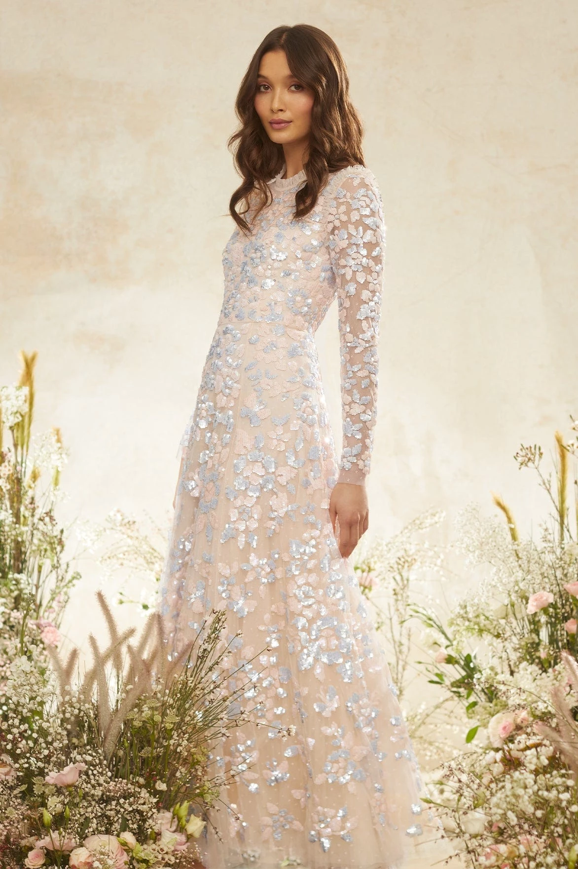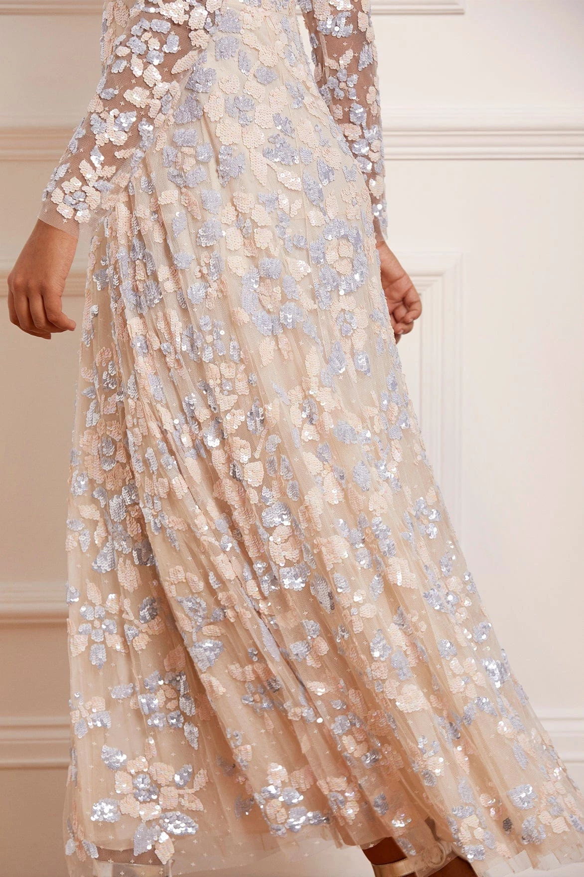 The Mary Rose Ankle Gown in Champagne / Blue Multi. This romantic gown features a two tone floral sequin design creating a statement artwork. Beautifully crafted with a flattering silhouette. A net underlayer helps to shape this elegant piece. A truly show-stopping gown.