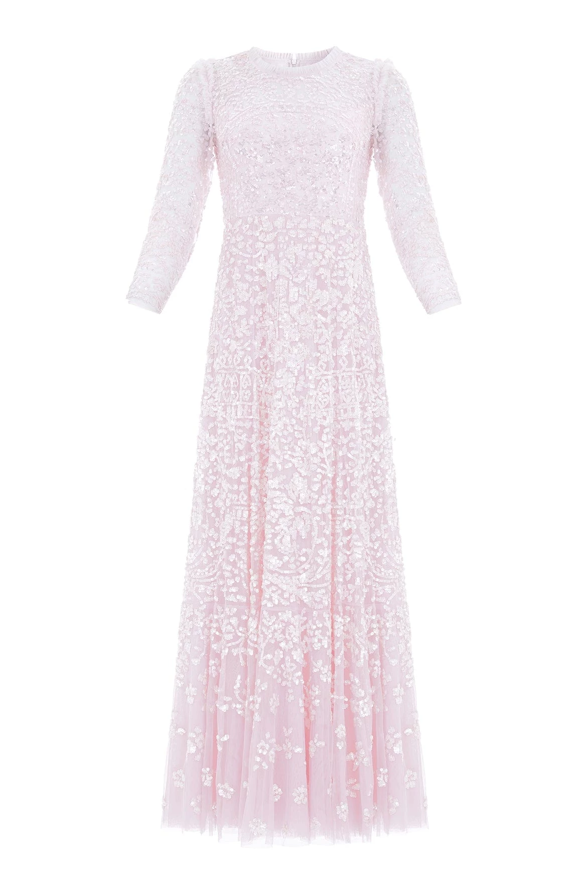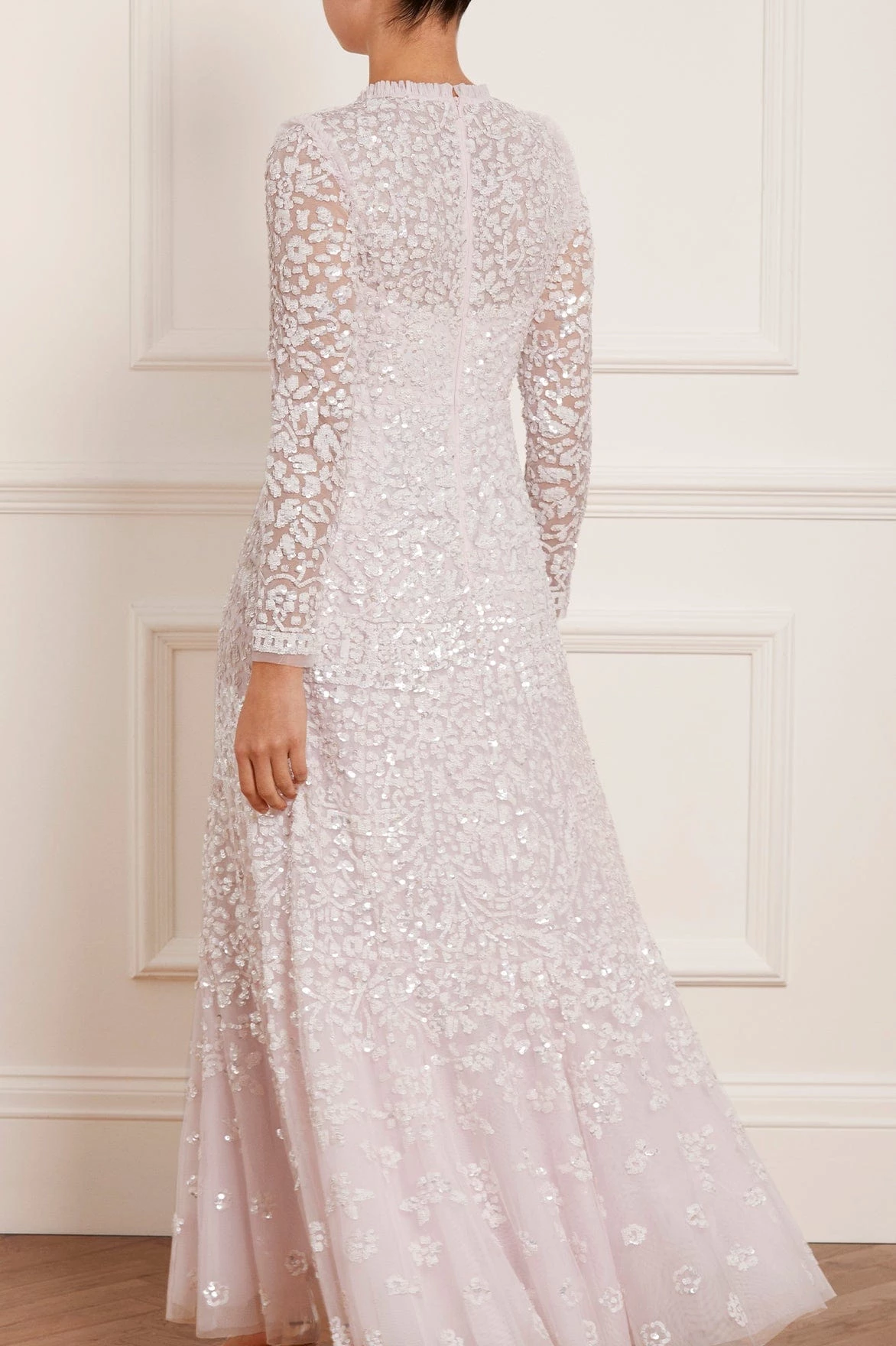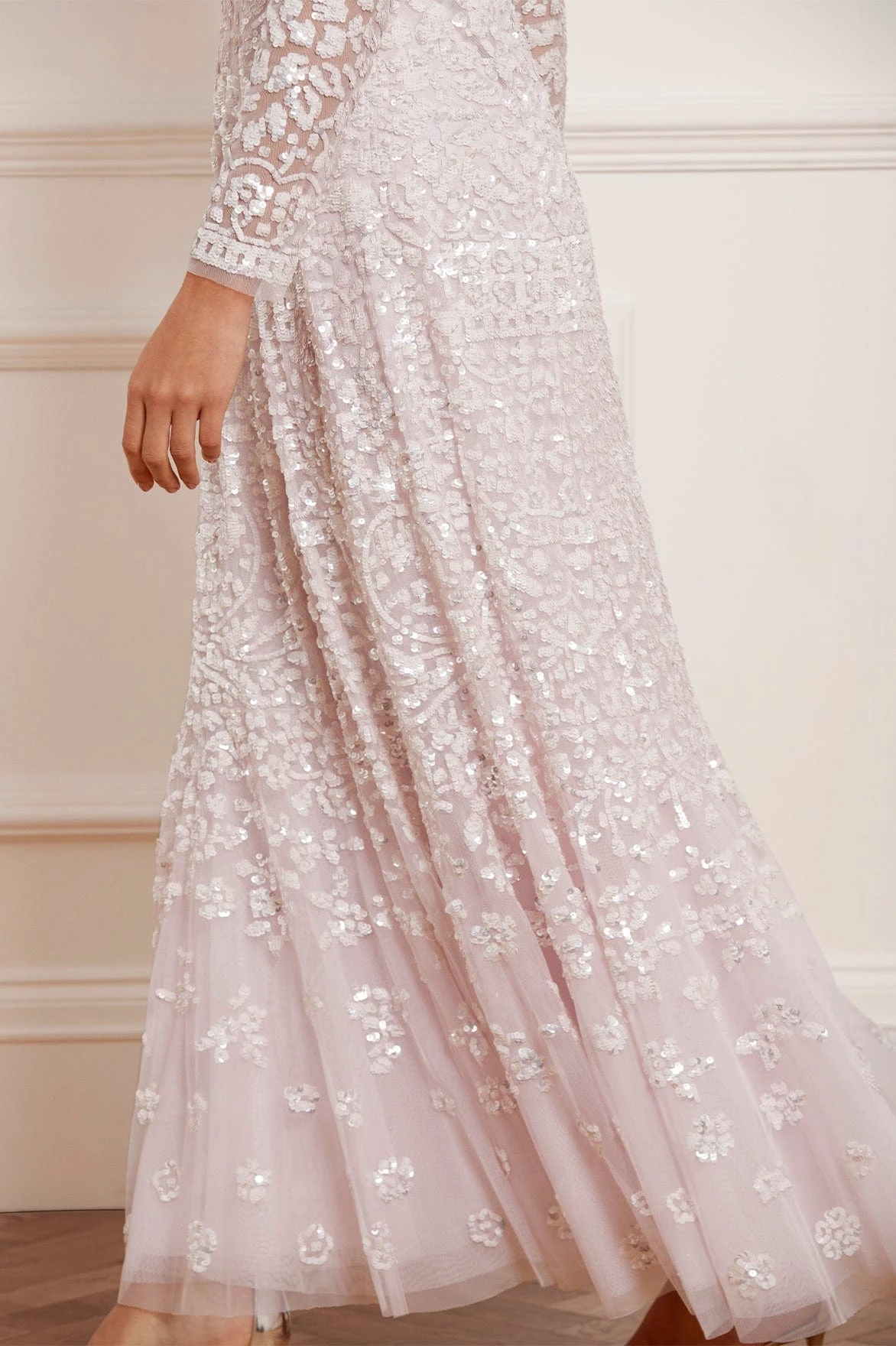 NEW SEASON. The Amaryllis Gown in Powder Pink/White. This embellished gown has a fluid floral artwork design with shimmering white sequins. Beautifully crafted with tulle details and a voluminous skirt to create added movement as you walk. Make a statement in the Amaryllis at your next event.