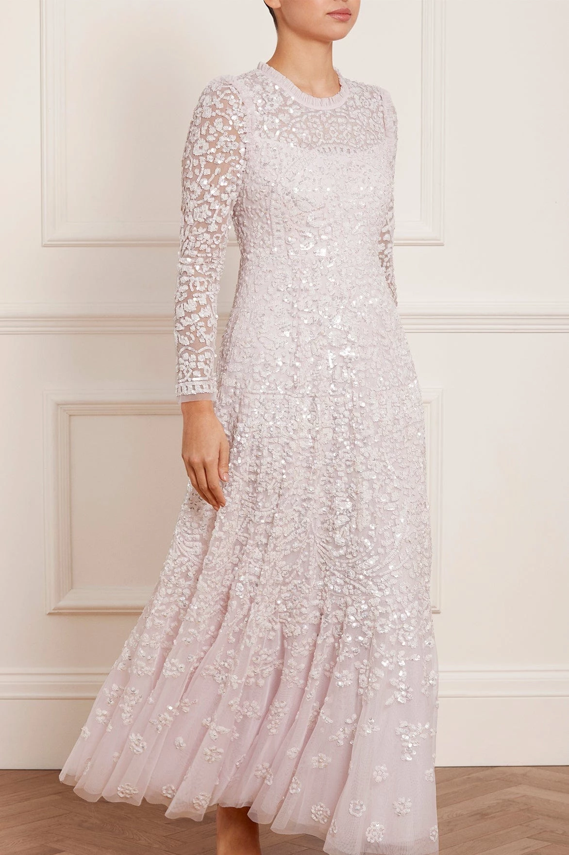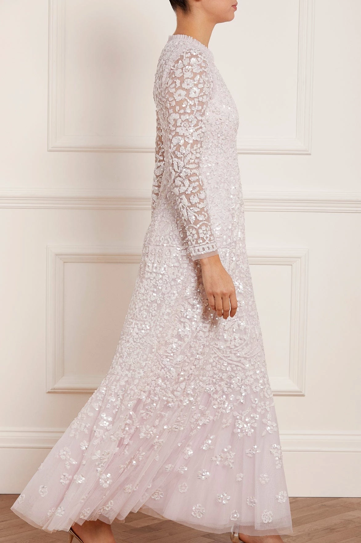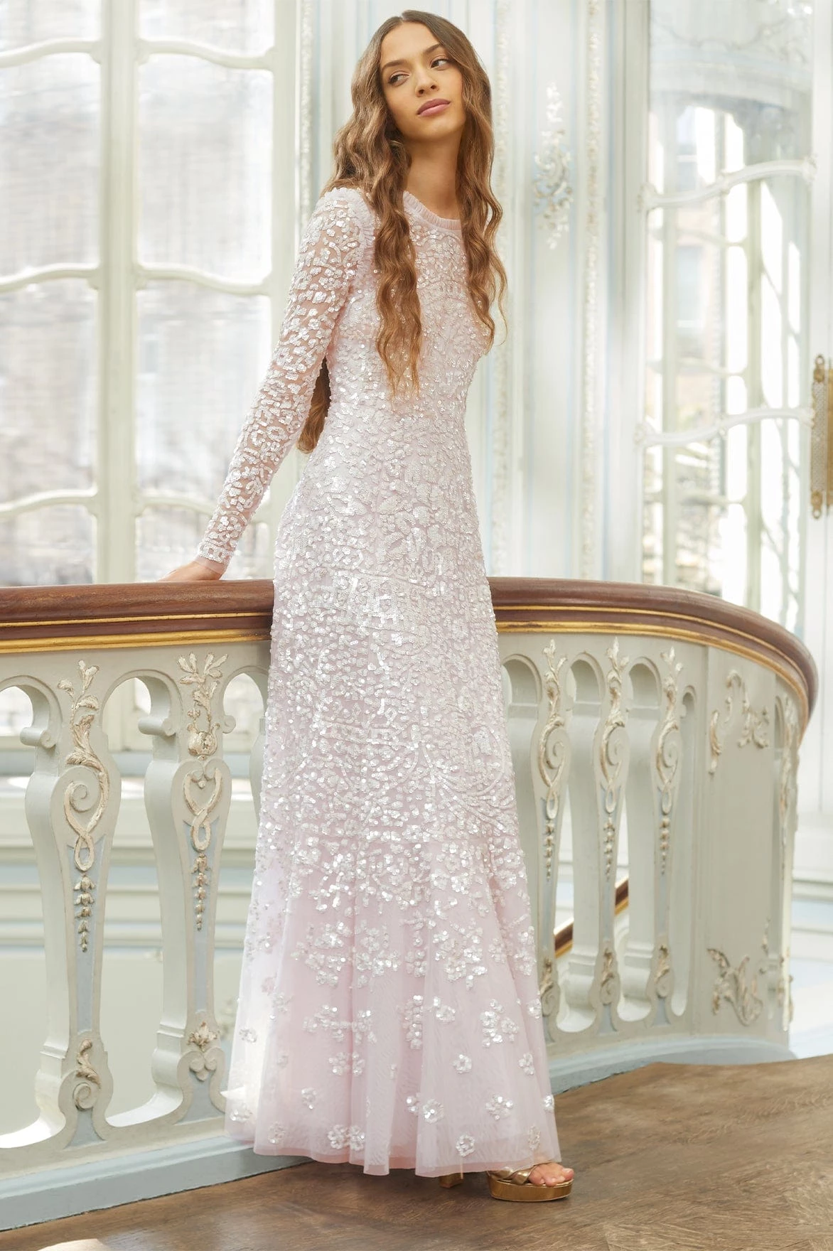 NEW SEASON. The Amaryllis Gown in Powder Pink/White. This embellished gown has a fluid floral artwork design with shimmering white sequins. Beautifully crafted with tulle details and a voluminous skirt to create added movement as you walk. Make a statement in the Amaryllis at your next event.