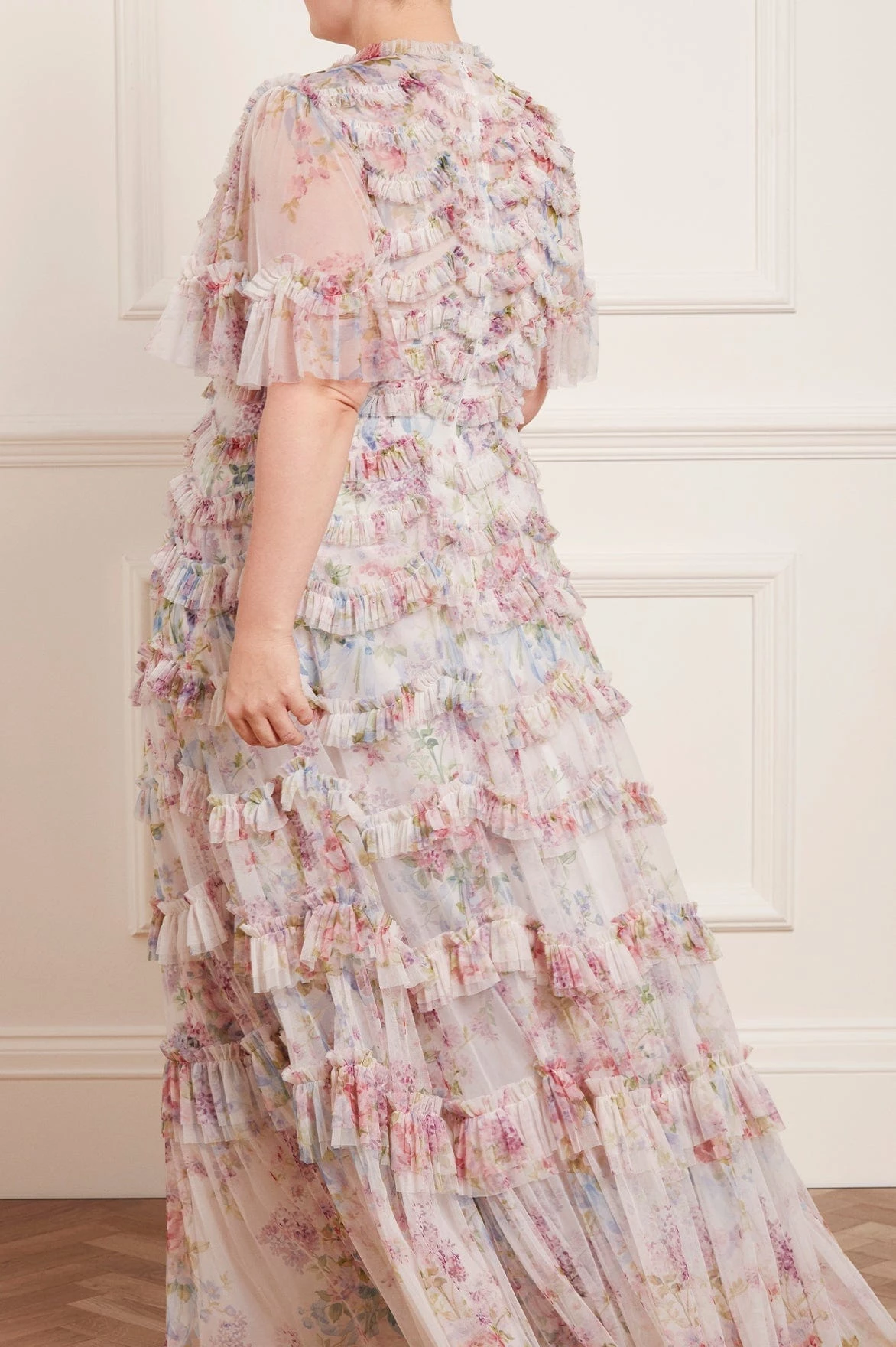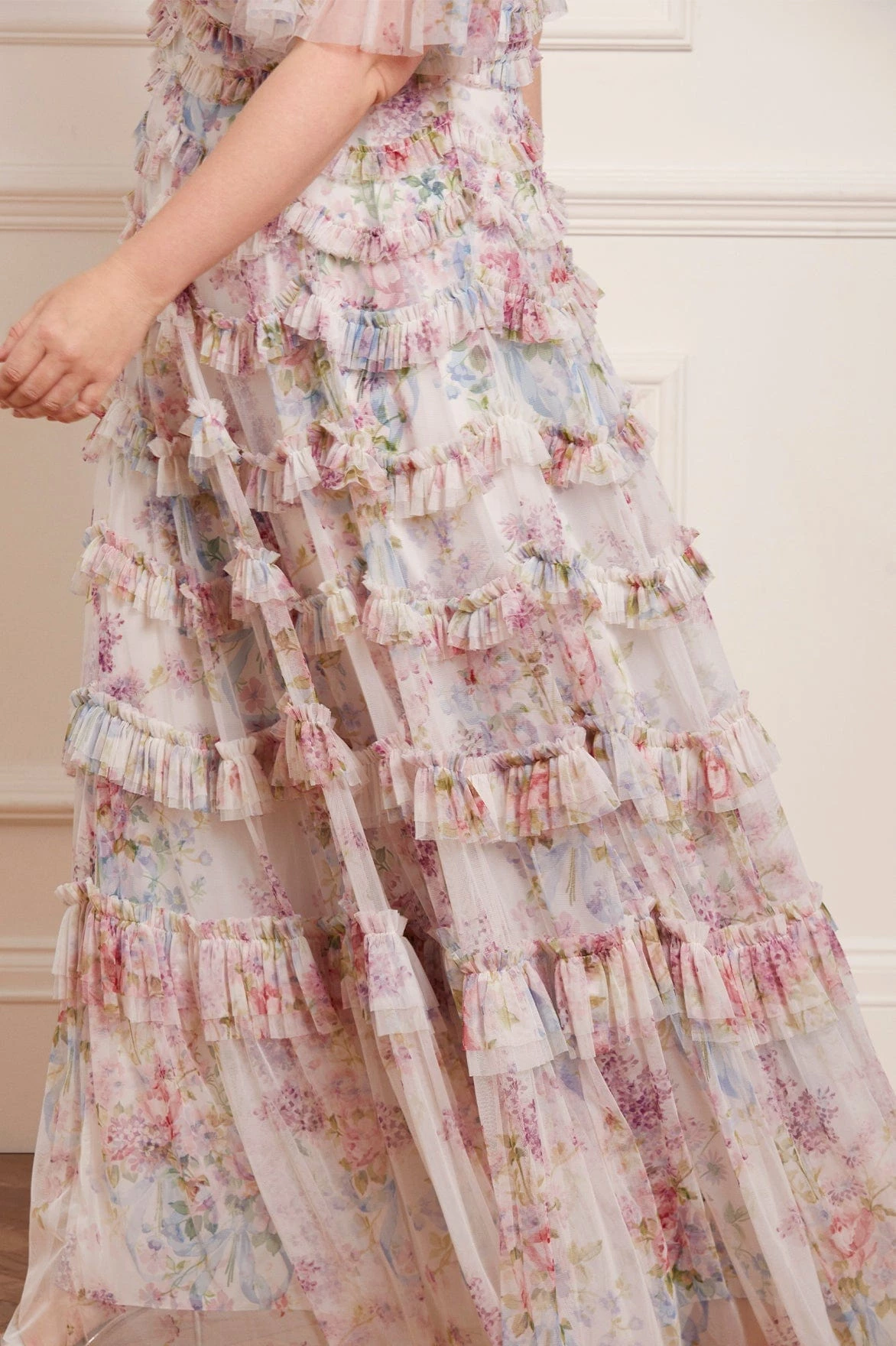 NEW SEASON. The Floral Wonder Ruffle Gown in Moonshine. This gown features a floral bouquet print taken from a 1900’s hand painted artwork. Beautifully designed using tulle scallop detailing, creating pretty textured frills. This statement style has floaty sleeves and a flattering silhouette, creating a romantic look. The perfect gown for every occasion.