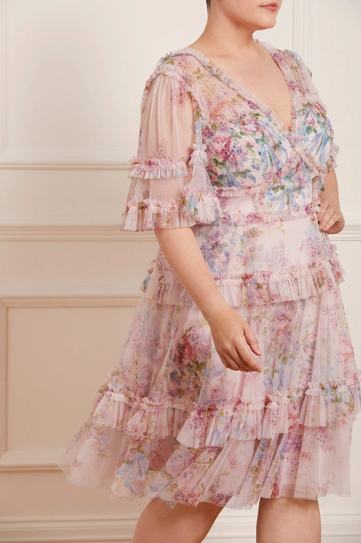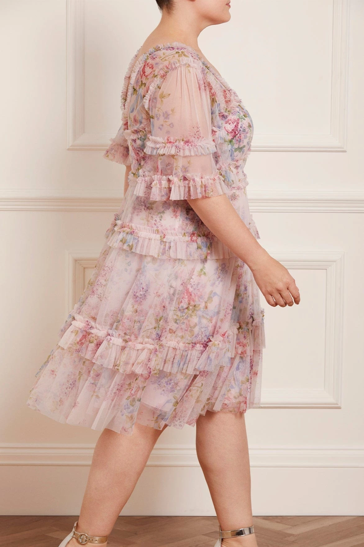 -Floral printed tulle with tulle ruffles