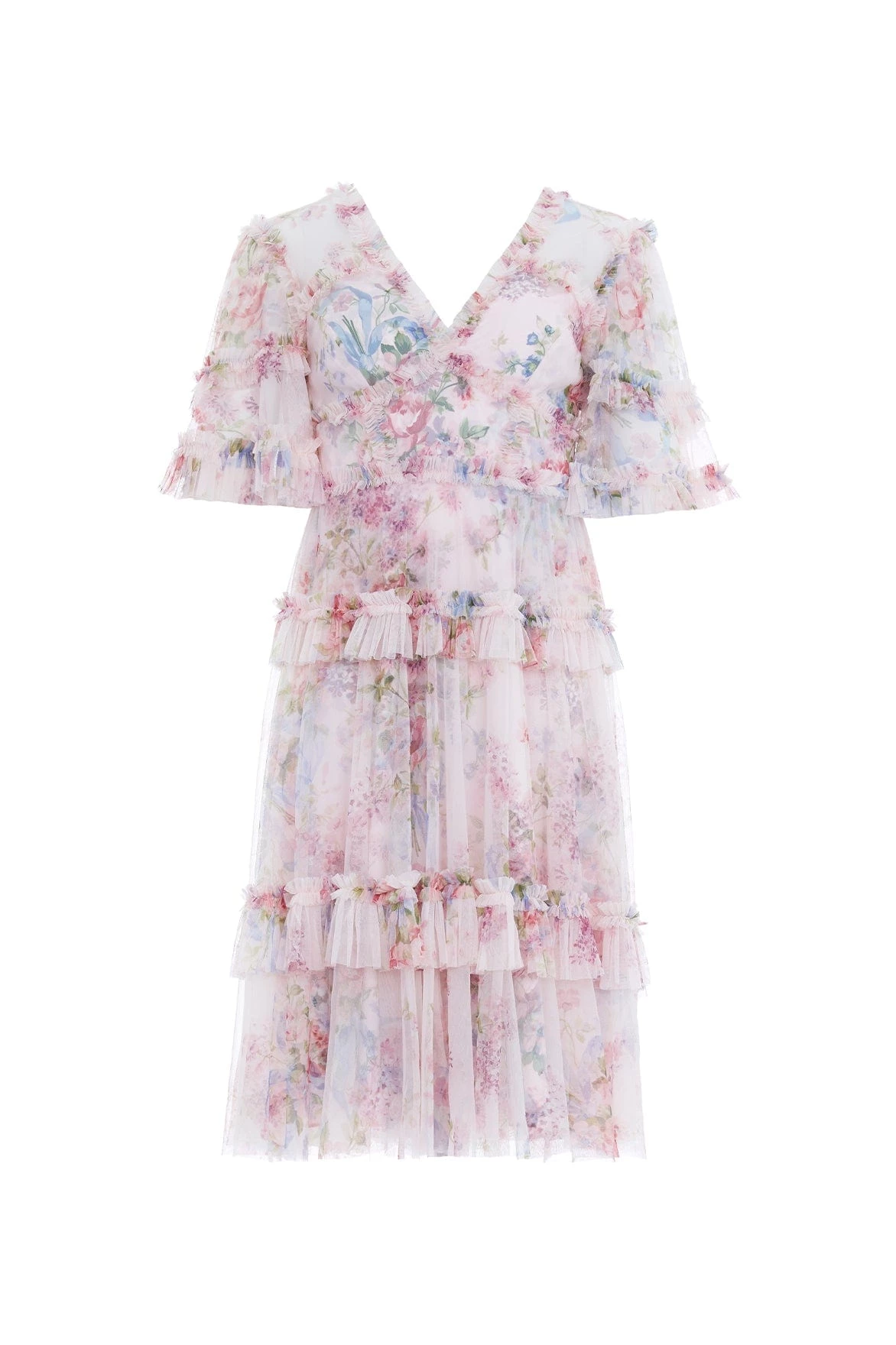 NEW SEASON. The Floral Wonder V-Neck Midi Dress in Powder Pink. This midi dress features a pretty floral bouquet print taken from a 1900’s hand painted artwork. This dress is adorned with subtle, signature tulle ruffles and has a flattering silhouette. Crafted with a tulle frill tier skirt adding romantic texture. A truly elegant piece for your upcoming events.