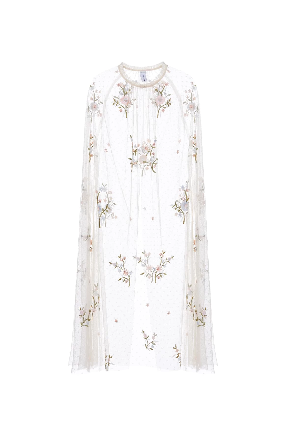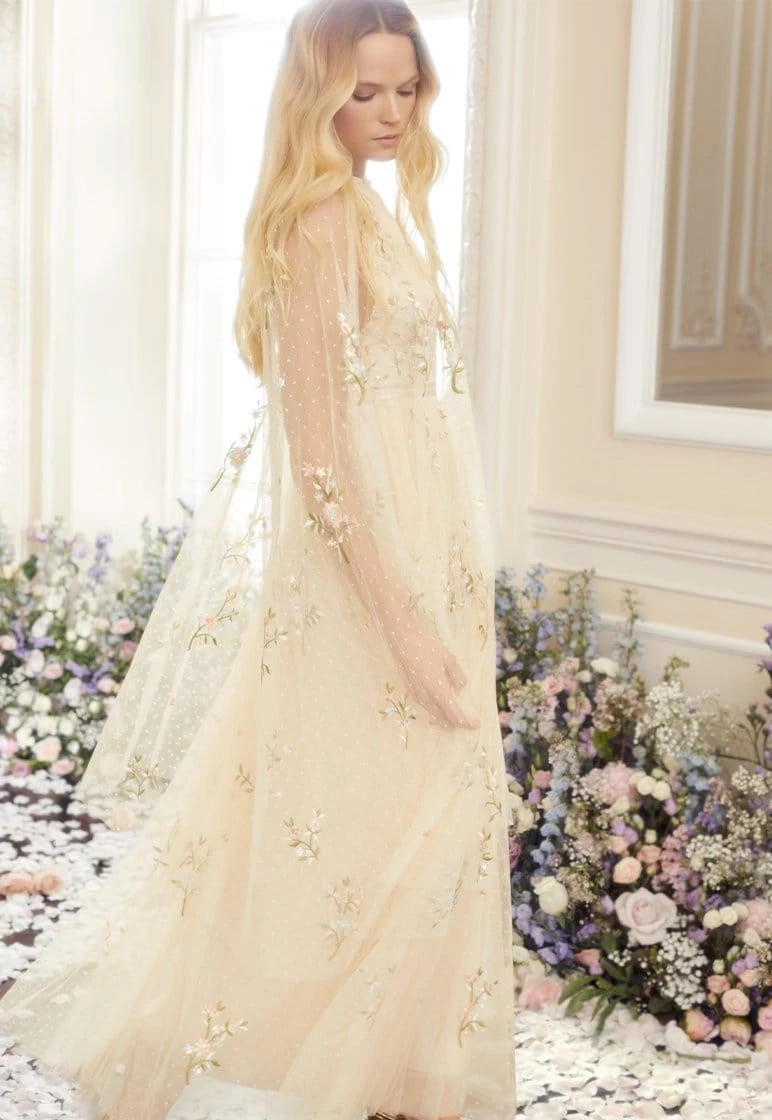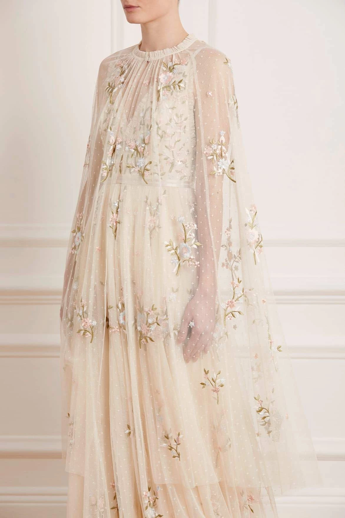 The Petunia Midaxi Cape in Champagne. Inspired by Edwardian vintage artwork, this elegant cape is made up of scattered, richly embroidered bouquets of delicate florals in soft, pastel shades and subtly vibrant green highlights. Shimmering iridescent sequins scattered throughout add a glistening effect to the piece. Intricately cut with fine, delicate tulle ruffle trimming and a relaxed shape, creating a truly romantic silhouette.