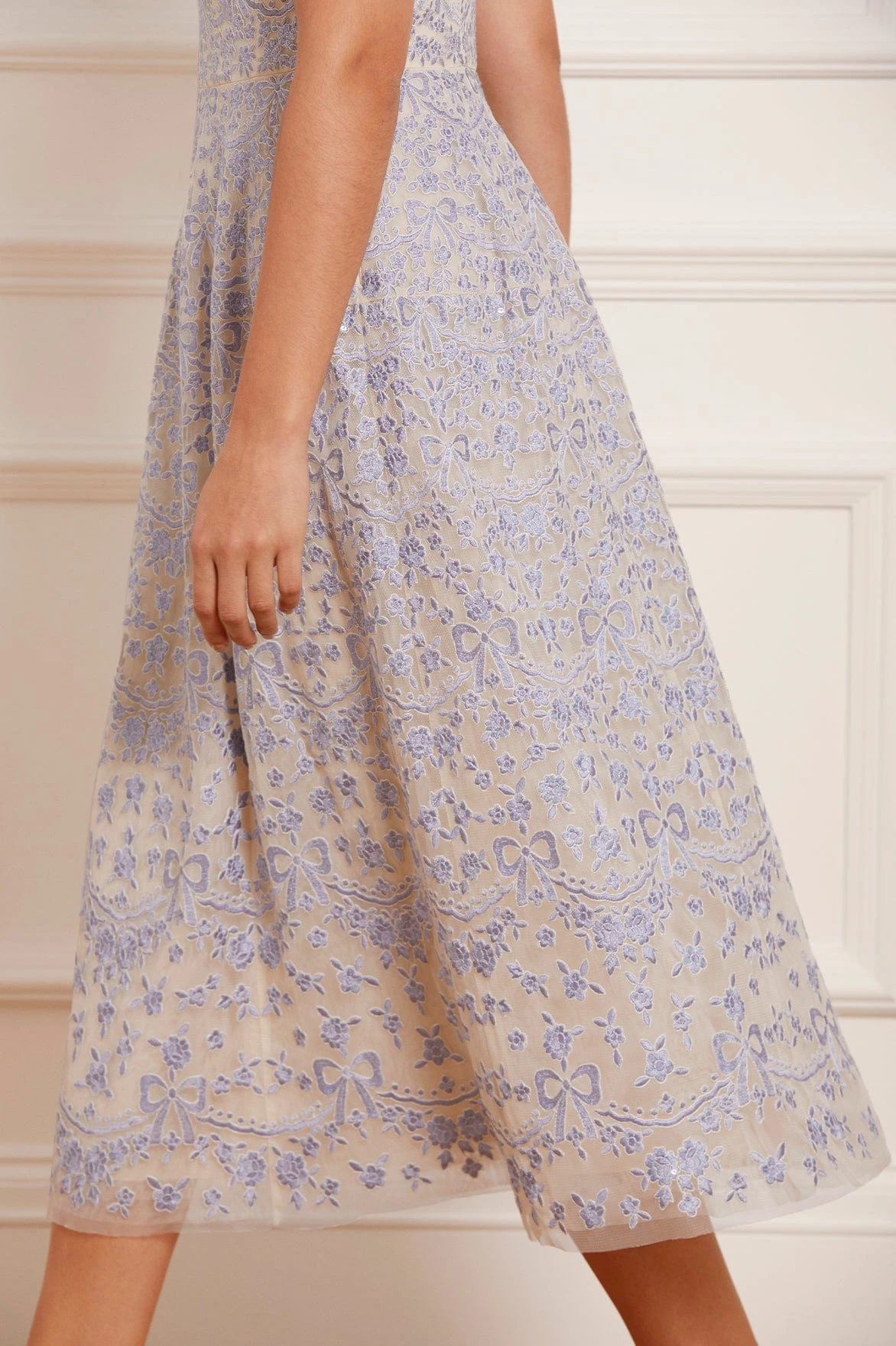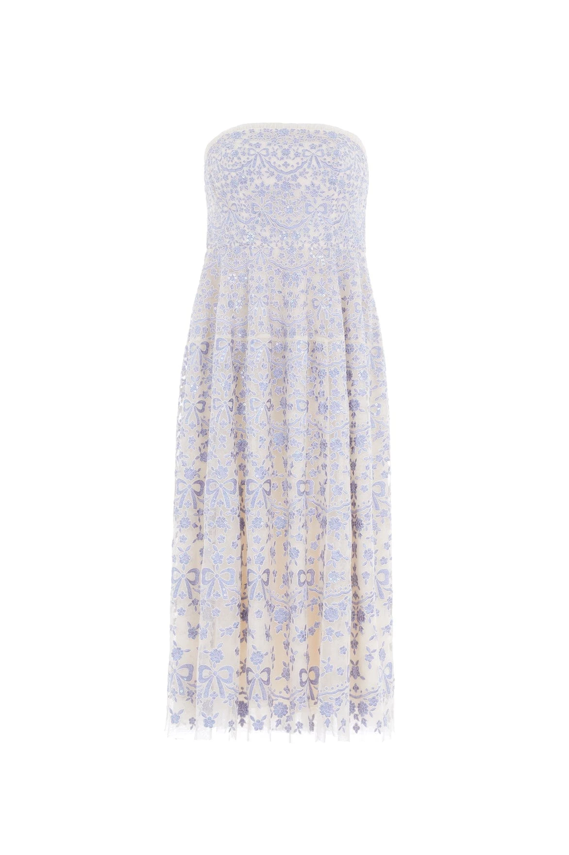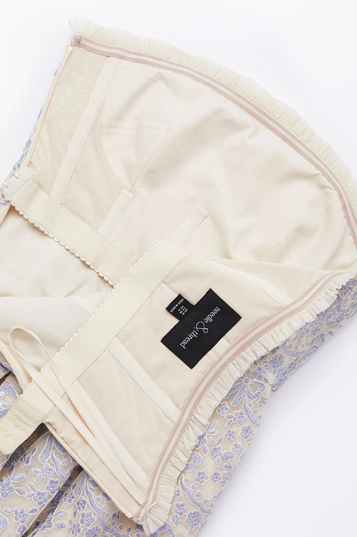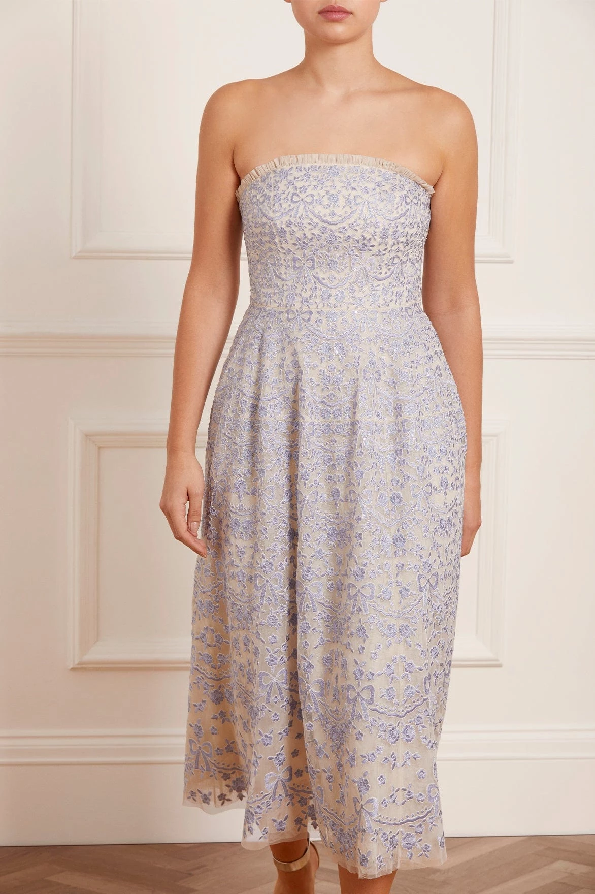 NEW SEASON . The Ribbon Lace Strapless Corset Ballerina Dress in Champagne/Blue. This strapless dress is decorated with floral and ribbon motifs in contrasting thread to create a striking artwork design. The bodice is integrated with a corset, made with ribbon stitching, soft boning, and panels of stretchy mesh fabric for comfort and security in the fit. Beautifully crafted with a flattering skirt shape, inspired by vintage couture styling. This is sure to be a season best-seller.
