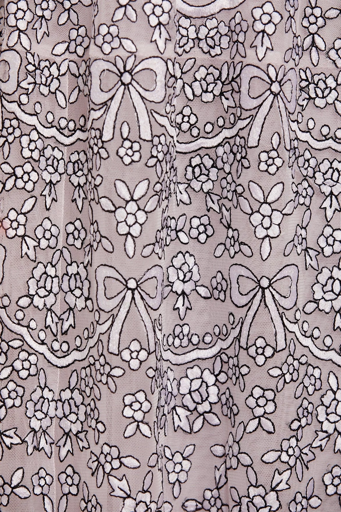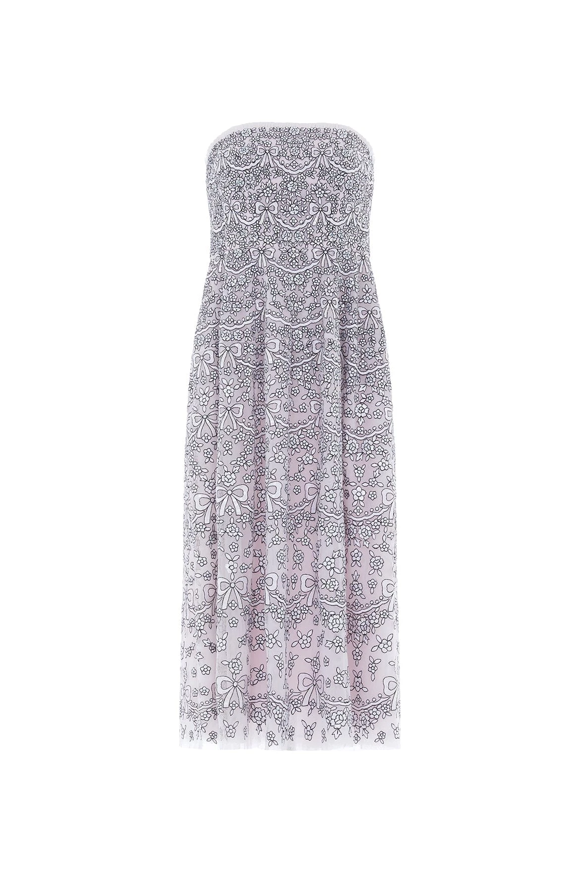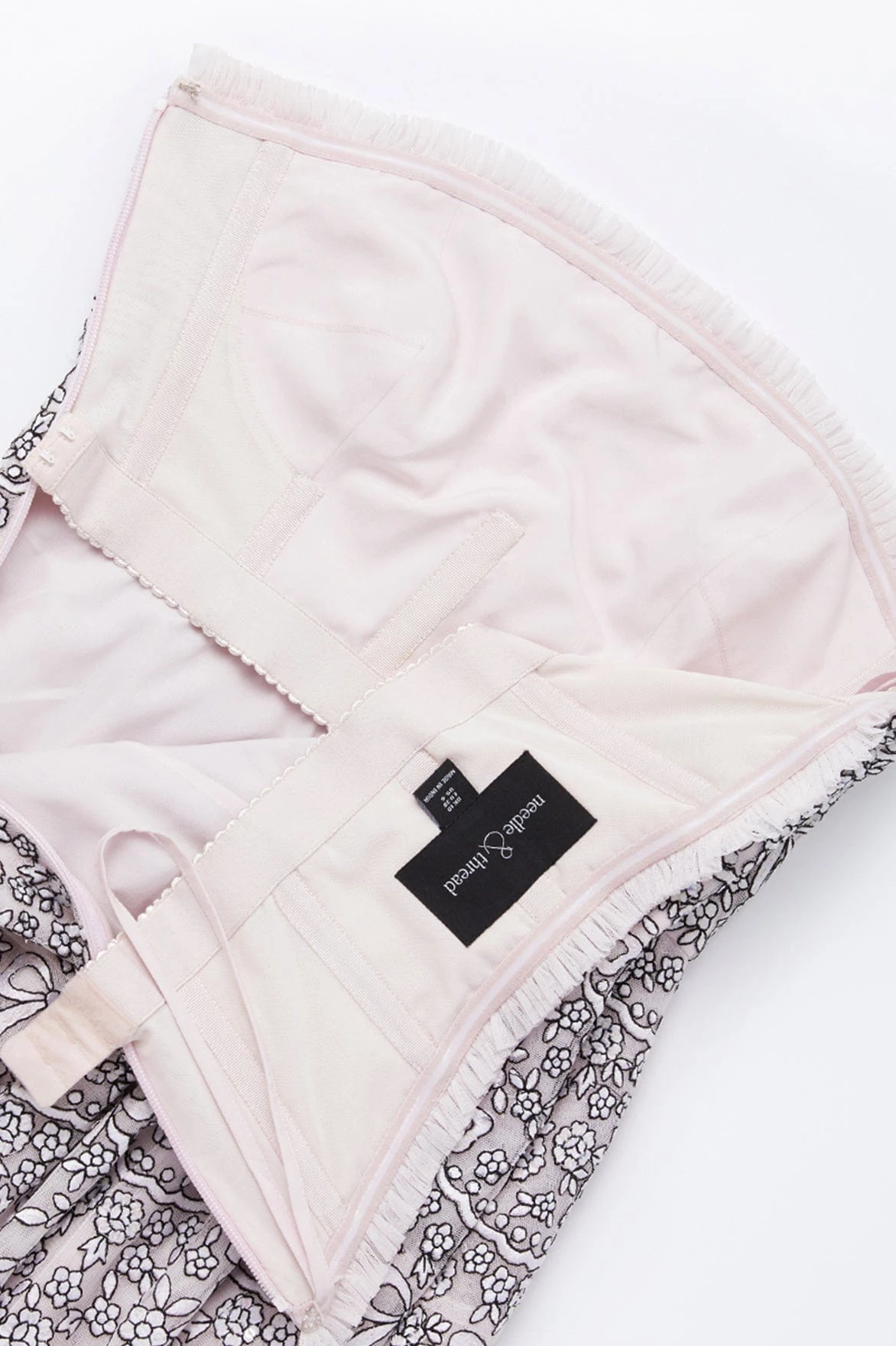 NEW SEASON . The Ribbon Lace Strapless Corset Ballerina Dress in Powder Pink/Monochrome. This strapless dress is decorated with floral and ribbon motifs in contrasting thread to create a striking artwork design. The bodice is integrated with a corset, made with ribbon stitching, soft boning, and panels of stretchy mesh fabric for comfort and security in the fit. Beautifully crafted with a flattering skirt shape, inspired by vintage couture styling. This is sure to be a season best-seller.