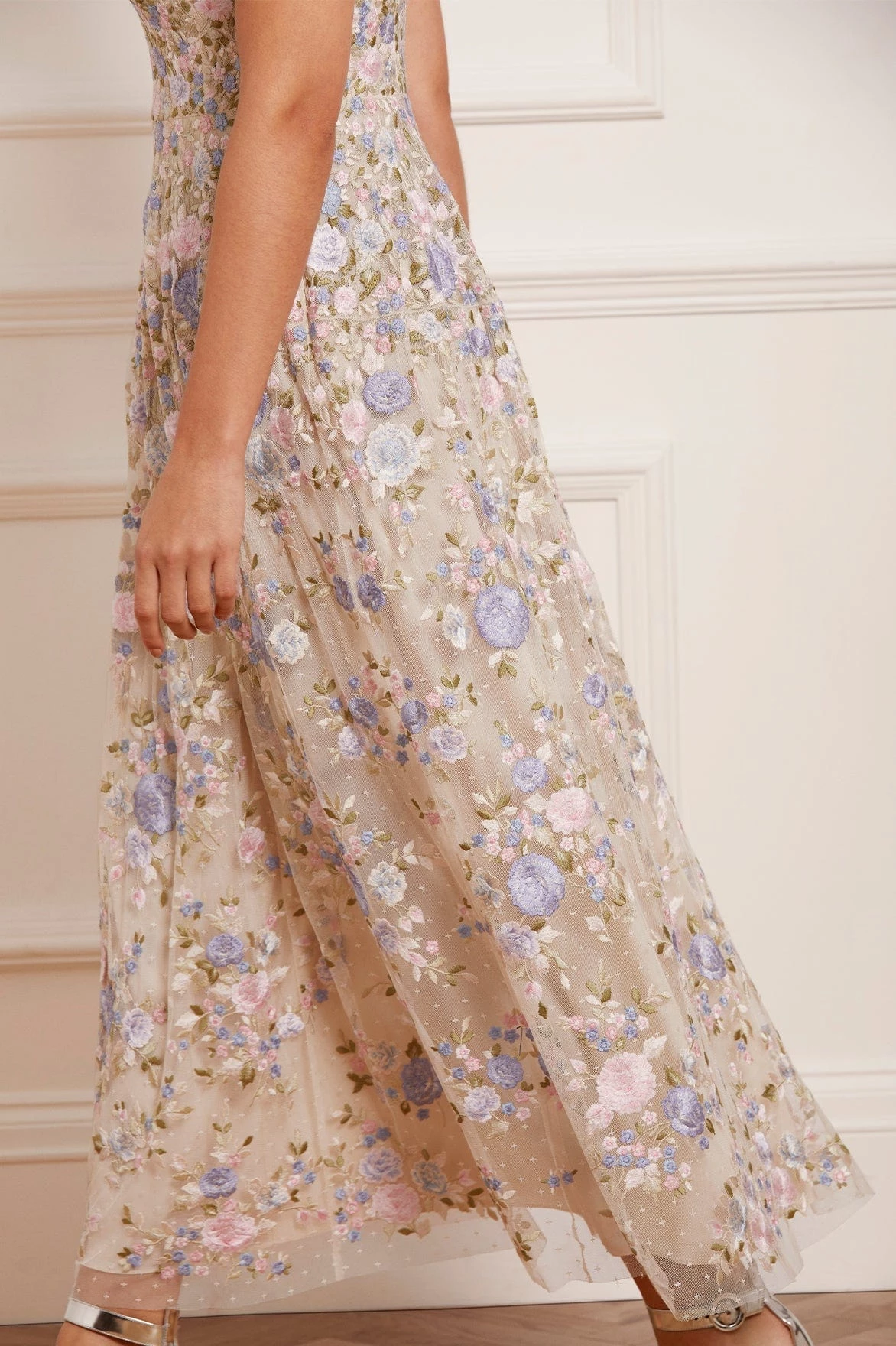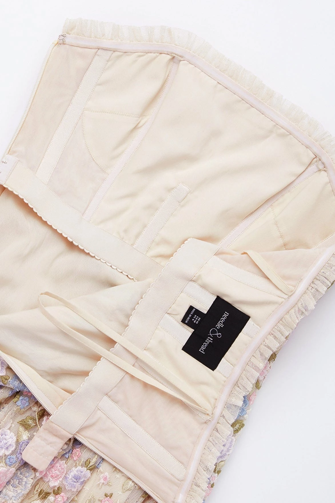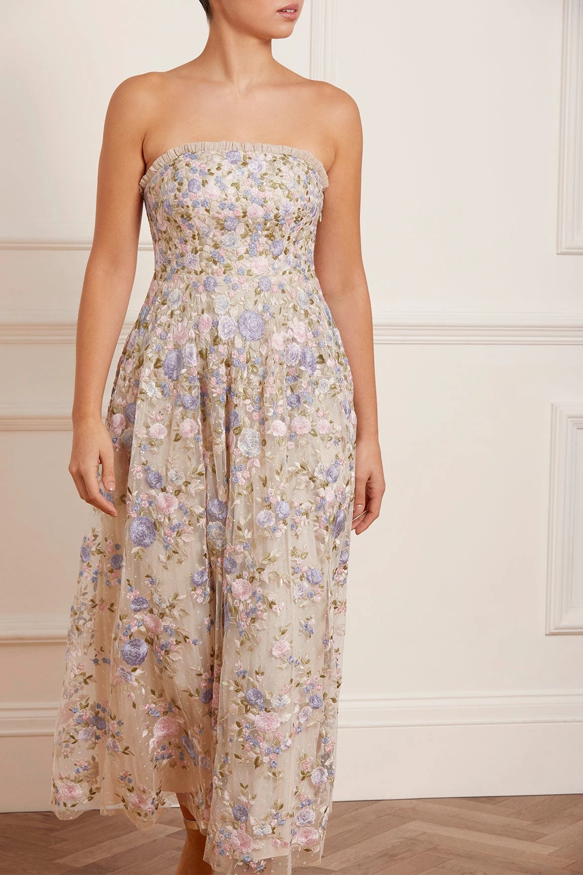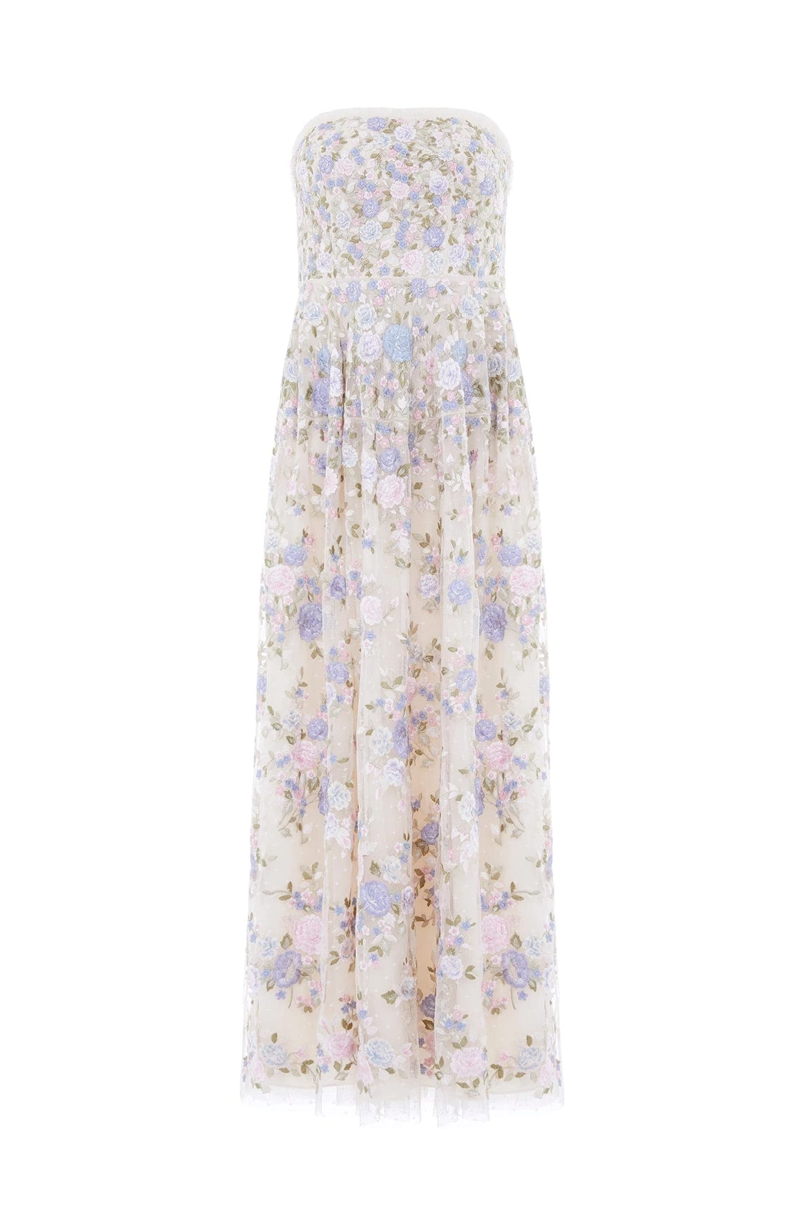 NEW SEASON. The Rose Dream Strapless Corset Ankle Gown in Champagne/Blue Multi. This ankle gown is intricately embroidered with soft clusters of floral motifs in fresh, romantic pastel tones. Beautifully crafted with a flattering skirt shape, inspired by vintage couture styling. The bodice is integrated with a corset made with ribbon stitching, soft boning and panels of stretch mesh fabric for comfort and security in the fit. A true fairytale piece.