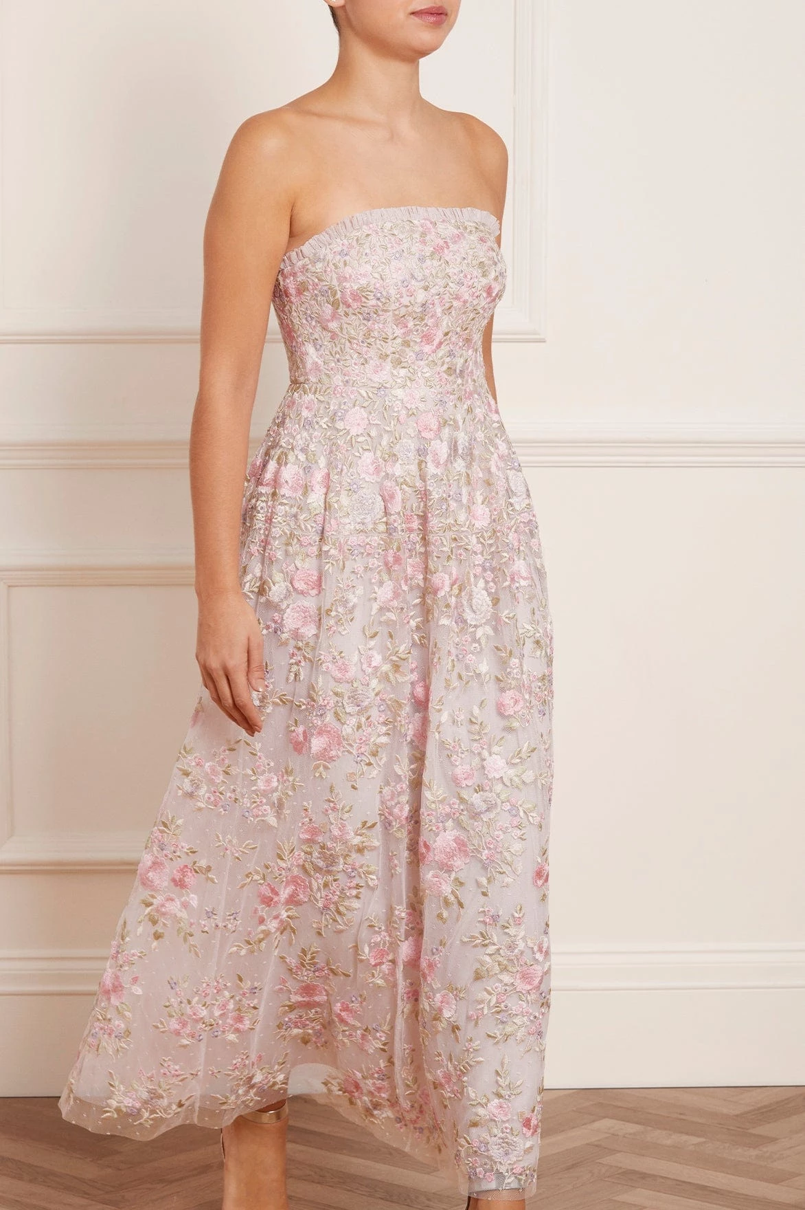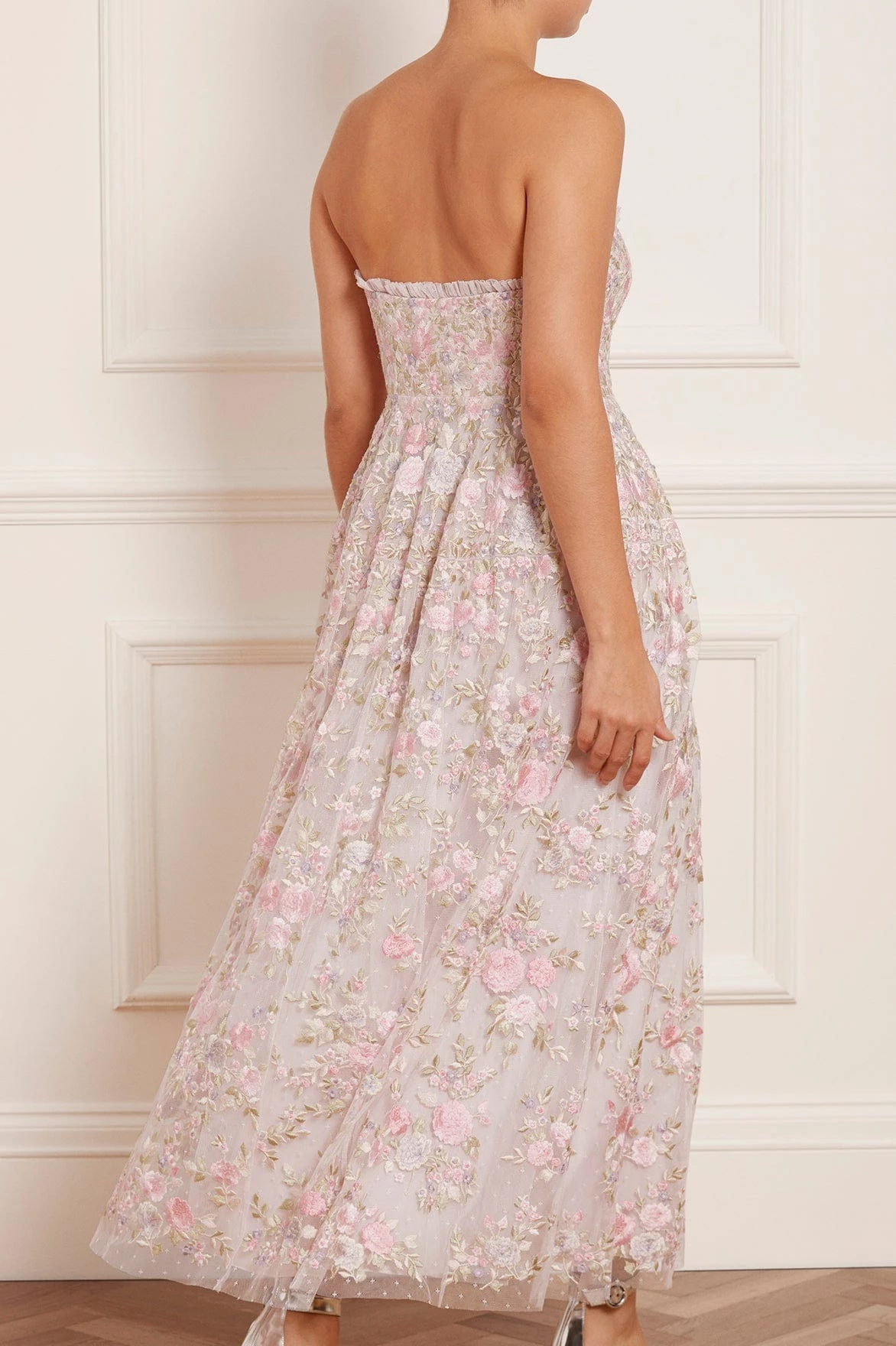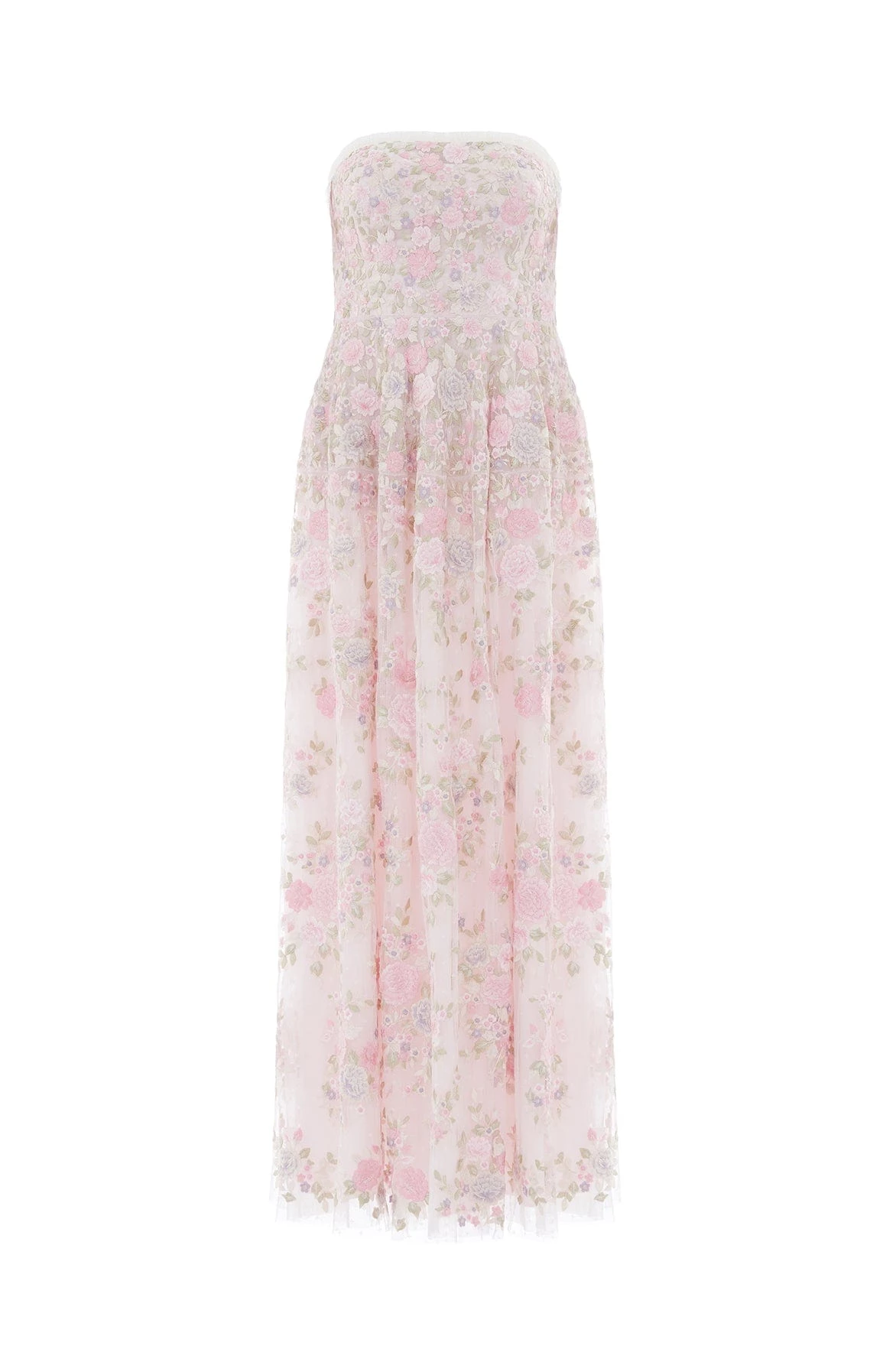 NEW SEASON | NEEDLE & THREAD EXCLUSIVE. The Rose Dream Strapless Corset Ankle Gown in Powder Pink/Pink Multi. This ankle gown is intricately embroidered with soft clusters of floral motifs in fresh, romantic pastel tones. Beautifully crafted with a flattering skirt shape, inspired by vintage couture styling. The bodice is integrated with a corset made with ribbon stitching, soft boning and panels of stretch mesh fabric for comfort and security in the fit. A true fairytale piece.