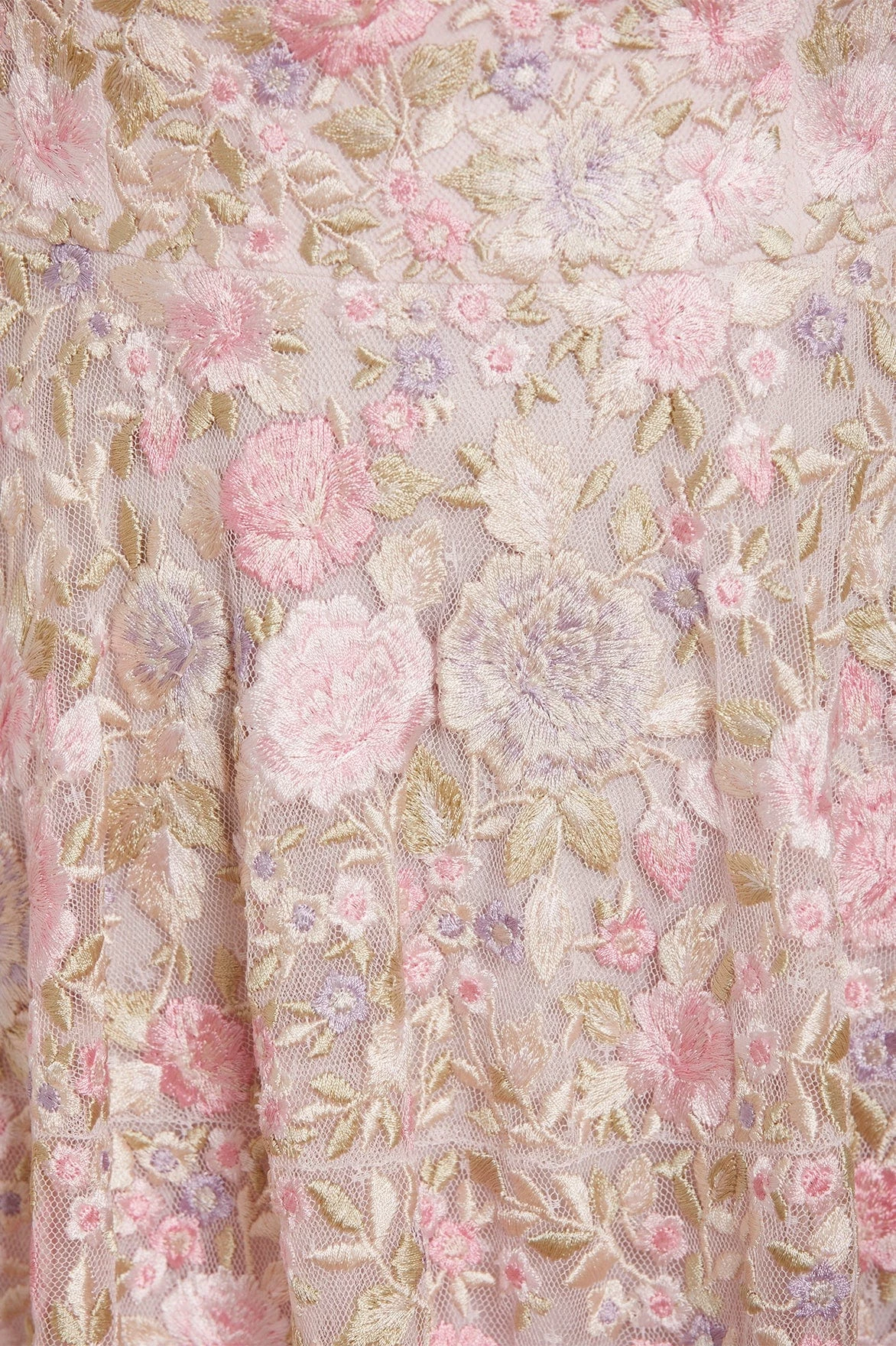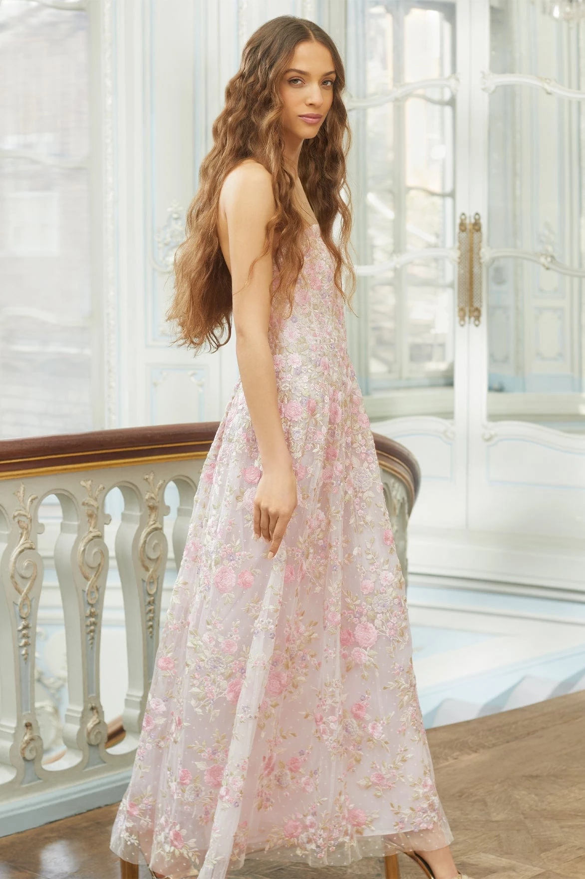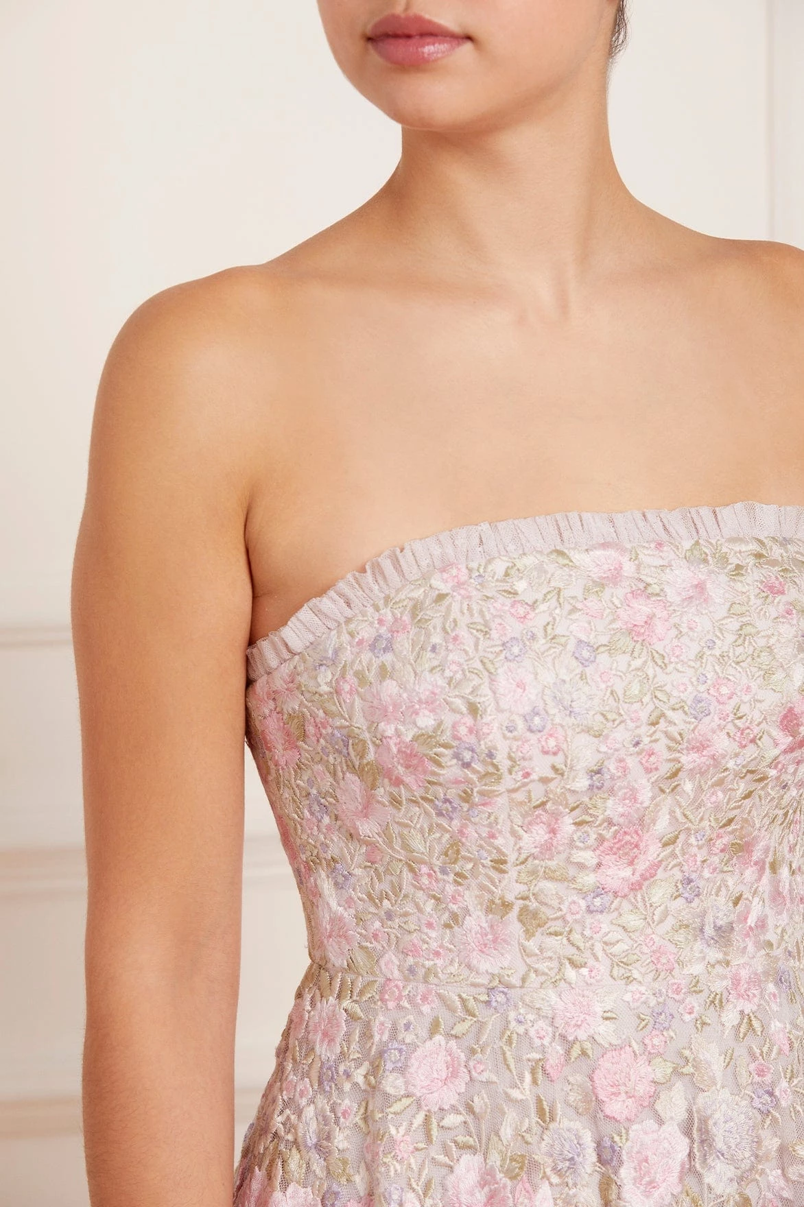 NEW SEASON | NEEDLE & THREAD EXCLUSIVE. The Rose Dream Strapless Corset Ankle Gown in Powder Pink/Pink Multi. This ankle gown is intricately embroidered with soft clusters of floral motifs in fresh, romantic pastel tones. Beautifully crafted with a flattering skirt shape, inspired by vintage couture styling. The bodice is integrated with a corset made with ribbon stitching, soft boning and panels of stretch mesh fabric for comfort and security in the fit. A true fairytale piece.