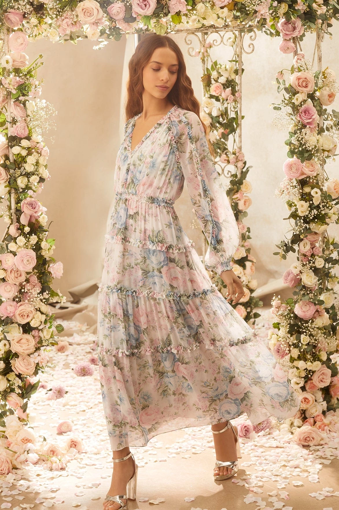 The Rose Fairytale Chiffon V-Neck Day Ankle Gown in Moonshine. This beautifully classic, romantic gown features an all over floral print in whimsical tones of wisteria and powder blue. Developed in a soft, crinkle textured chiffon, with an easy-to-wear silhouette, elasticated waist and gently loose-fitting bodice. Designed with signature Needle & Thread ruffles and detailing throughout. A truly elegant piece.