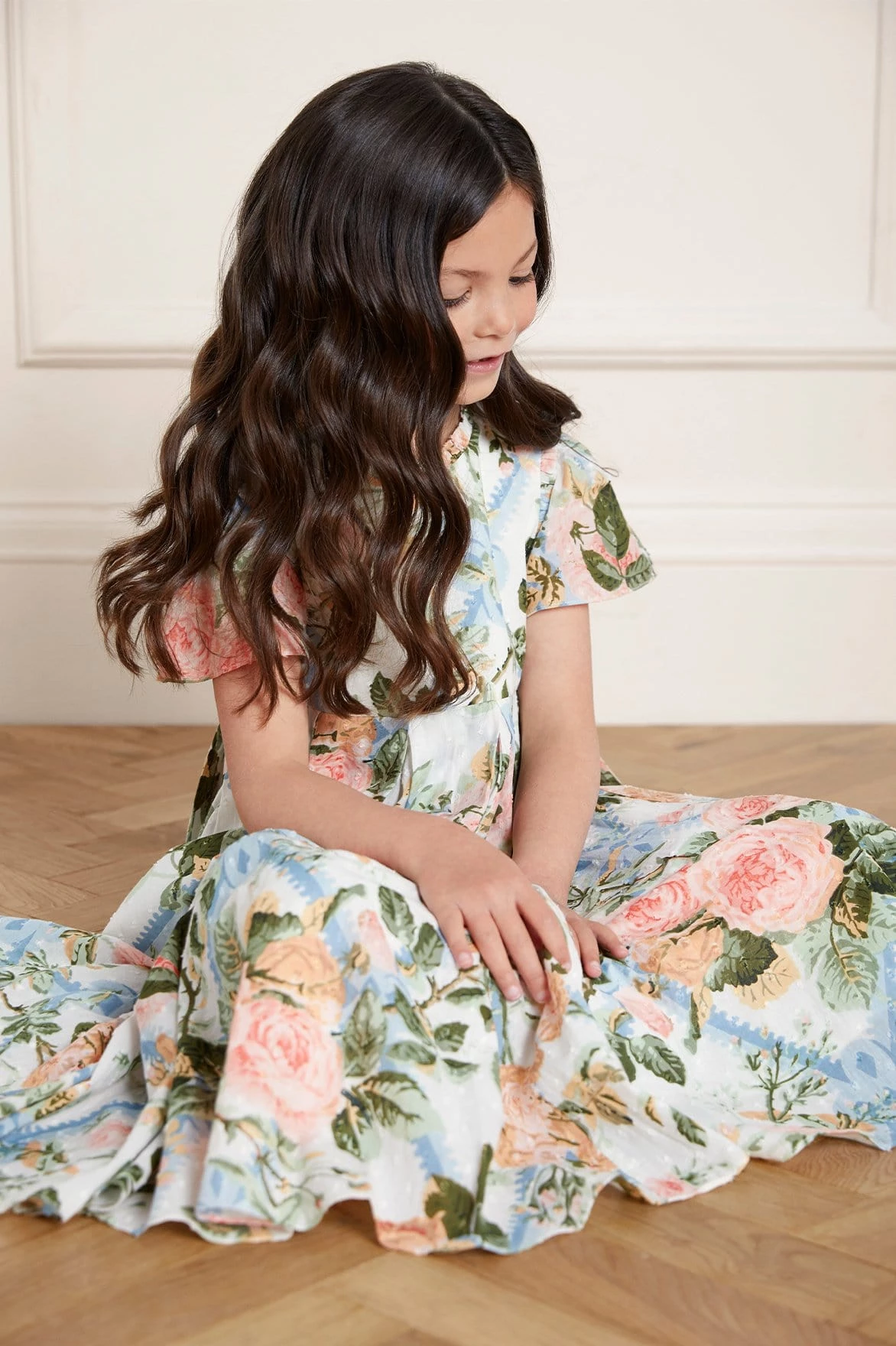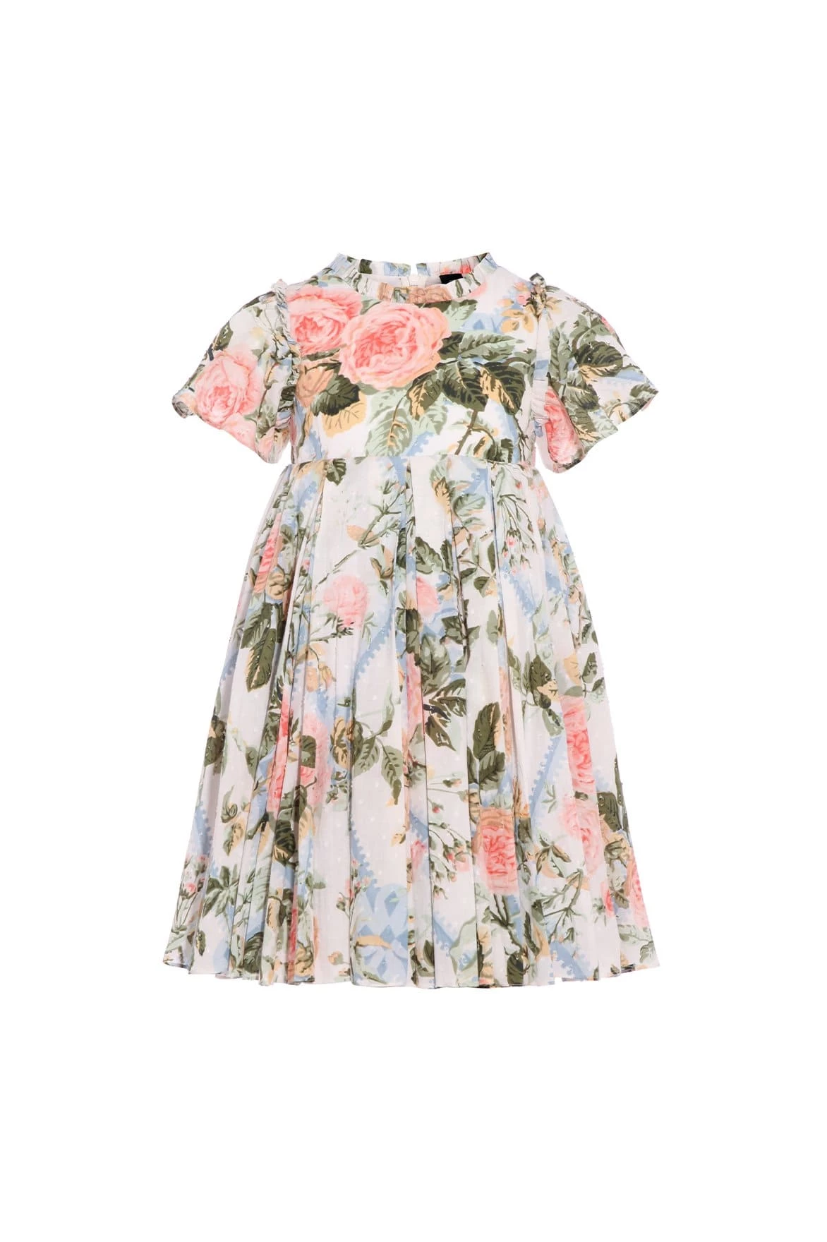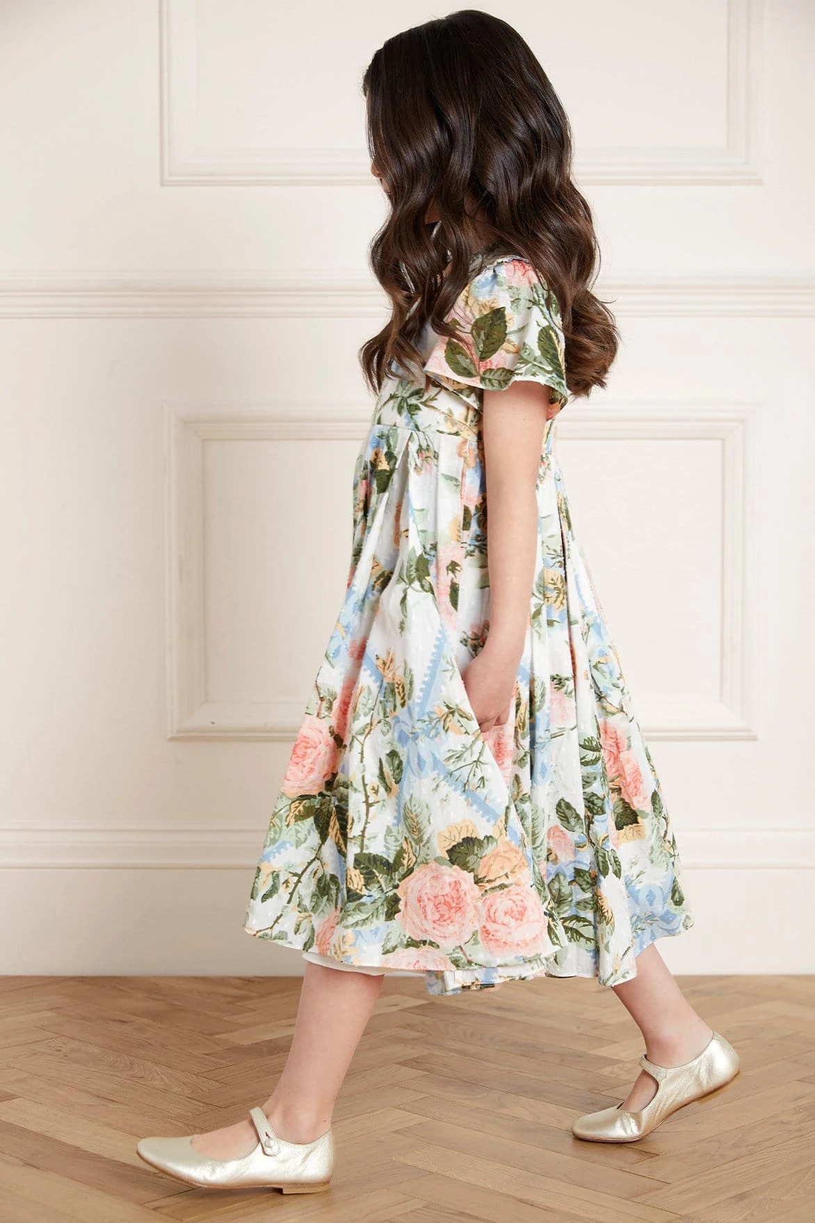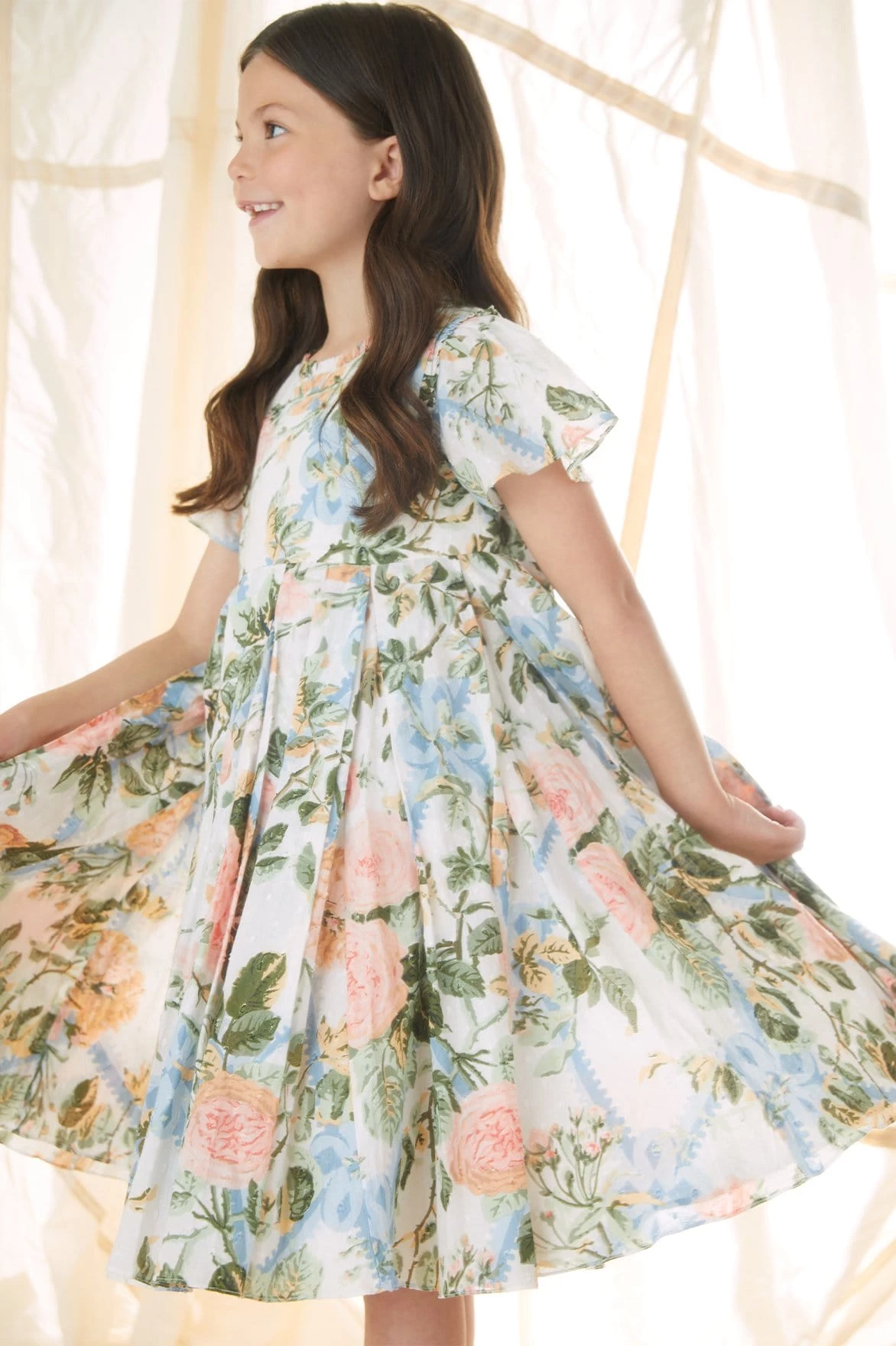 NEW SEASON | NEEDLE & THREAD EXCLUSIVE. The Rose Garden Cotton KIDS Prom Dress. This dress is elegantly crafted with soft cotton in a dotted, textured fabric. Printed with a beautiful rose and trellis design in soft, pastel tones. Boasting a box pleat skirt, creating a playful shape. Dress her up in the Rose Garden for any occasion.