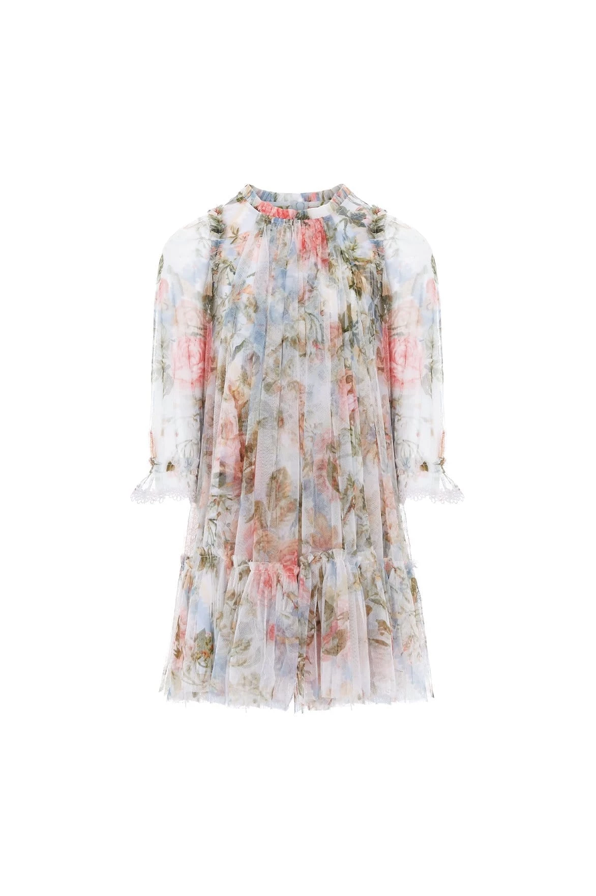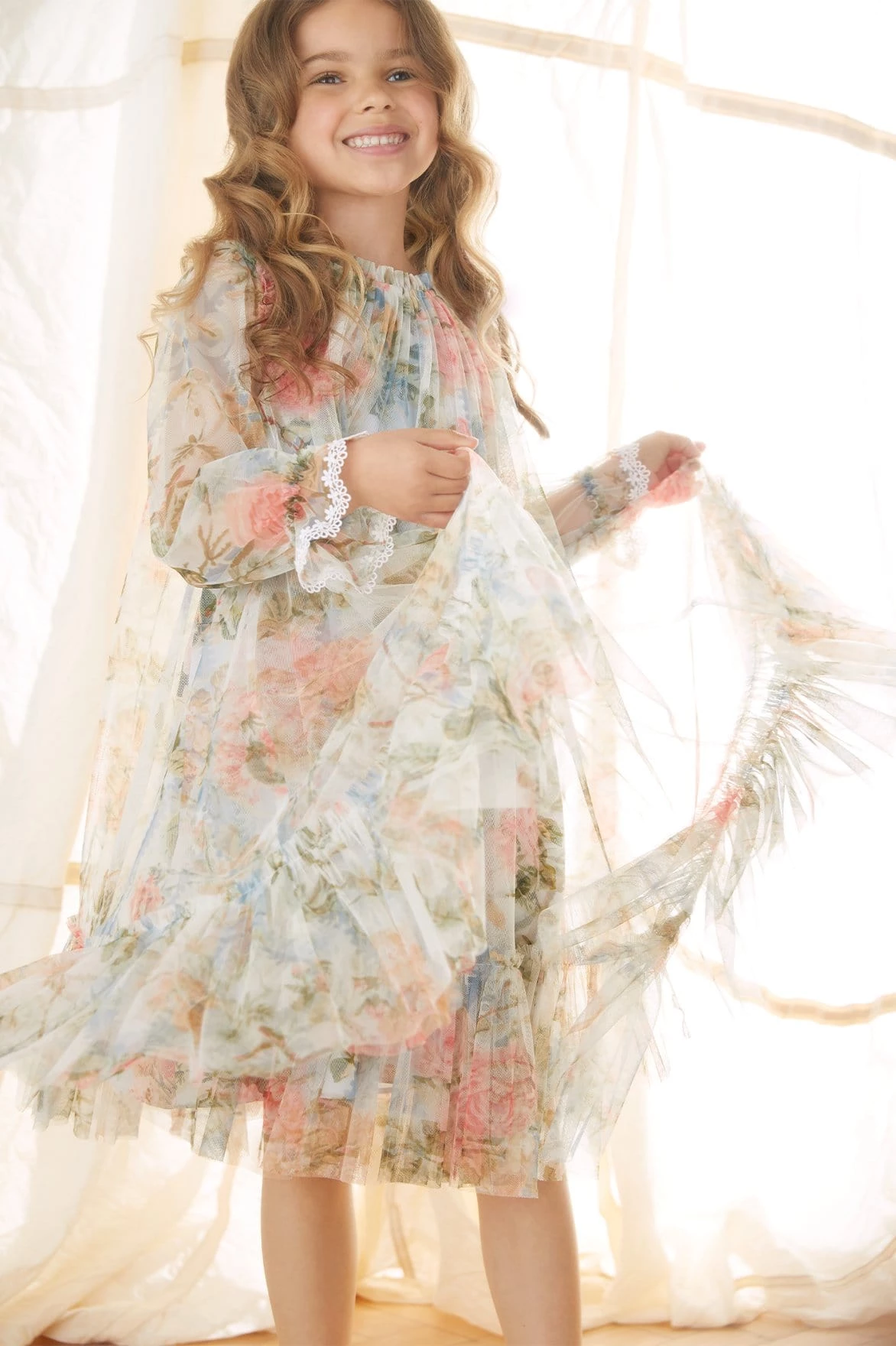 NEW SEASON | NEEDLE & THREAD EXCLUSIVE. The Rose Garden Ditsy KIDS Dress in Multi-Coloured. This beautiful dress is printed with a rose and trellis design in soft, pastel tones. Decorated with small, ditsy flowers in tonal shades scattered throughout the dress. Beautifully crafted with a voluminous shape, creating a playful finish. Let your little one twirl around in the Rose Garden Ditsy.