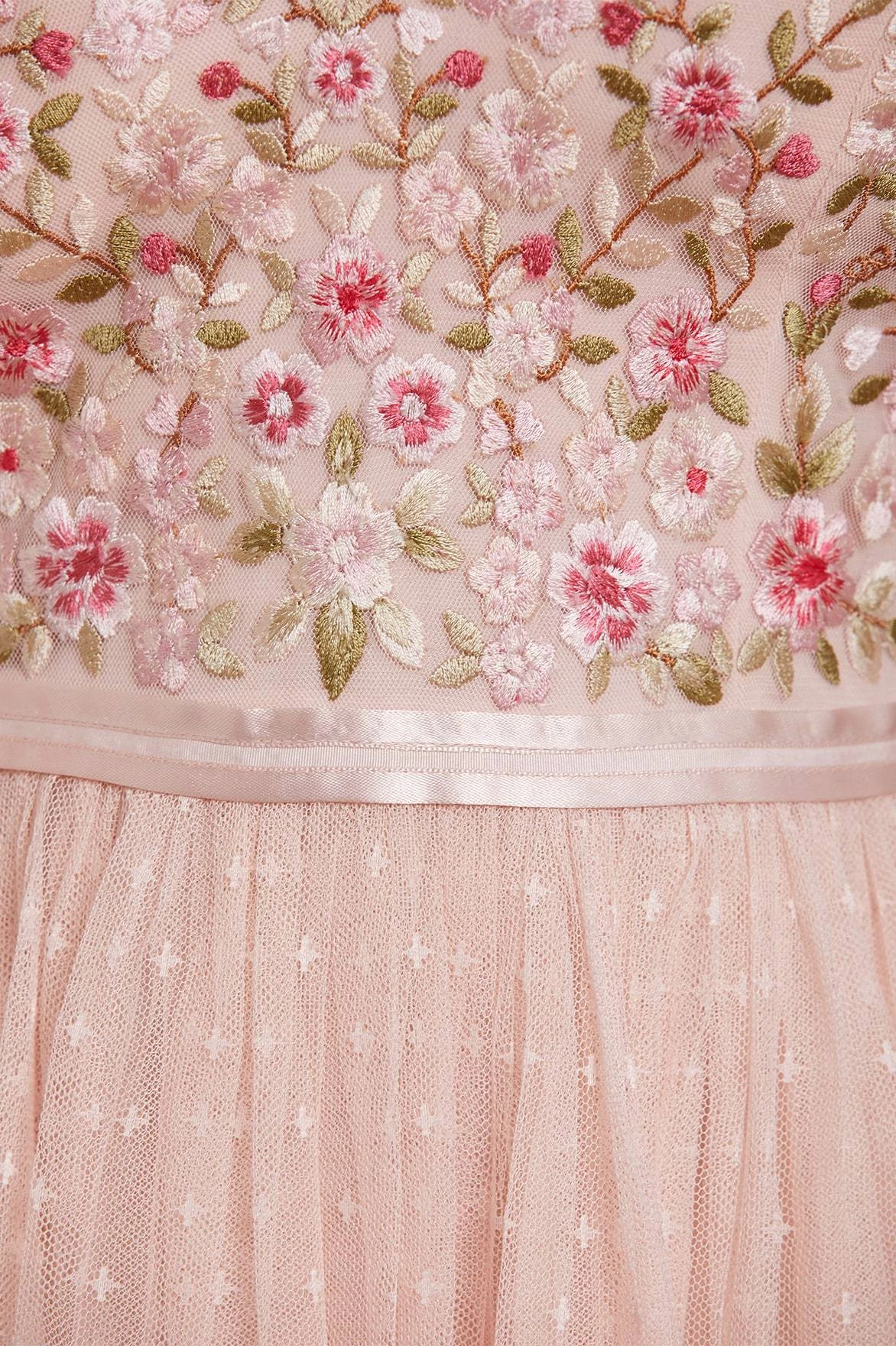 NEEDLE & THREAD EXCLUSIVE. The Rosie Lace Bodice Long Sleeve V-Neck Ankle Gown in Petal Pink. Beautifully decorated with embroidery throughout, this gown features rose floral motifs, lace borders and a satin waistband. Its skirt is crafted from soft tulle with an ‘x’ motif design. The perfect gown for every special occasion.