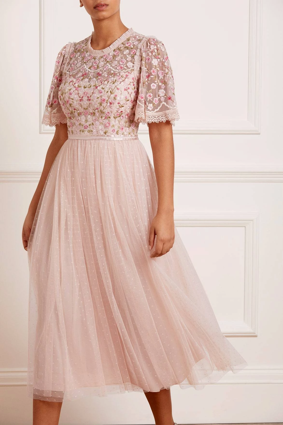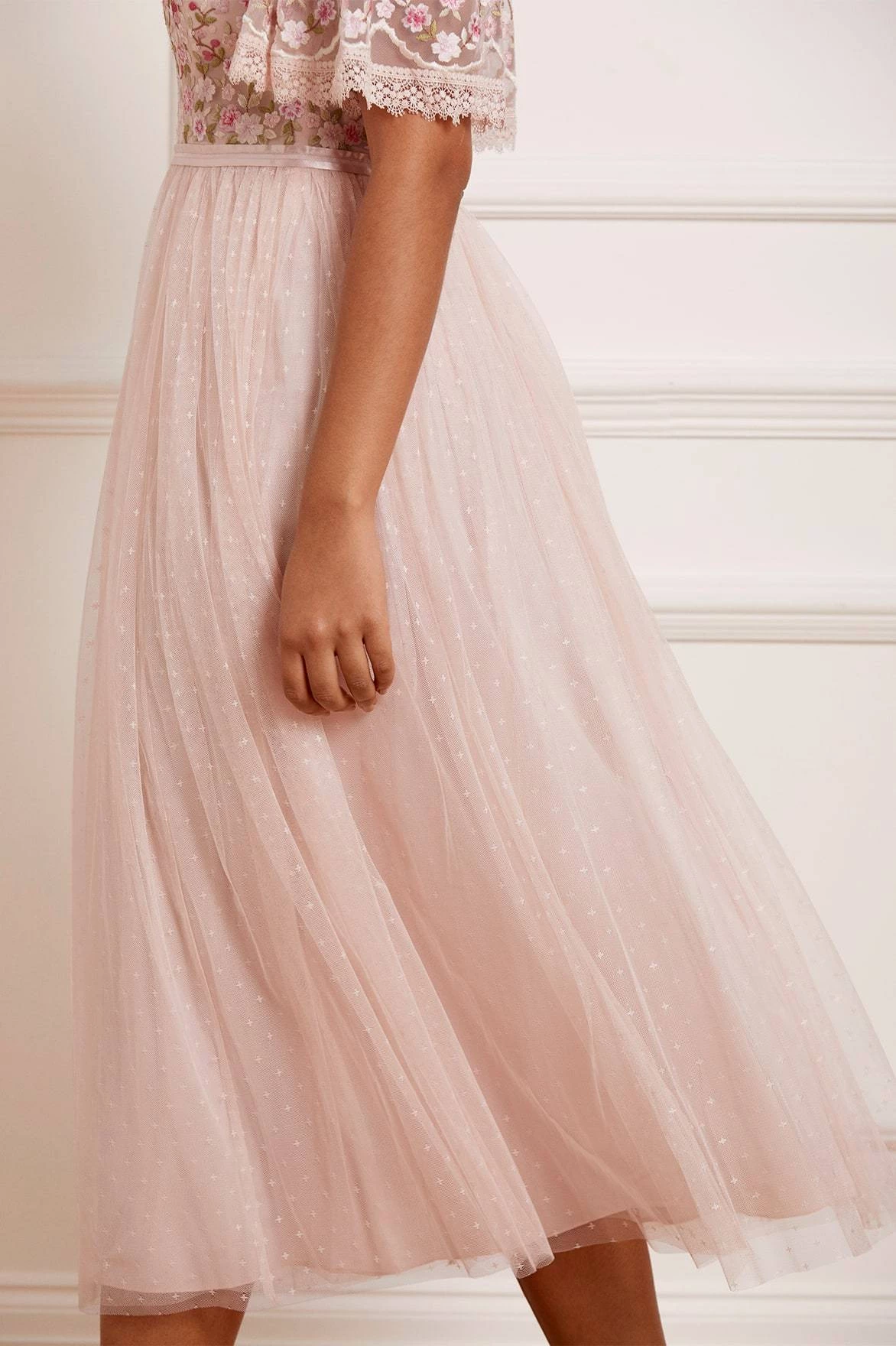 NEEDLE & THREAD EXCLUSIVE. The Rosie Lace Bodice Short Sleeve Round Neck Ballerina Dress in Petal Pink. Beautifully decorated with embroidery throughout, this gown features rose floral motifs, lace borders and a satin waistband. Its skirt is crafted from soft tulle with an ‘x’ motif design. The perfect dress for every special occasion.