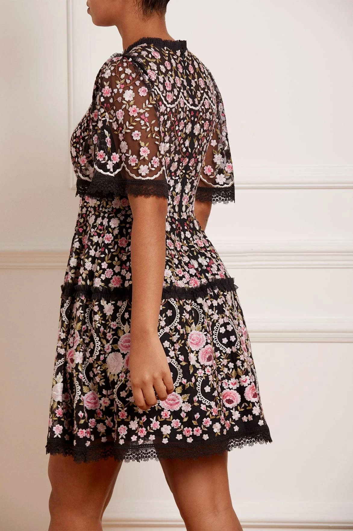 The Rosie Lace Micro Mini Dress in Graphite. This mini dress is beautifully decorated with embroidery throughout. Designed with rose floral motifs, lace borders and a satin waistband for signature Needle & Thread detailing. This dress features an ‘x’ motif tulle and a striking silhouette. A key statement piece of the season.