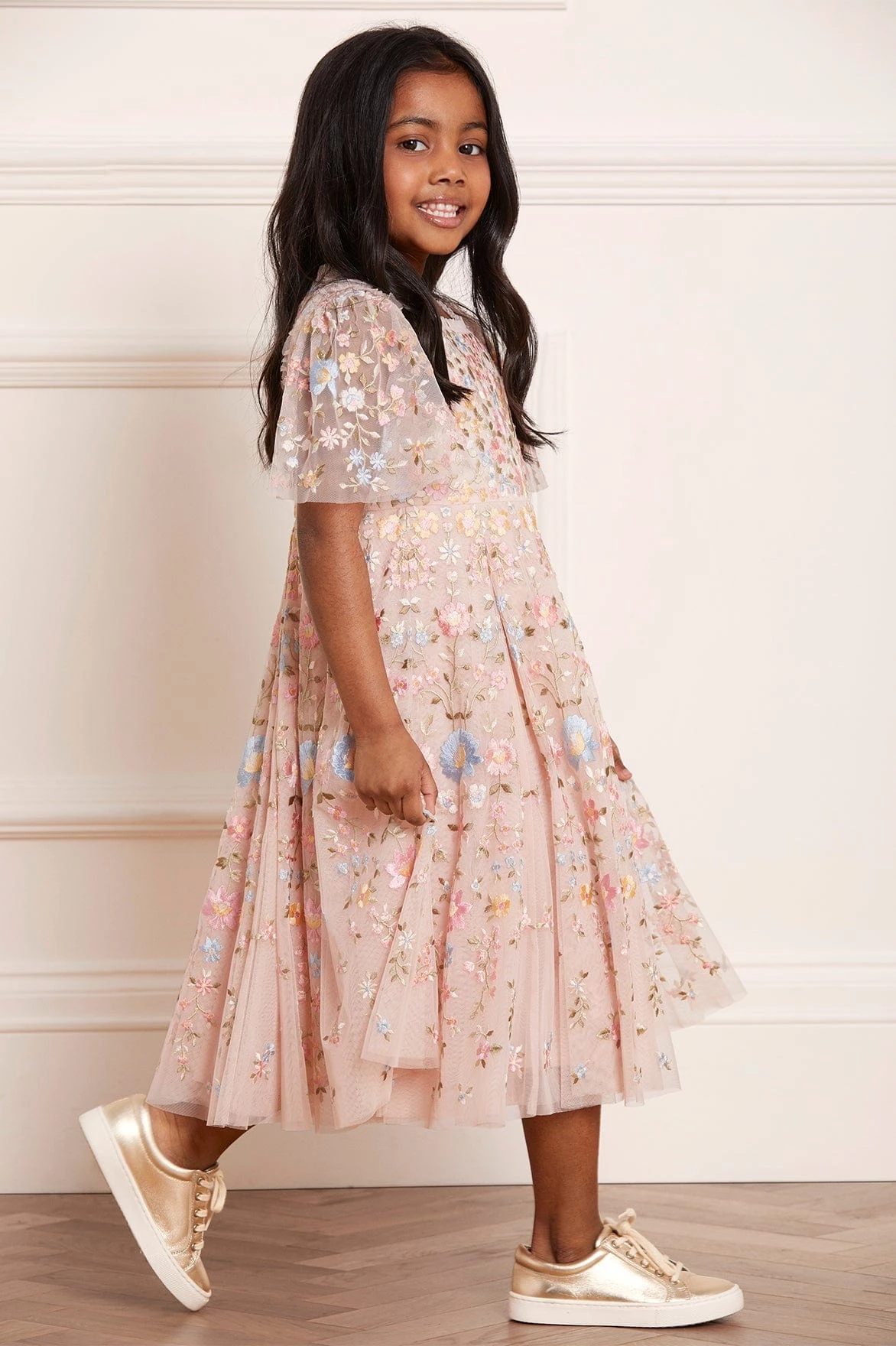 NEW SEASON | The Secret Garden KIDS Prom Dress in Petal Pink/Wildflower. This dress is decorated beautifully in statement embroidery artwork. Designed with floral motifs in pastel shades, a classic Needle & Thread loose shape and a pleated playful skirt. The perfect statement piece for her wardrobe.
