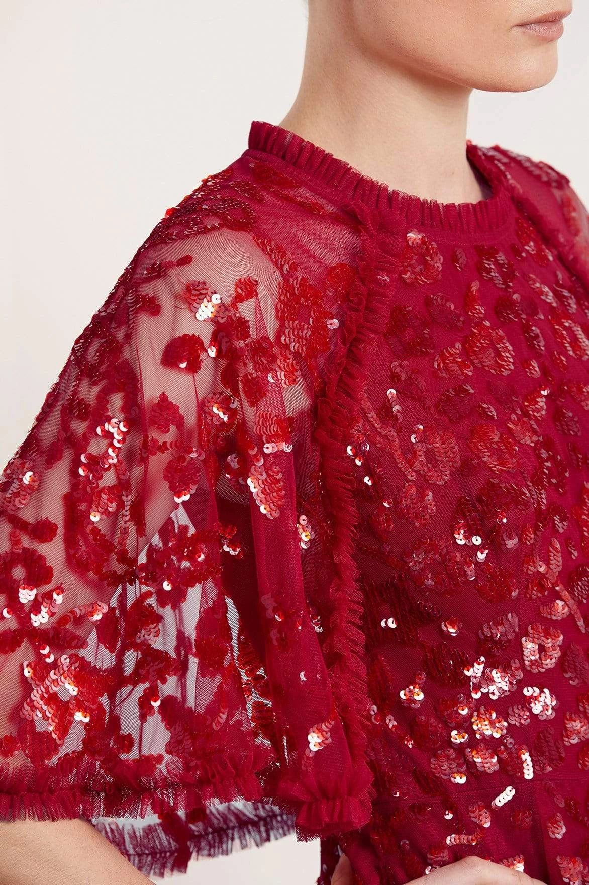 The Sequin Ribbon Gown in Deep Red. This gown is inspired by key styling details of the 1930s. Beautifully designed with cape sleeves that gracefully fall over the shoulders, adding romantic coverage to the arms. Decorated with a floral lace artwork in lustrous tonal sequins, creating an all-over shine. The artwork is inspired by a Victorian lace fan, which features floral and bow motifs. Shine under the spotlight in this elegant gown.
