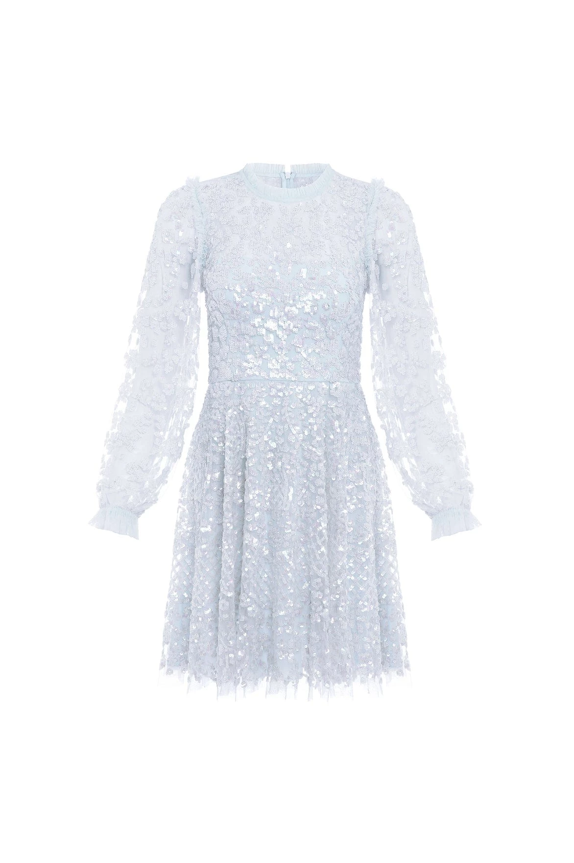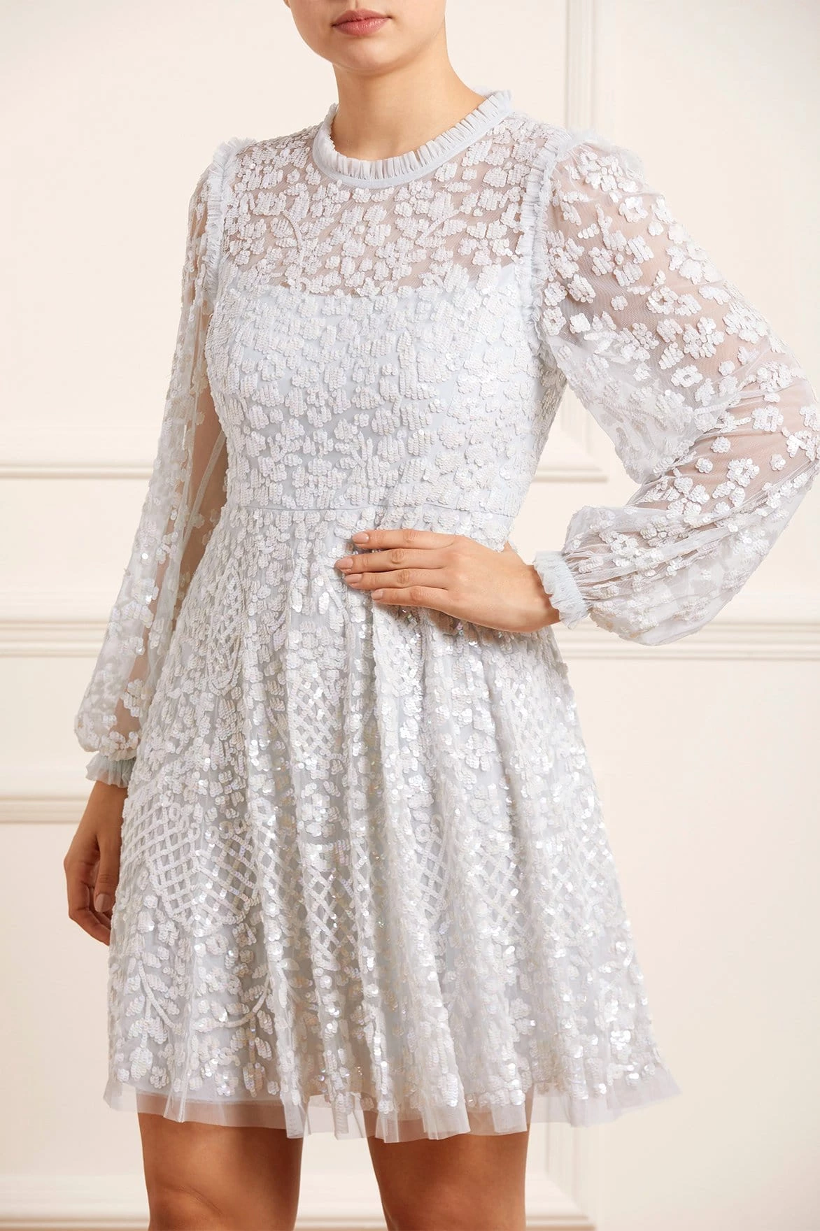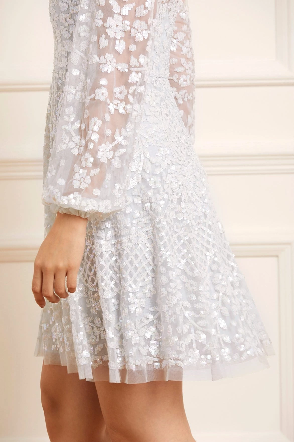 The Seren Long Sleeve Mini Dress in Ice Blue. This statement dress is adorned with a floral sequin artwork, creating an all-over shimmer effect. Crafted in our signature tulle, with an effortlessly flattering silhouette. Make a statement in this show-stopping mini dress.
