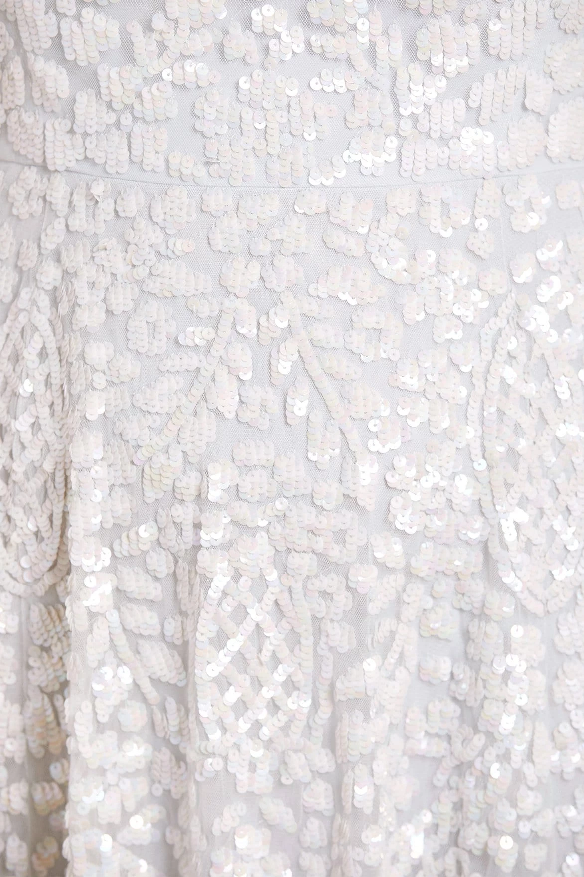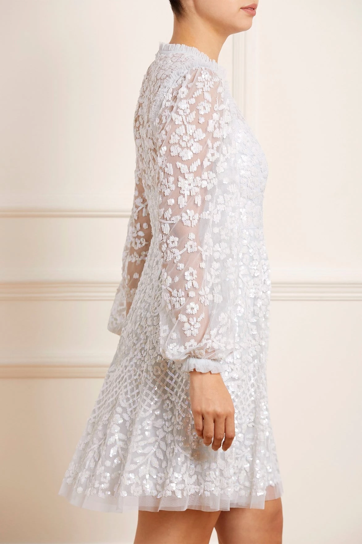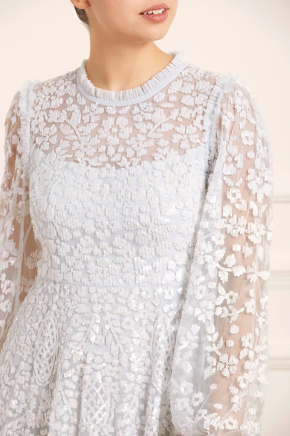 The Seren Long Sleeve Mini Dress in Ice Blue. This statement dress is adorned with a floral sequin artwork, creating an all-over shimmer effect. Crafted in our signature tulle, with an effortlessly flattering silhouette. Make a statement in this show-stopping mini dress.