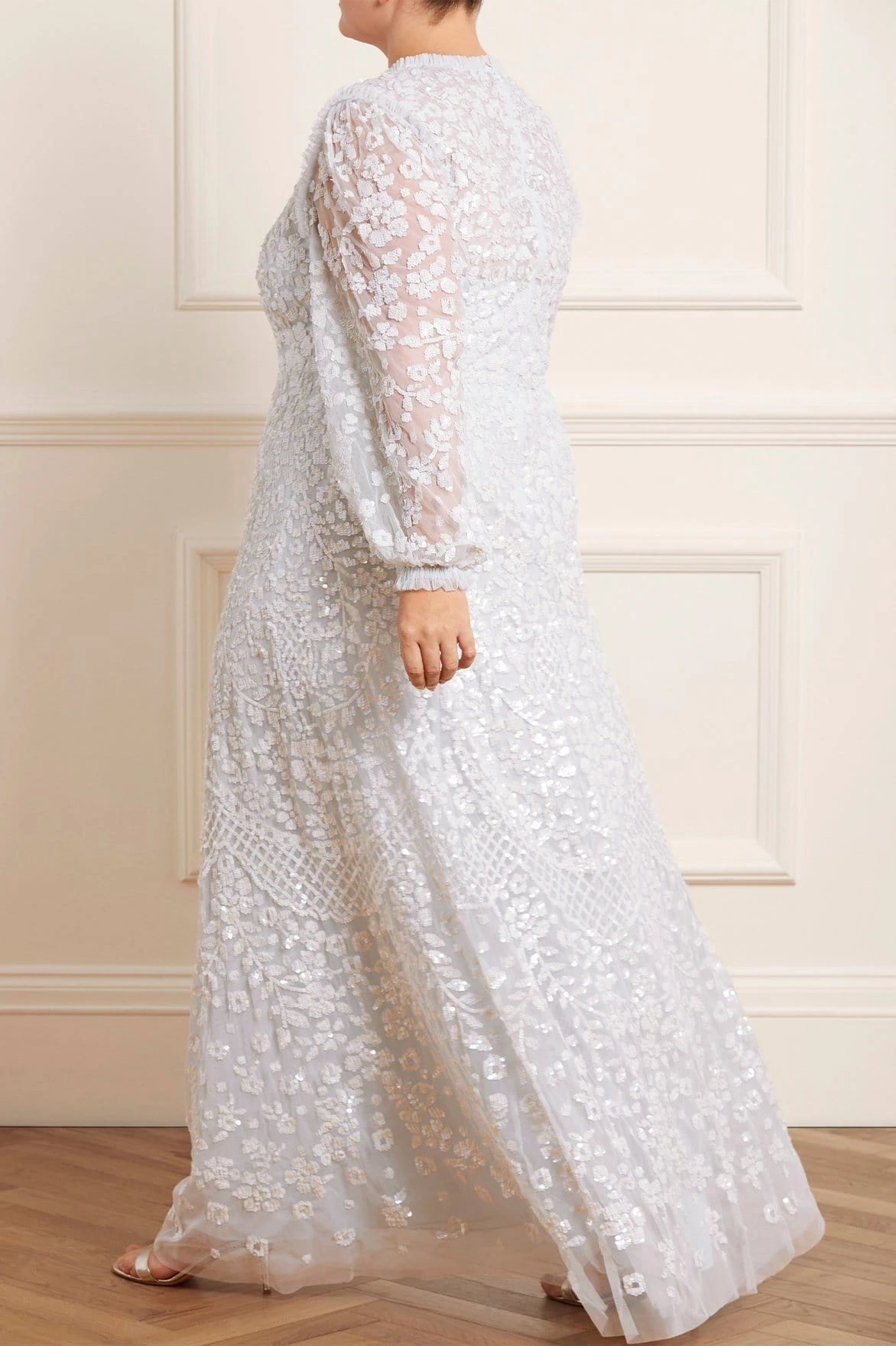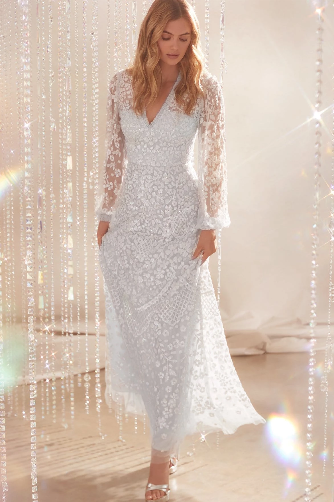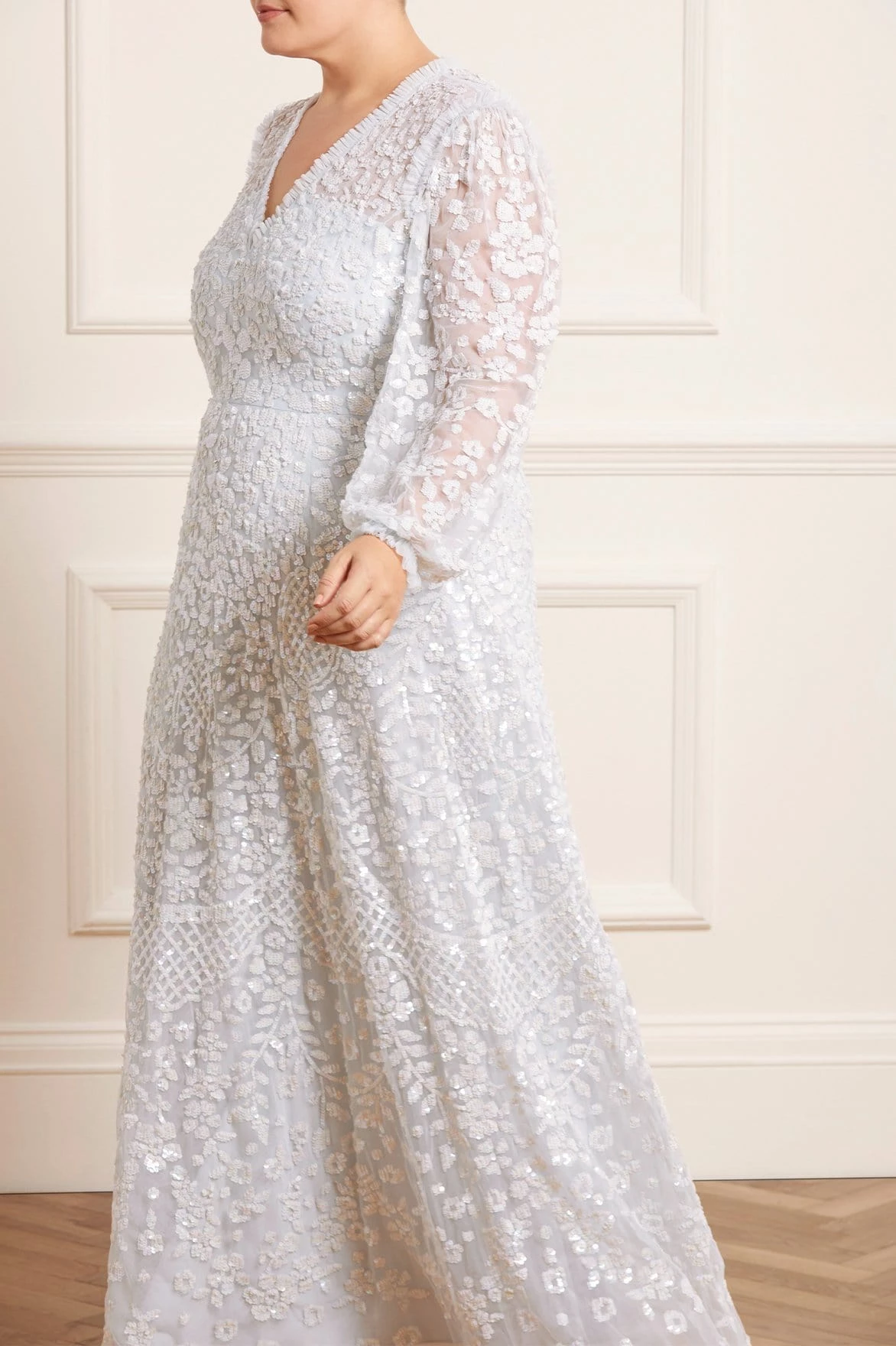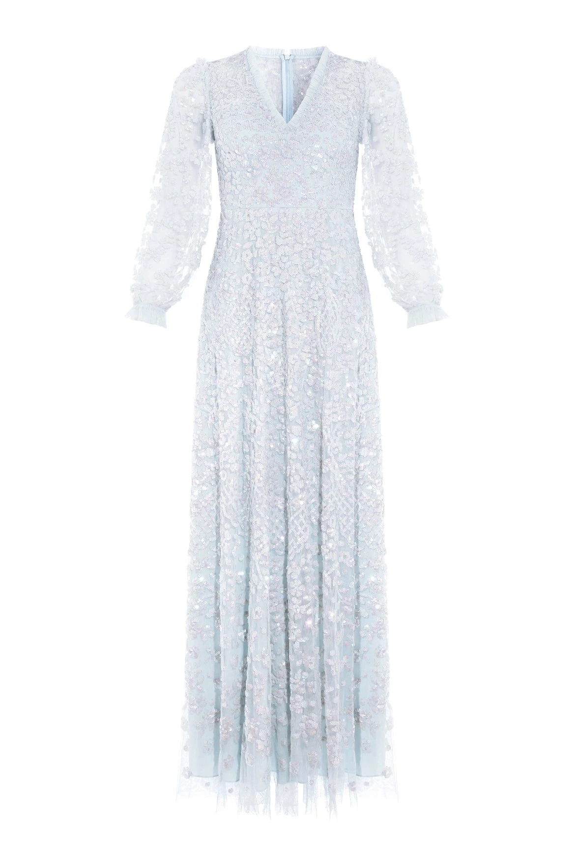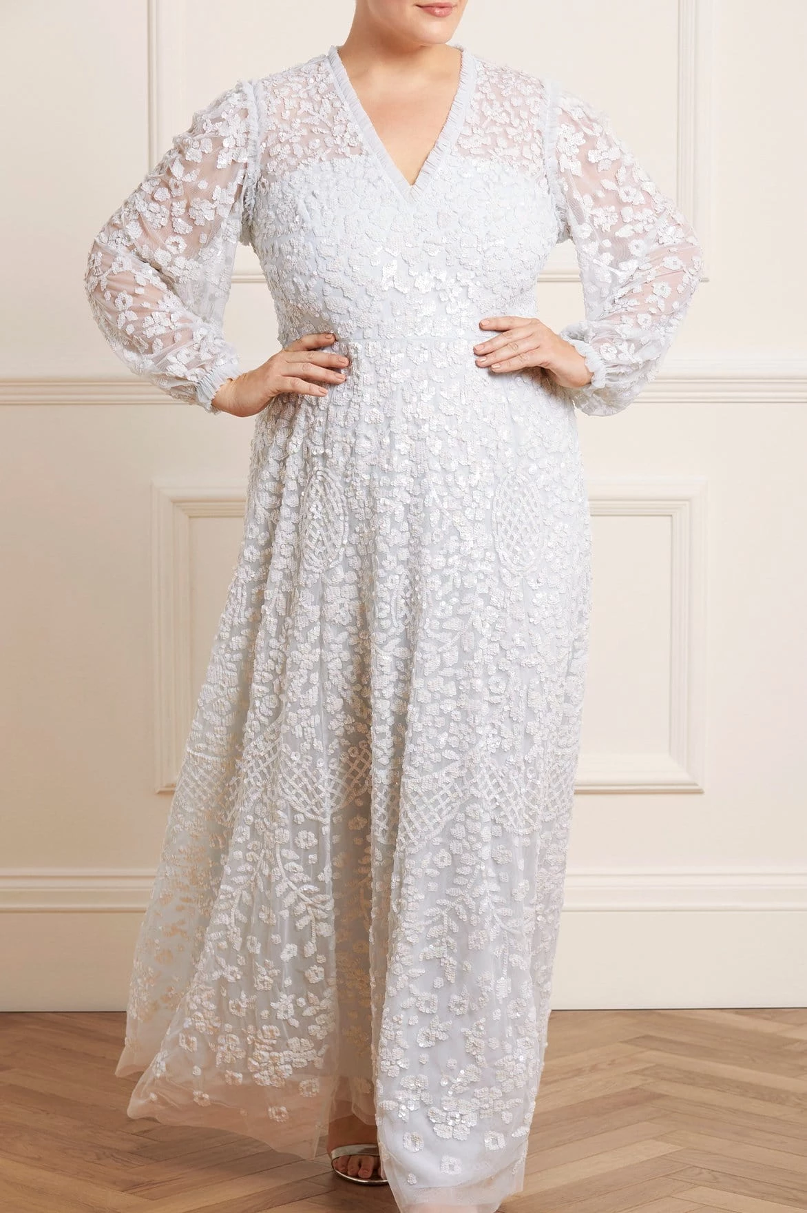 The Seren Long Sleeve V-Neck Gown in Ice Blue. This statement gown is adorned with a floral sequin artwork, creating an all-over shimmer effect. Beautifully designed with a v-neckline and sheer long sleeves. Crafted in our signature tulle, featuring an effortlessly flattering silhouette. Make a statement in this show-stopping gown.