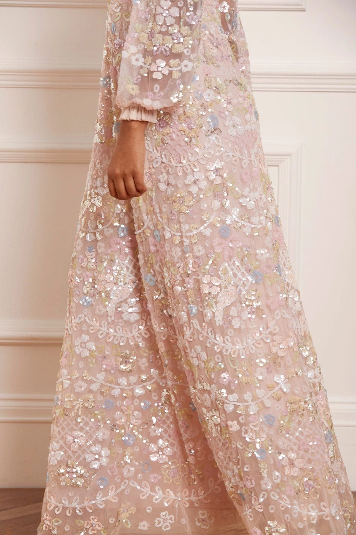 The Shimmer Fairytale V-Neck Gown in Petal Pink / Sundaze. Intricately adorned with a multi-coloured floral and bird artwork with shimmering sequins to create a romantic look. Beautifully designed with long sleeves, a V-neckline and Needle & Thread signature detailing. This gown is developed with a tulle net skirt to create a flattering silhouette. The ultimate fairytale piece.