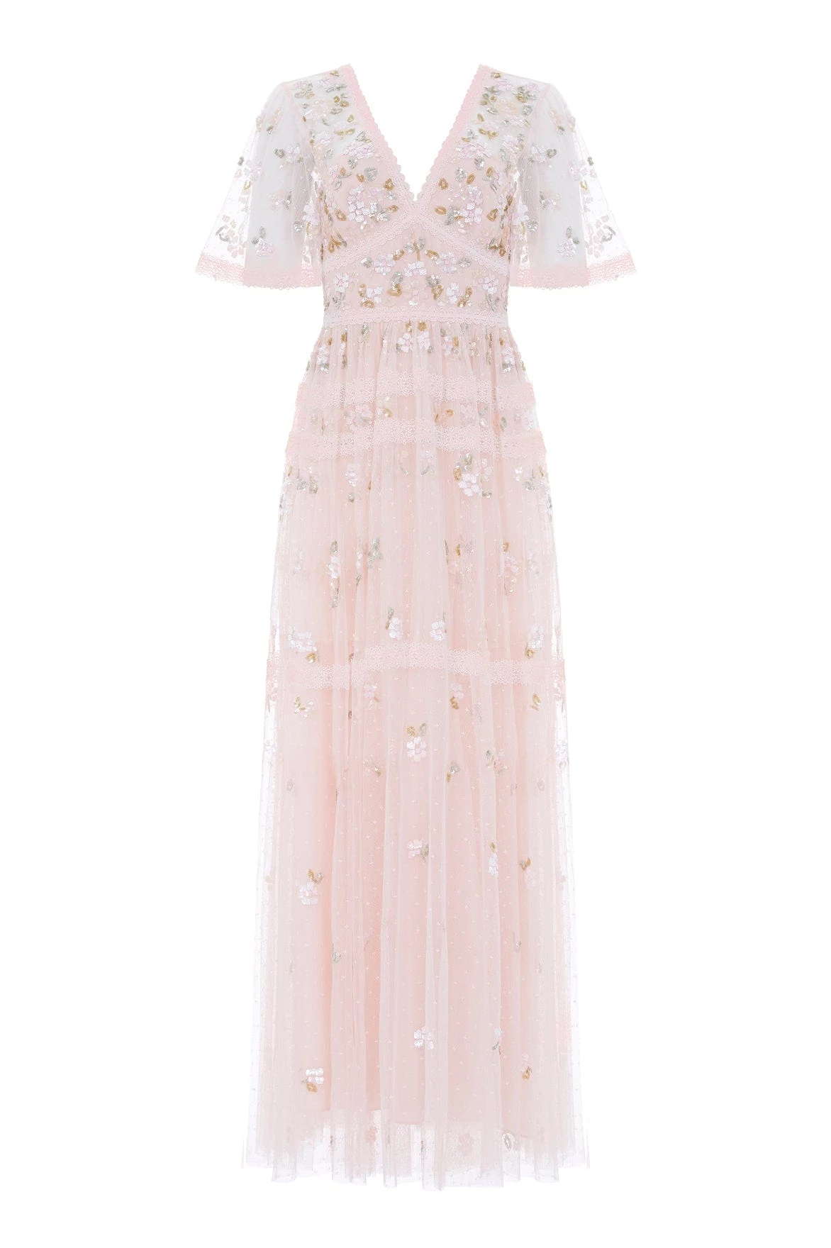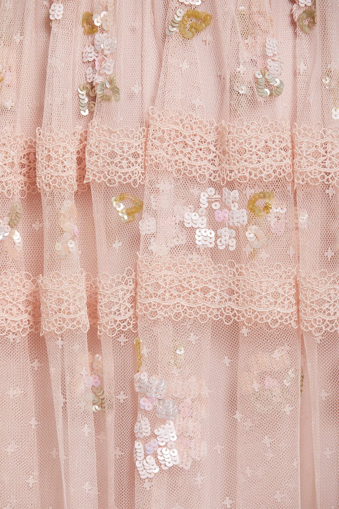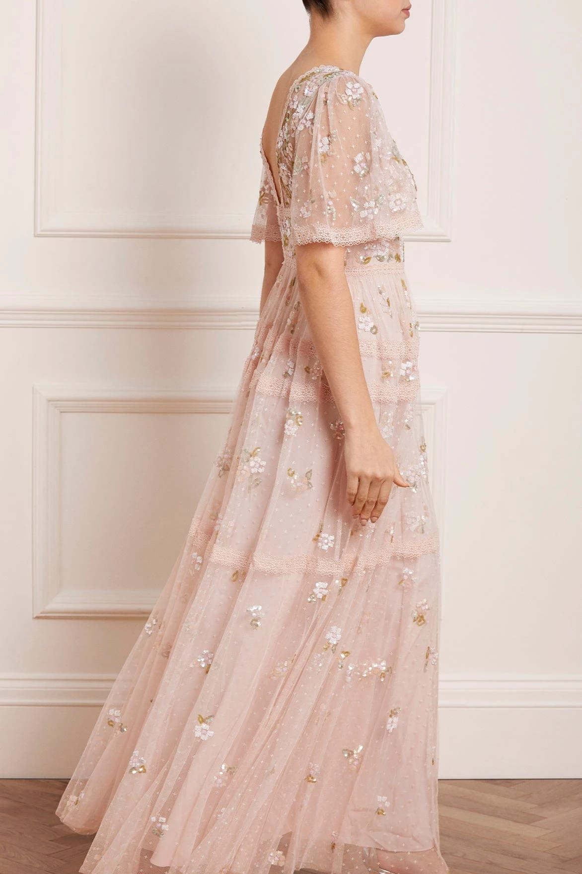 The Shimmer Primrose Gown in Petal Pink / White. This gown is adorned with small floral motifs in shimmering sequins scattered throughout. Intricately designed with lace trim edges along the hem, romantic cut sleeves and a layered tulle skirt. The perfect gown for every occasion.