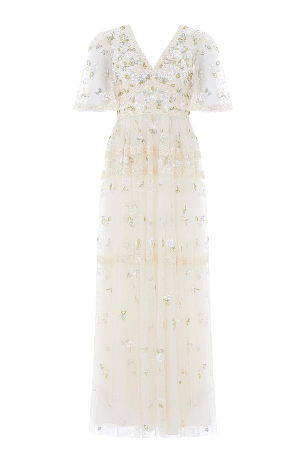 NEW SEASON | NEEDLE & THREAD EXCLUSIVE. The Shimmer Primrose Gown in Champagne / White. This gown is adorned with small floral motifs in shimmering sequins scattered throughout. Intricately designed with lace trim edges along the hem, romantic cut sleeves and a layered tulle skirt. The perfect gown for every occasion.