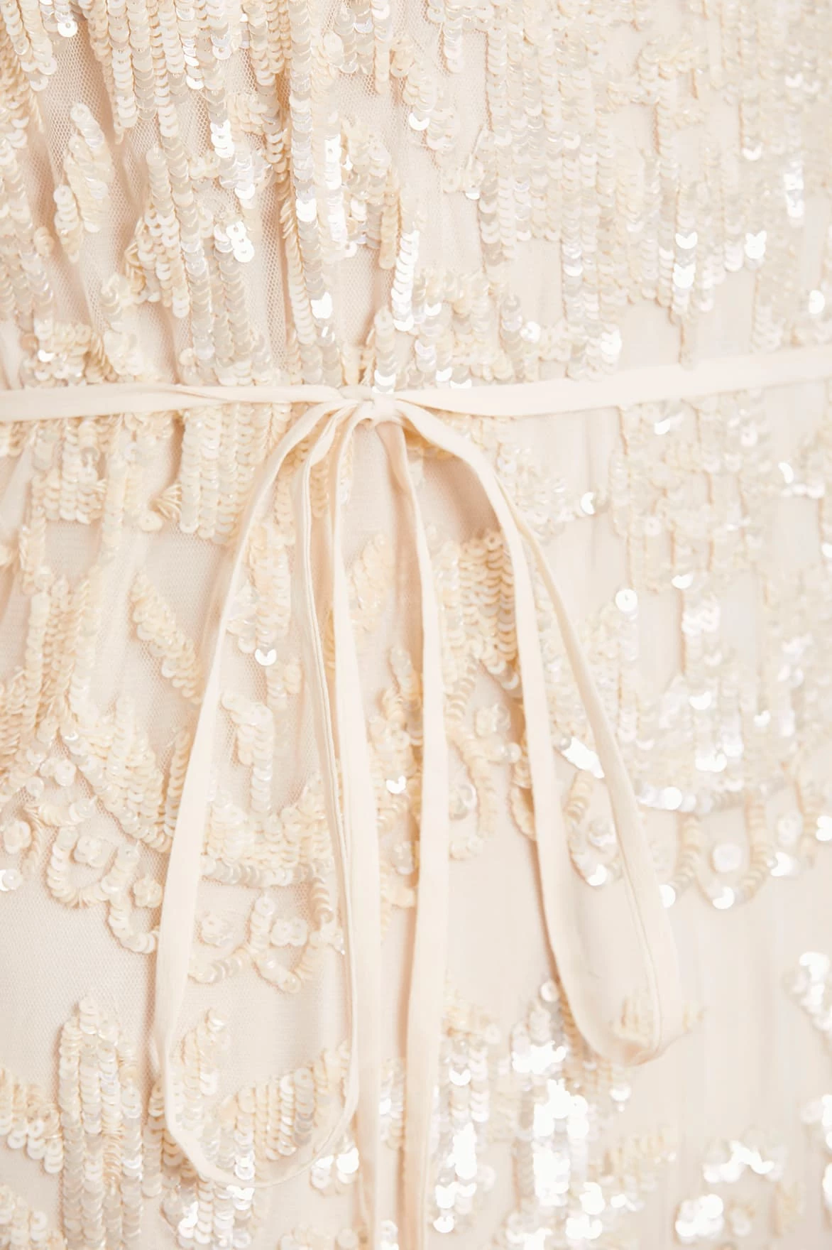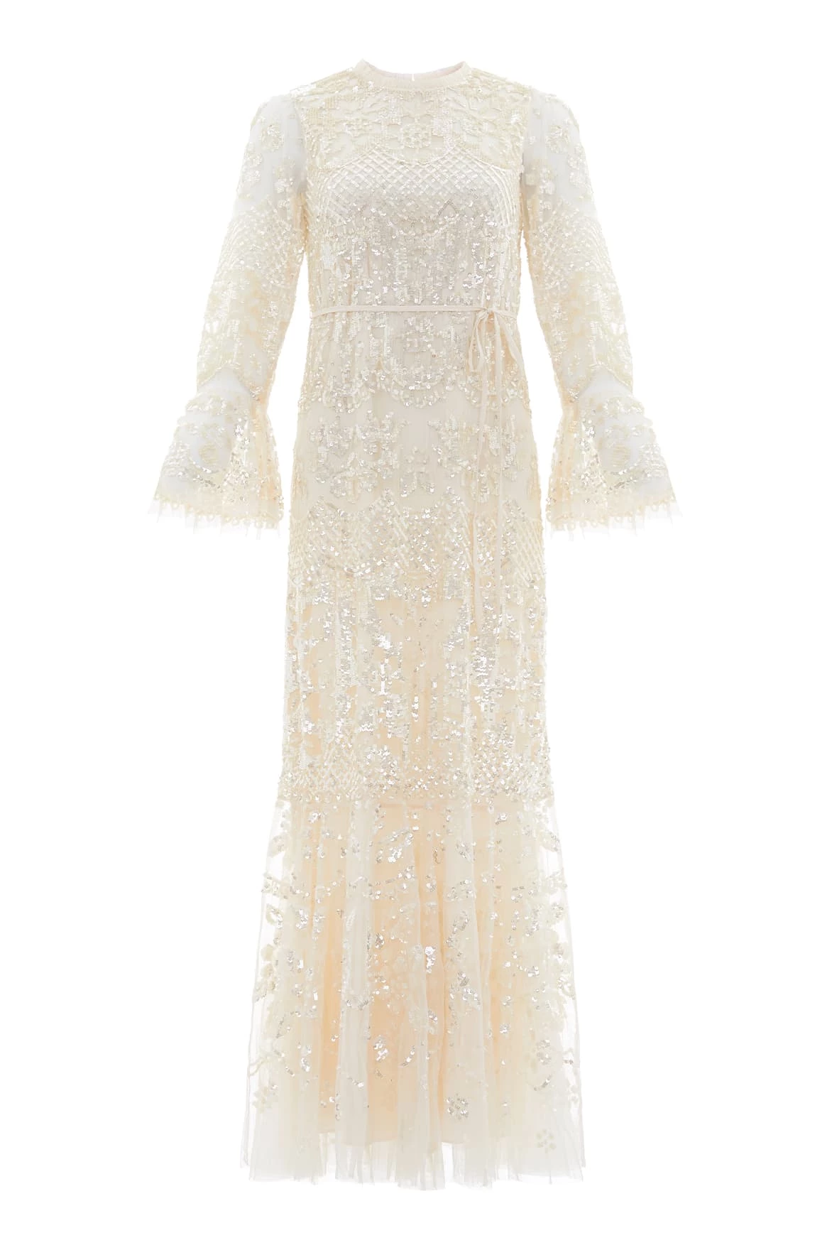 The Snowdrop Gown in Champagne. This show-stopping gown is adorned with shimmering gloss sequins, creating a romantic look and feel. Designed with a beautiful artwork inspired by a vintage lace tablecloth. Crafted from tulle with our signature Needle & Thread ruffle trims at the neckline. This gown has a loose-fitting silhouette with a detachable tie waist. Step out in style in the Snowdrop Gown to ensure all eyes are on you.