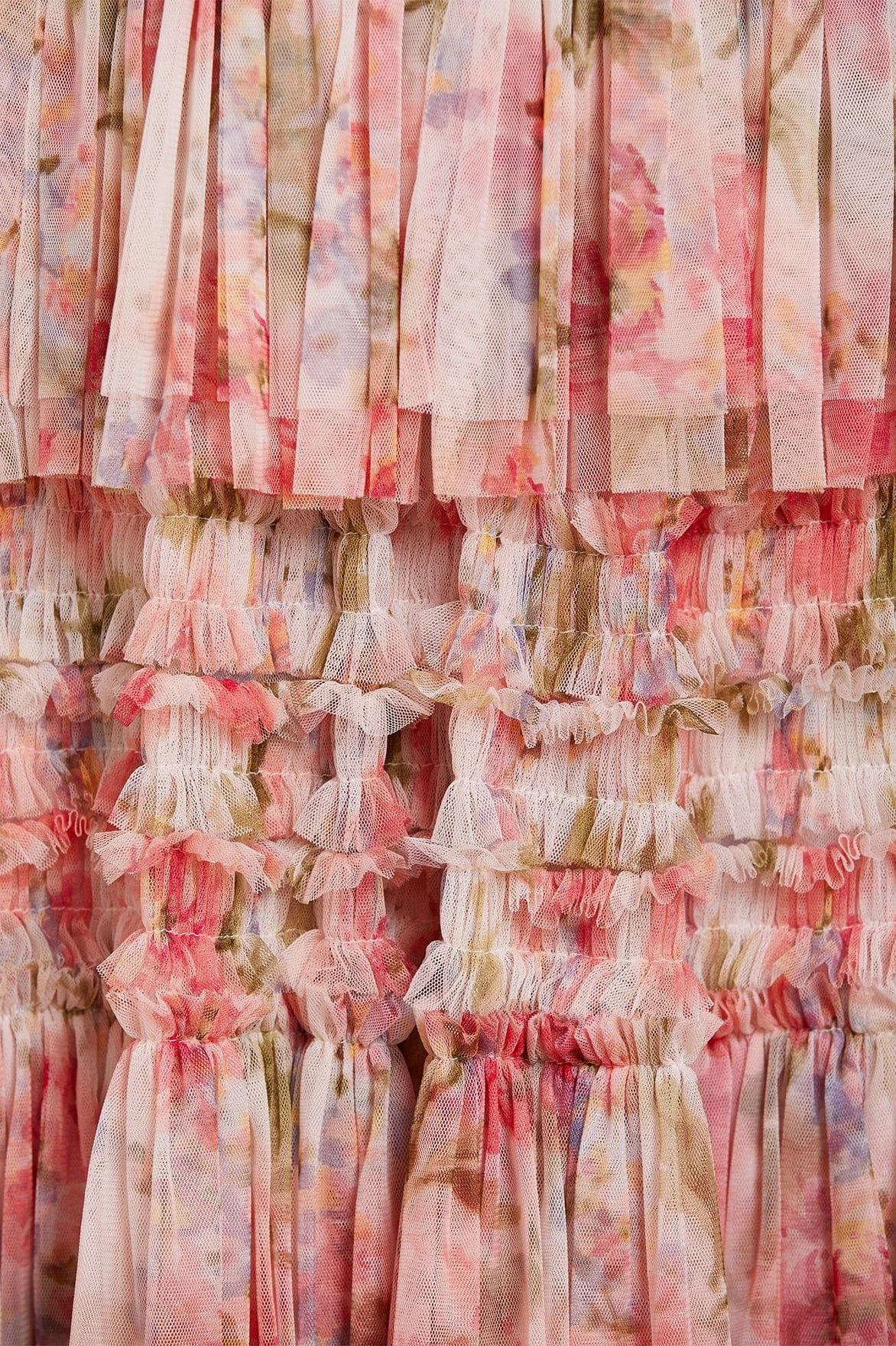 The Summer Song Candice Gown in Moonshine / Pink. This statement gown is beautifully printed with a romantic, floral artwork in sunset colours of dusk. This gown features whimsical ruffles and layered frills, creating a flattering look. Designed with a soft, layered tulle net for a romantic silhouette as you walk. Make the ultimate statement in this show-stopping gown.
