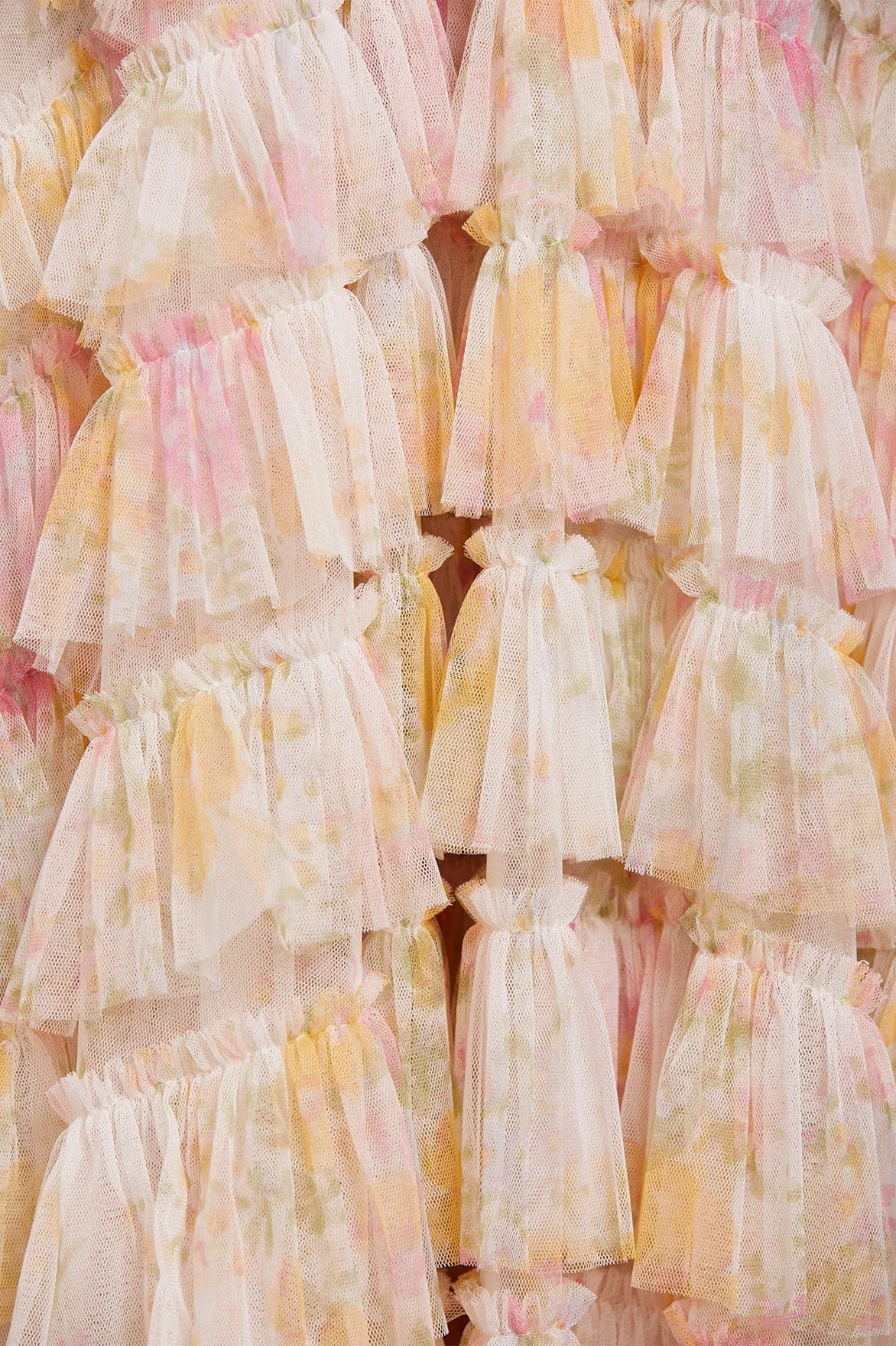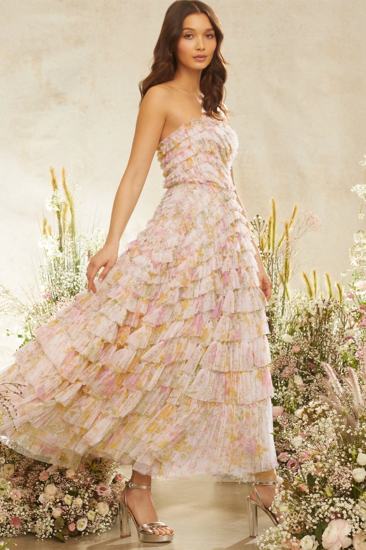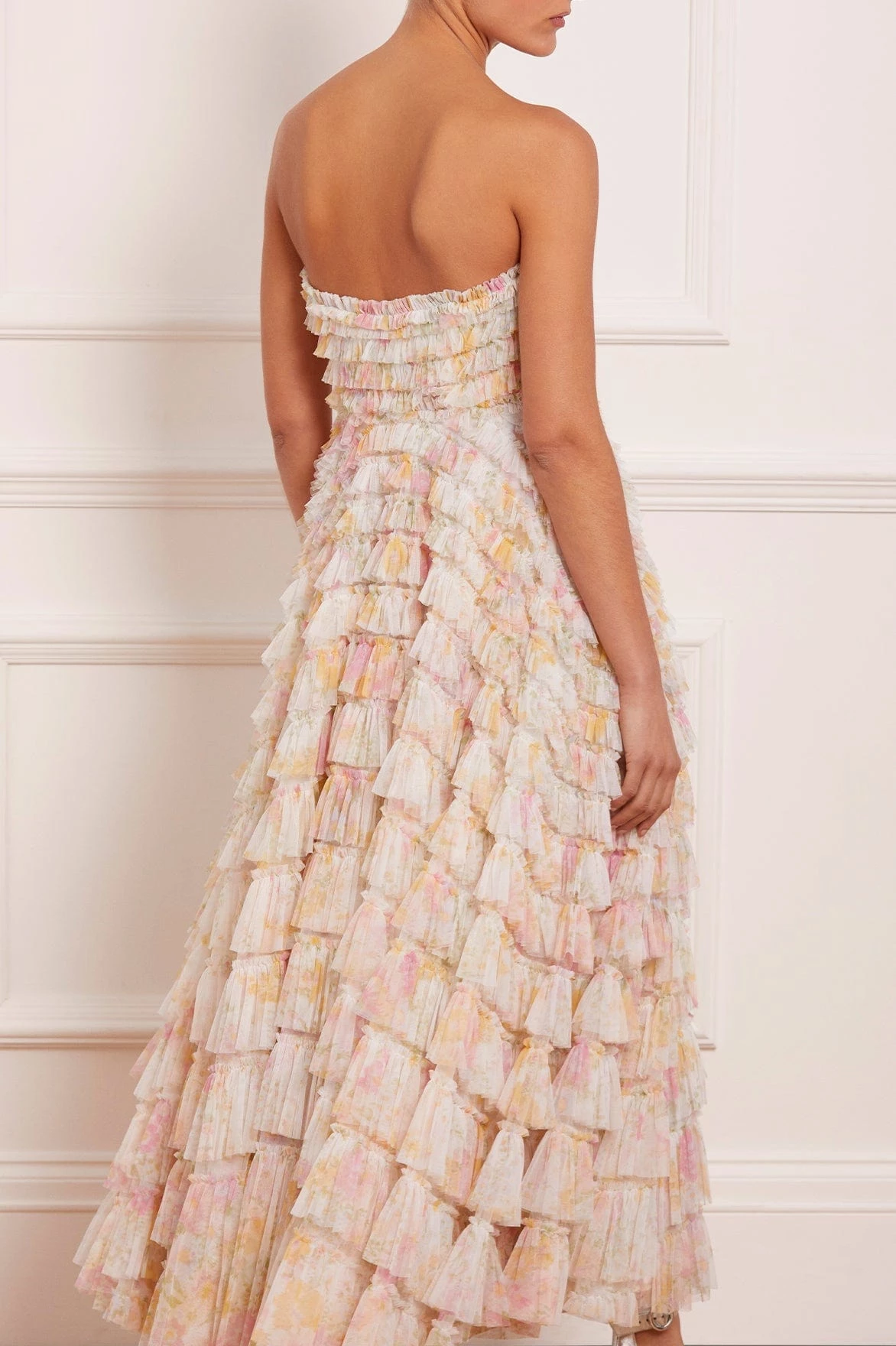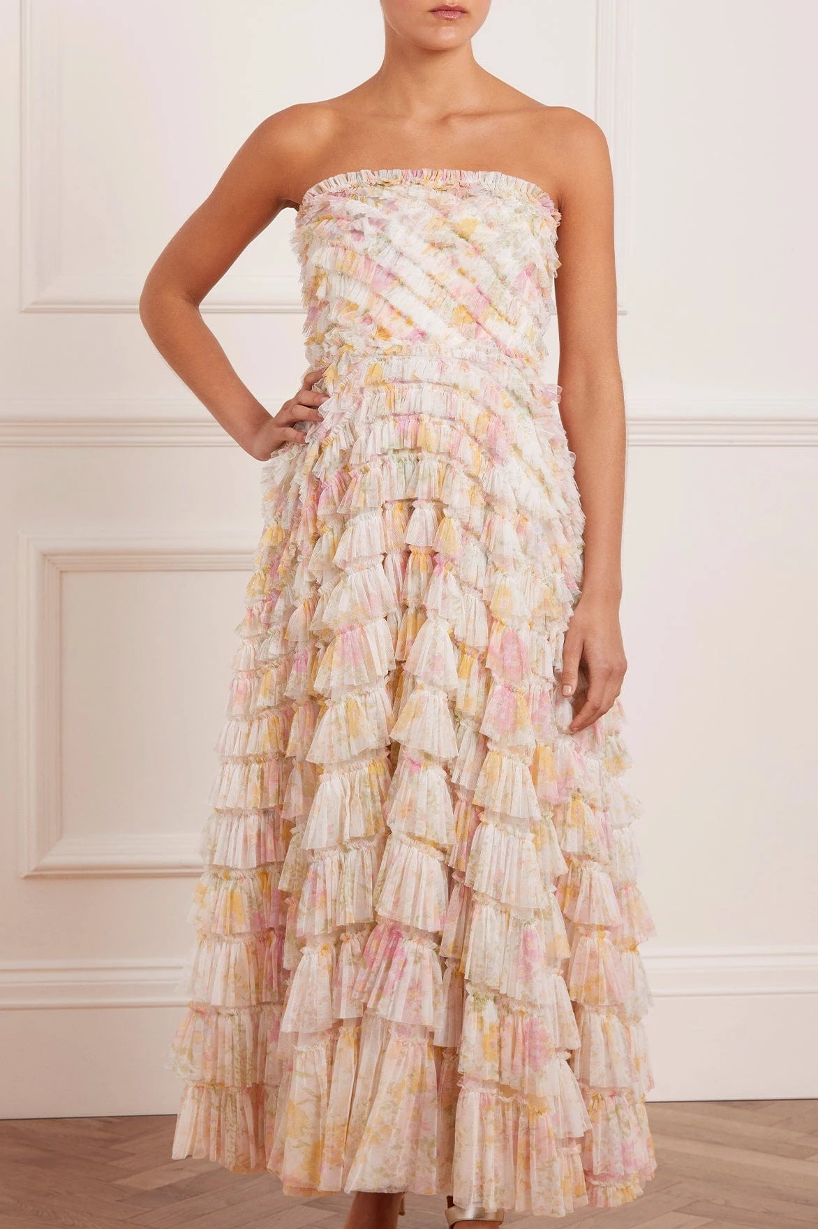 NEW SEASON |NEEDLE & THREAD EXCLUSIVE. The Sunrise Bloom Corset Ankle Gown in Moonshine. This corset gown is a classic, romantic style. Beautifully designed with large frills and layered tulle throughout the silhoutte, adding volume and creating whimsical movement. The print has been developed from an early 1900’s hand-painted artwork featuring soft, sunny pastel florals. The corset bodice features internal panels of power mesh fabric, adding structure to hold the silhouette in place whilst still allowing movement and comfort. Make a statement in the Sunrise Bloom.