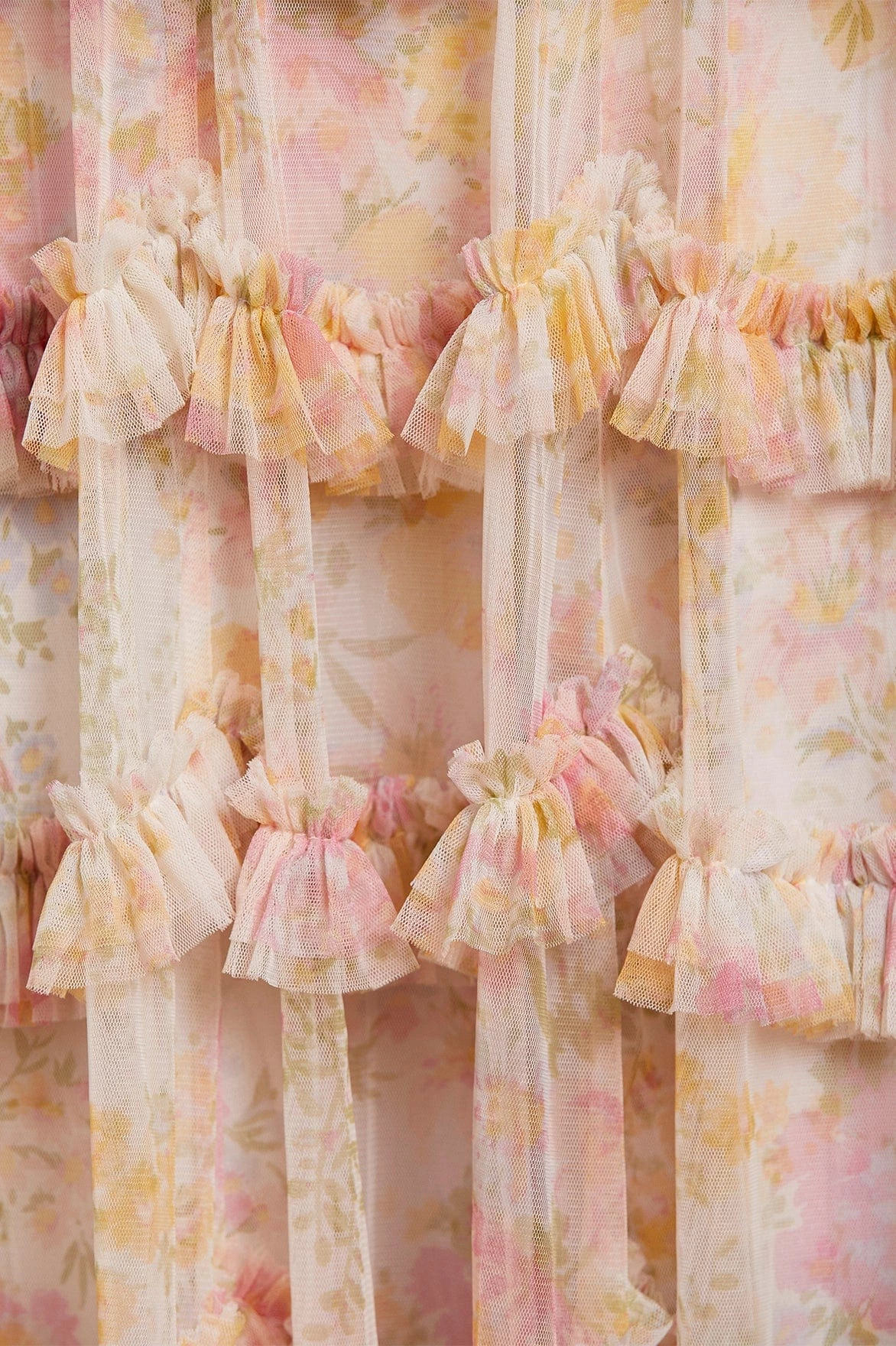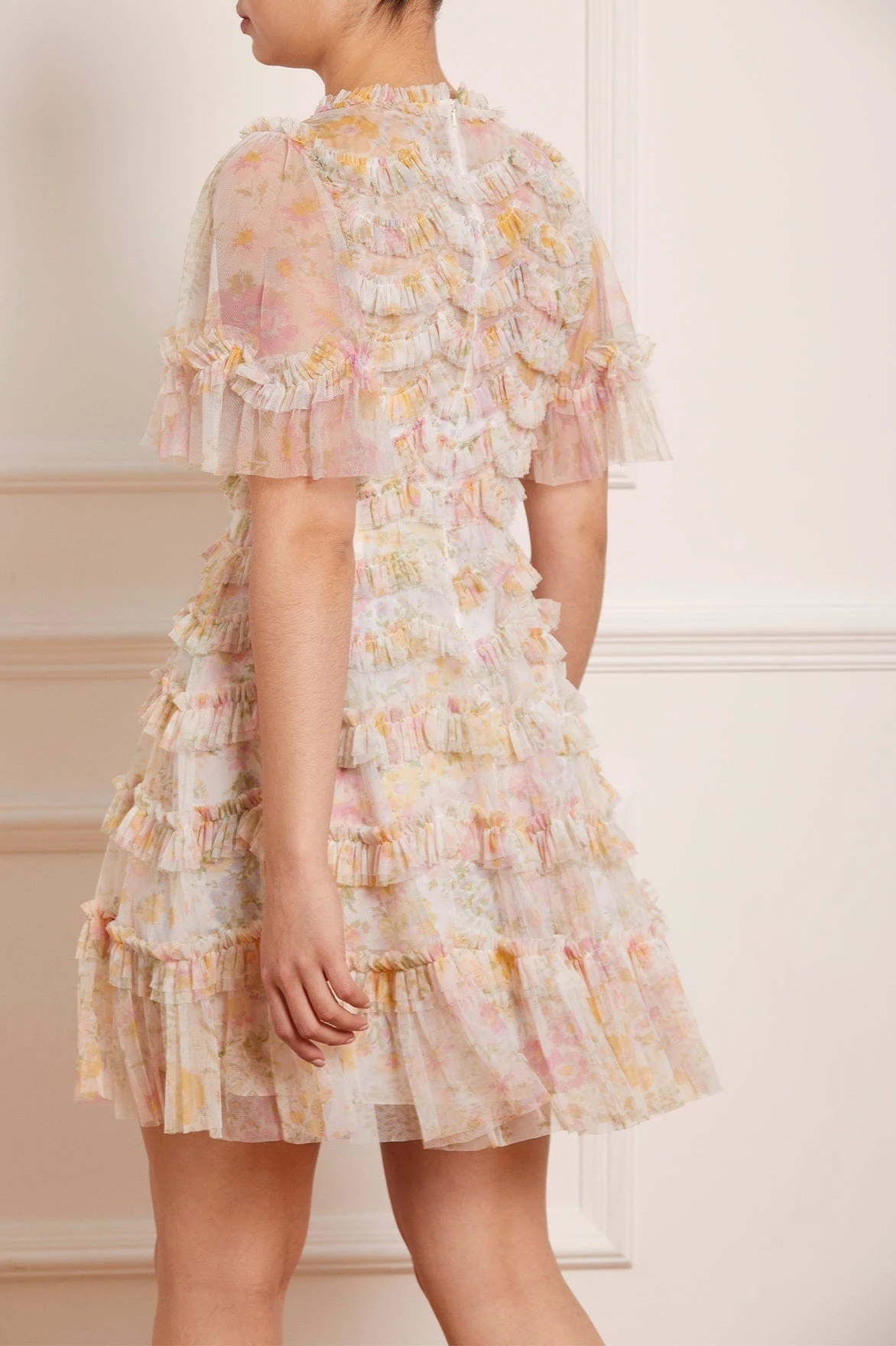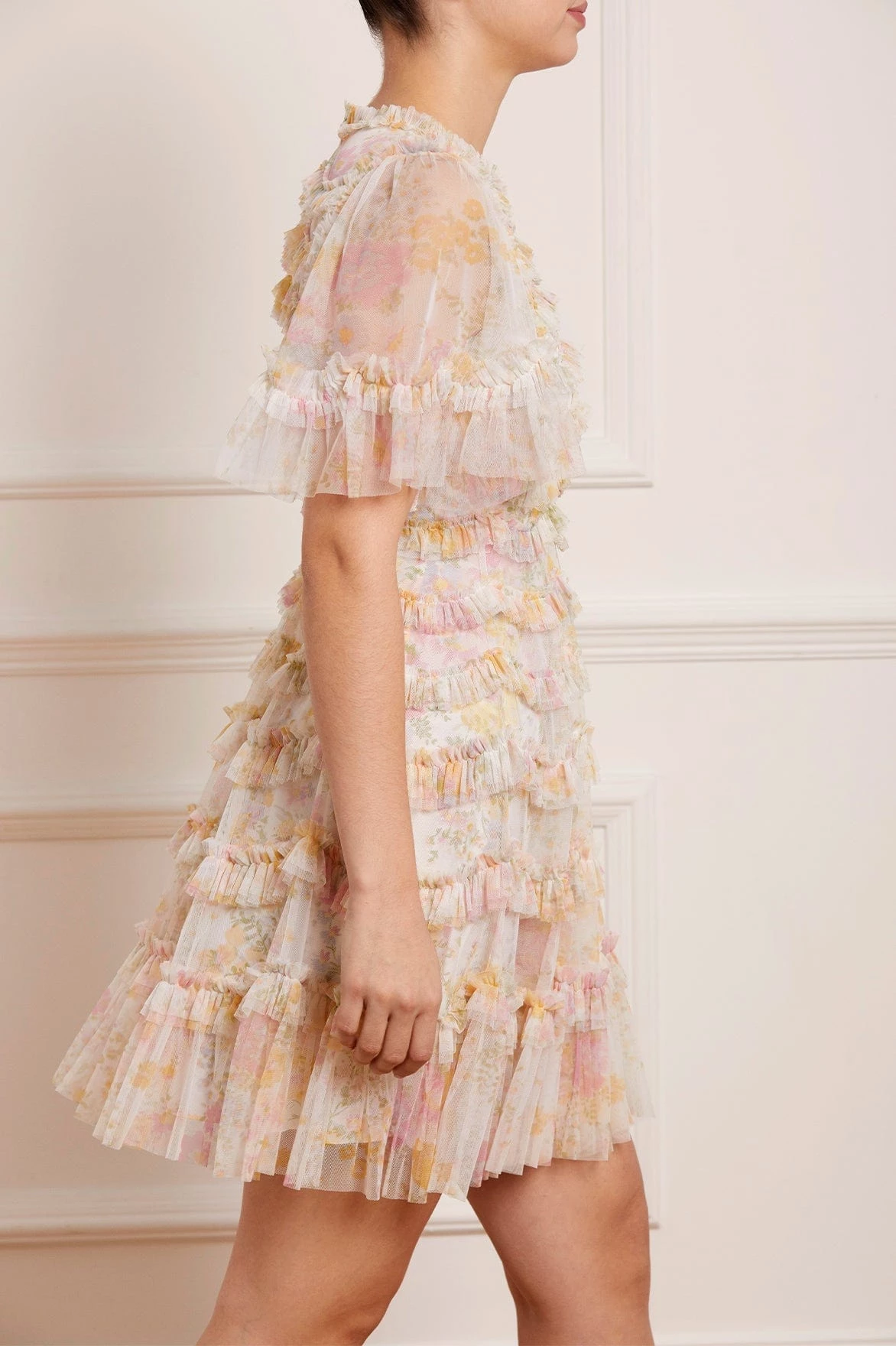 The Sunrise Bloom Ruffle Short Sleeve Mini Dress in Moonshine. This mini dress is crafted from delicate soft tulle with signature Needle & Thread detailing. The beautiful print has been developed from an early 1900’s hand-painted artwork featuring soft, sunny pastel florals. Designed with scallop-shaped ruffle tiers throughout the dress creating a soft, textured style. The perfect dress for your next event.