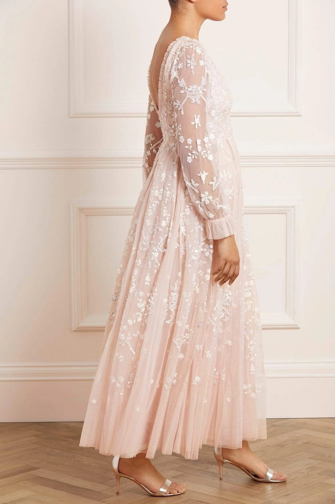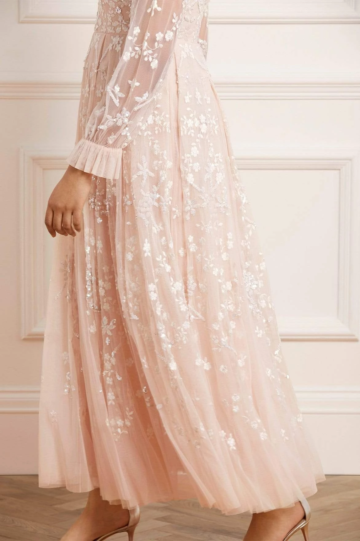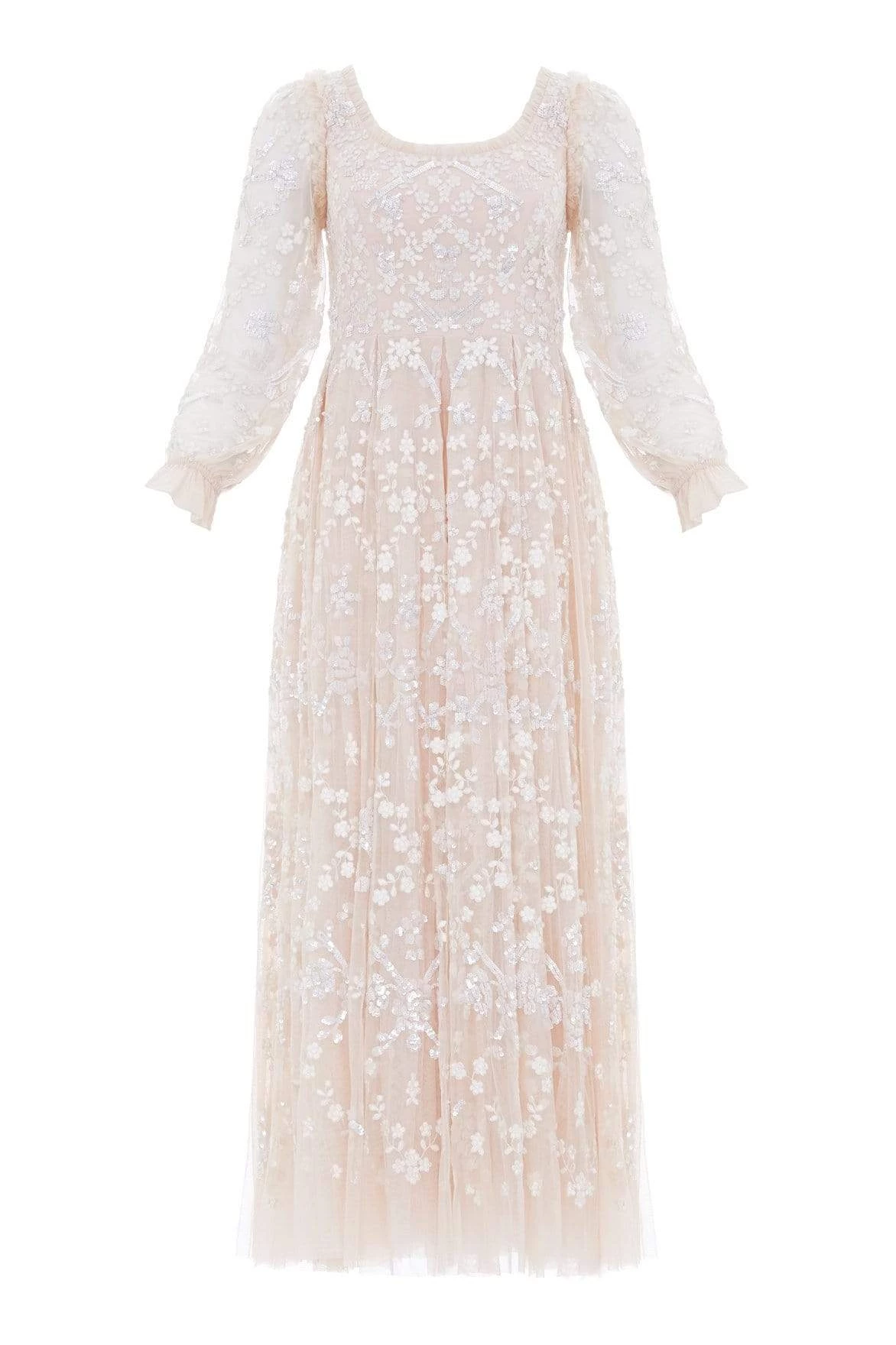 The Sweet Marie Ankle Gown in Strawberry Icing / White. The artwork of this gown is inspired by traditional Wedgwood ceramics. Intricately designed with scattered floral motifs and delicate check border details. This style is crafted with elaborate embroidery with highlights of shimmering, silver sequins for a romantic effect. Beautifully developed with a flattering silhouette, generous sleeves and a soft layered tulle skirt, with a net to create fullness and enchanting movement. Make this your new statement piece.