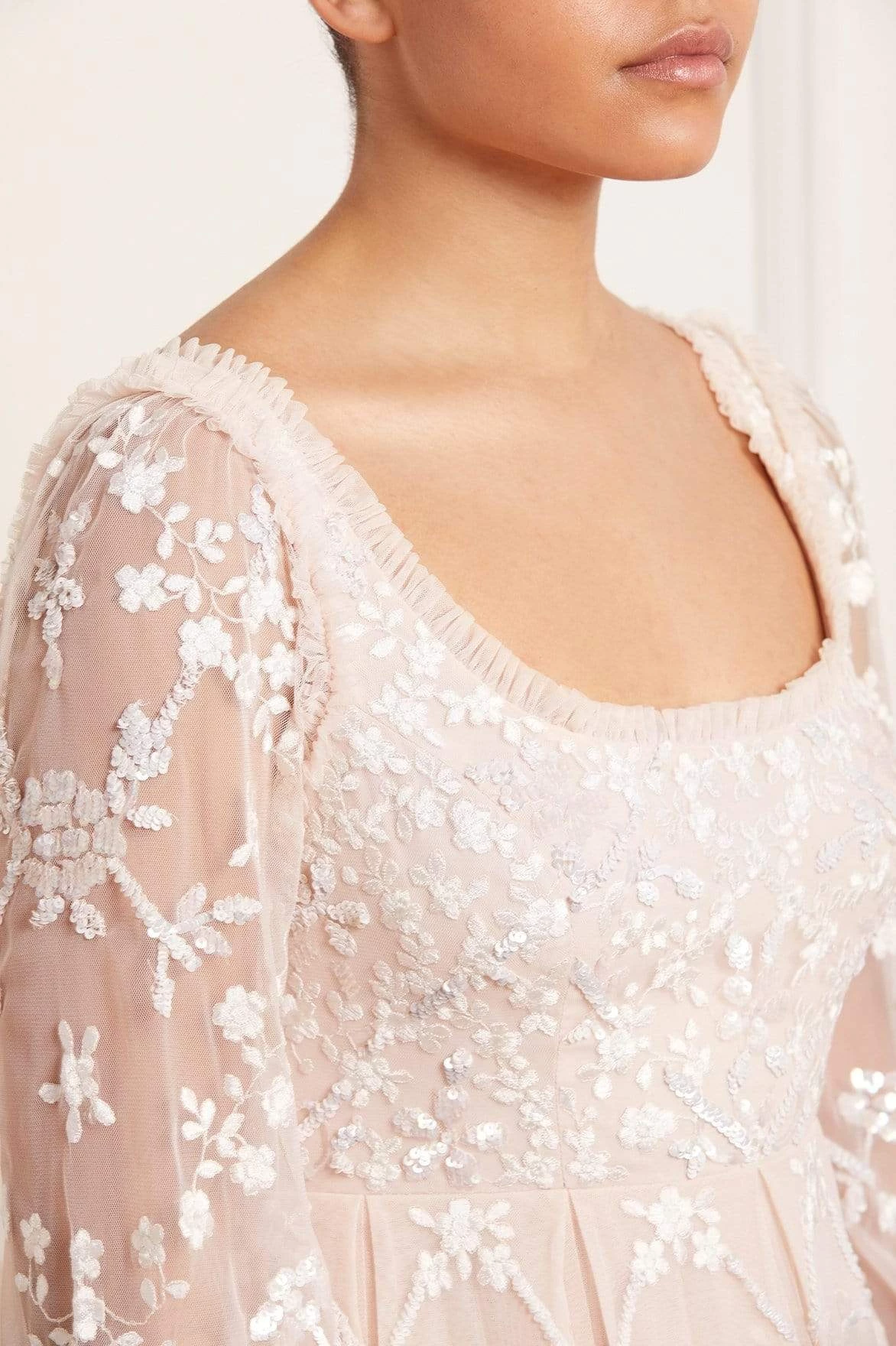 – Tulle decorated with tonal embroidery and iridescent sequins
