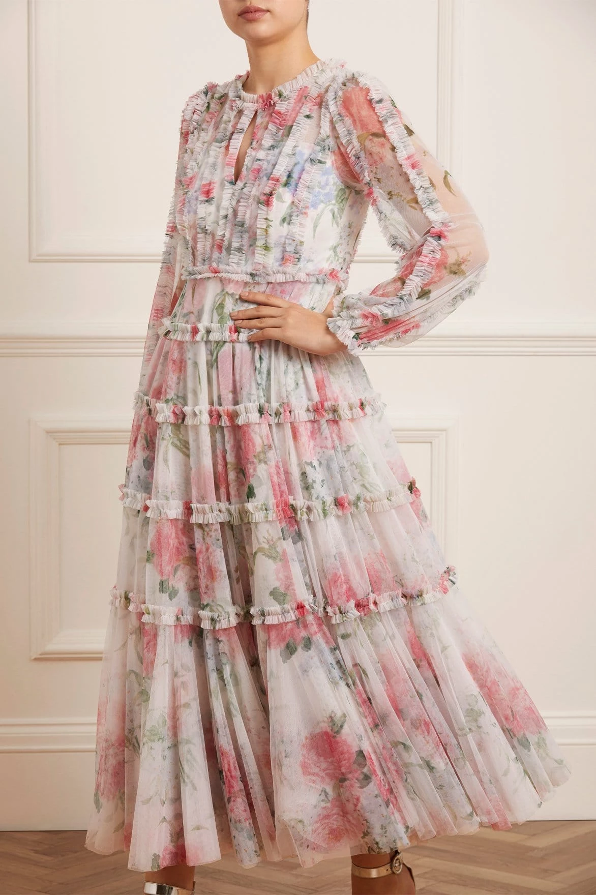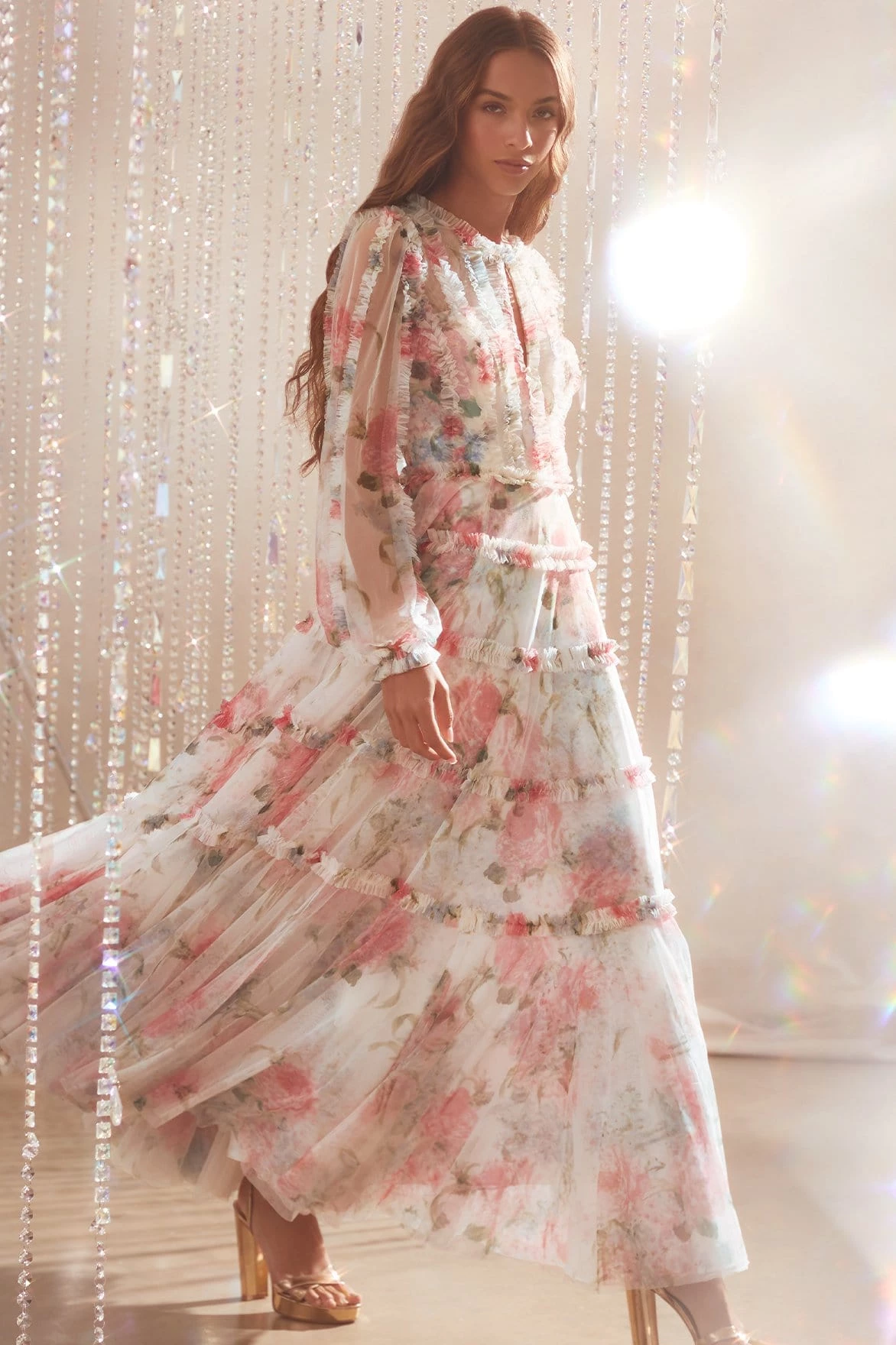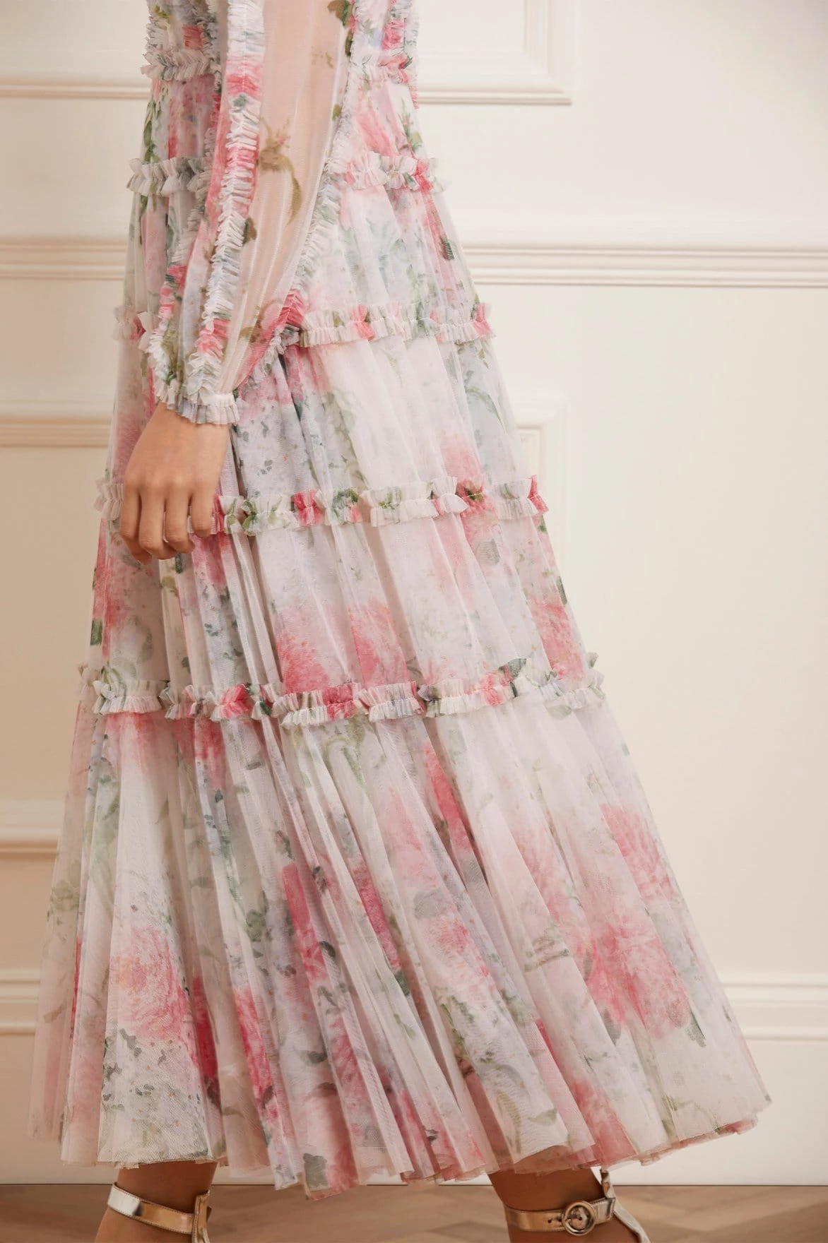 The Sweet Posy Ankle Gown in White / Multi. This beautiful piece is inspired by a print taken from a hand painted 1800s artwork. The gown features soft roses in layered colours, creating a romantic texture throughout. Crafted with perfectly proportioned tiers and a net layer to create a dramatic, statement silhouette. Sweep along to your next event in this truly romantic style.