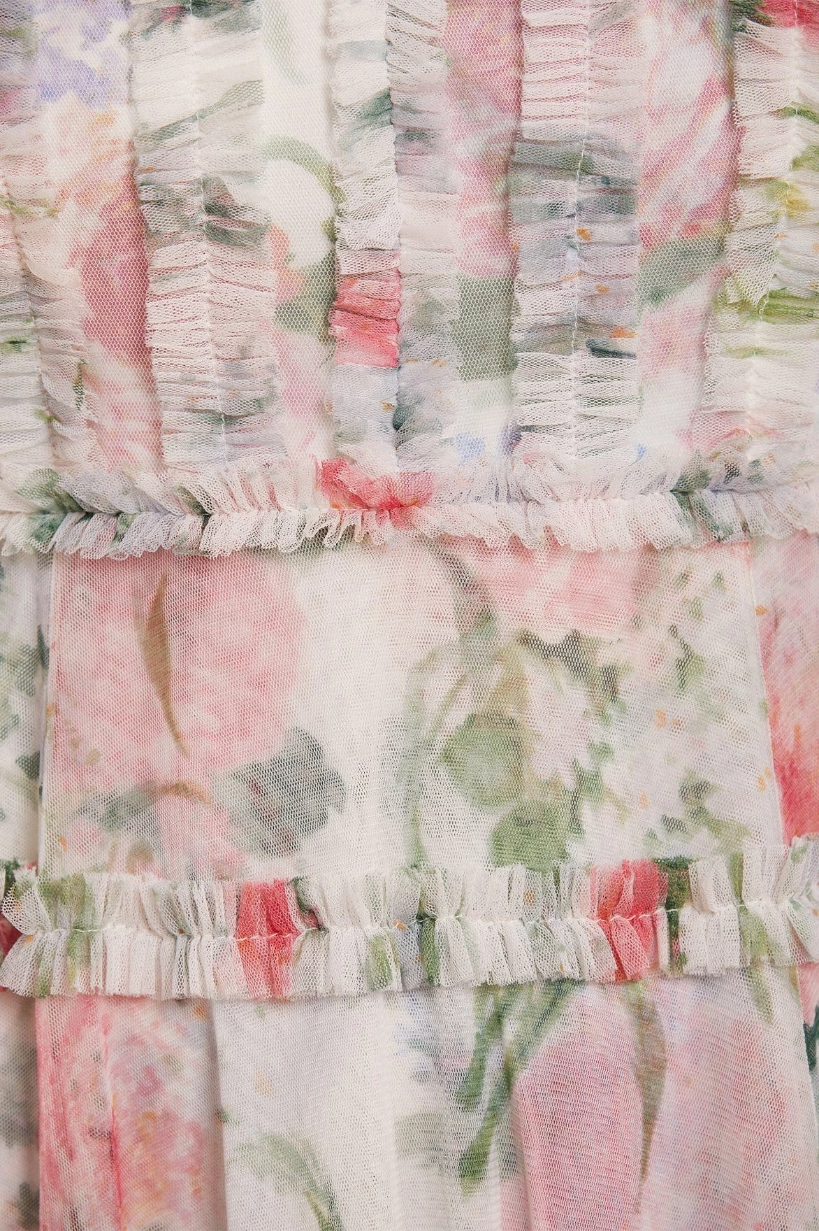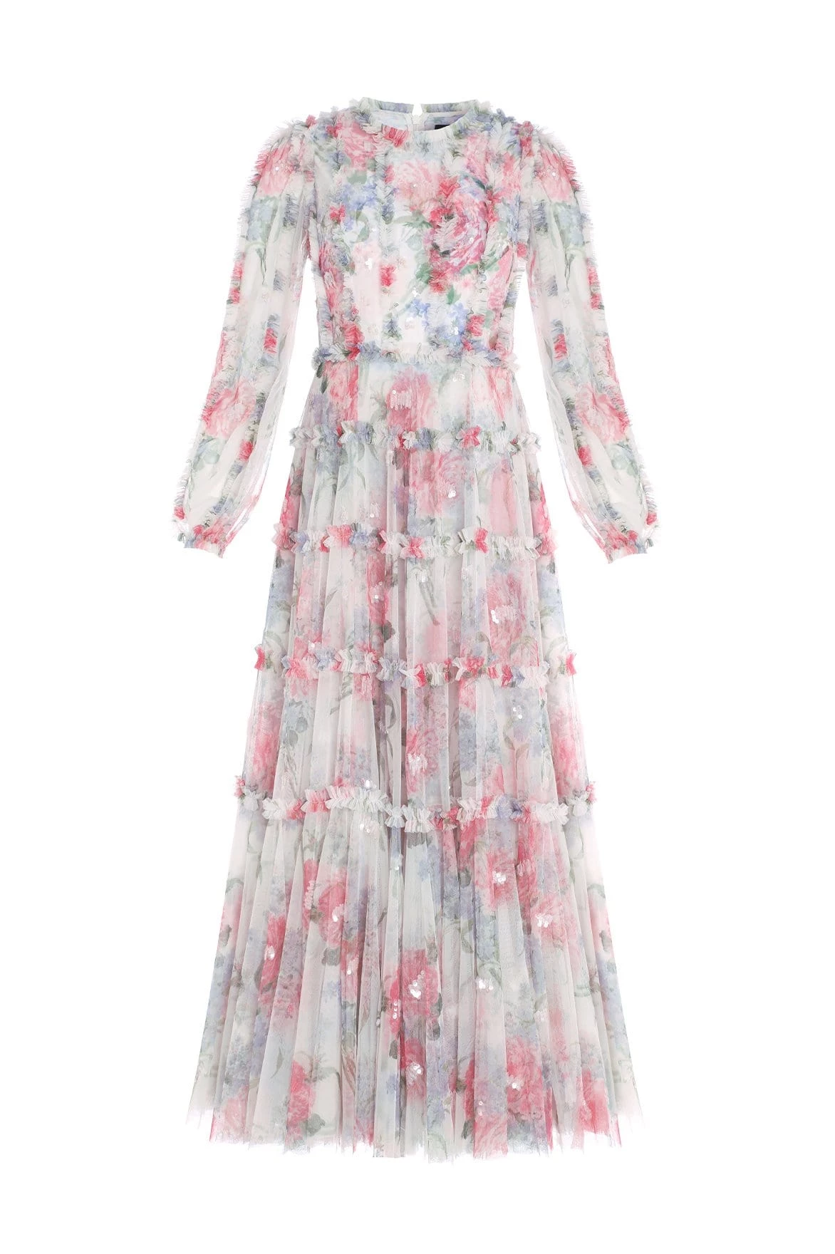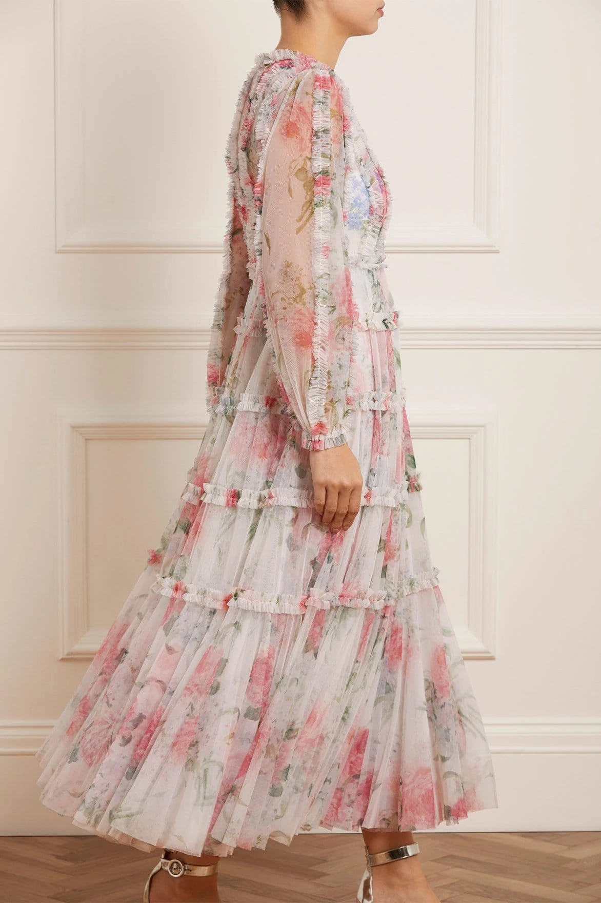 The Sweet Posy Ankle Gown in White / Multi. This beautiful piece is inspired by a print taken from a hand painted 1800s artwork. The gown features soft roses in layered colours, creating a romantic texture throughout. Crafted with perfectly proportioned tiers and a net layer to create a dramatic, statement silhouette. Sweep along to your next event in this truly romantic style.