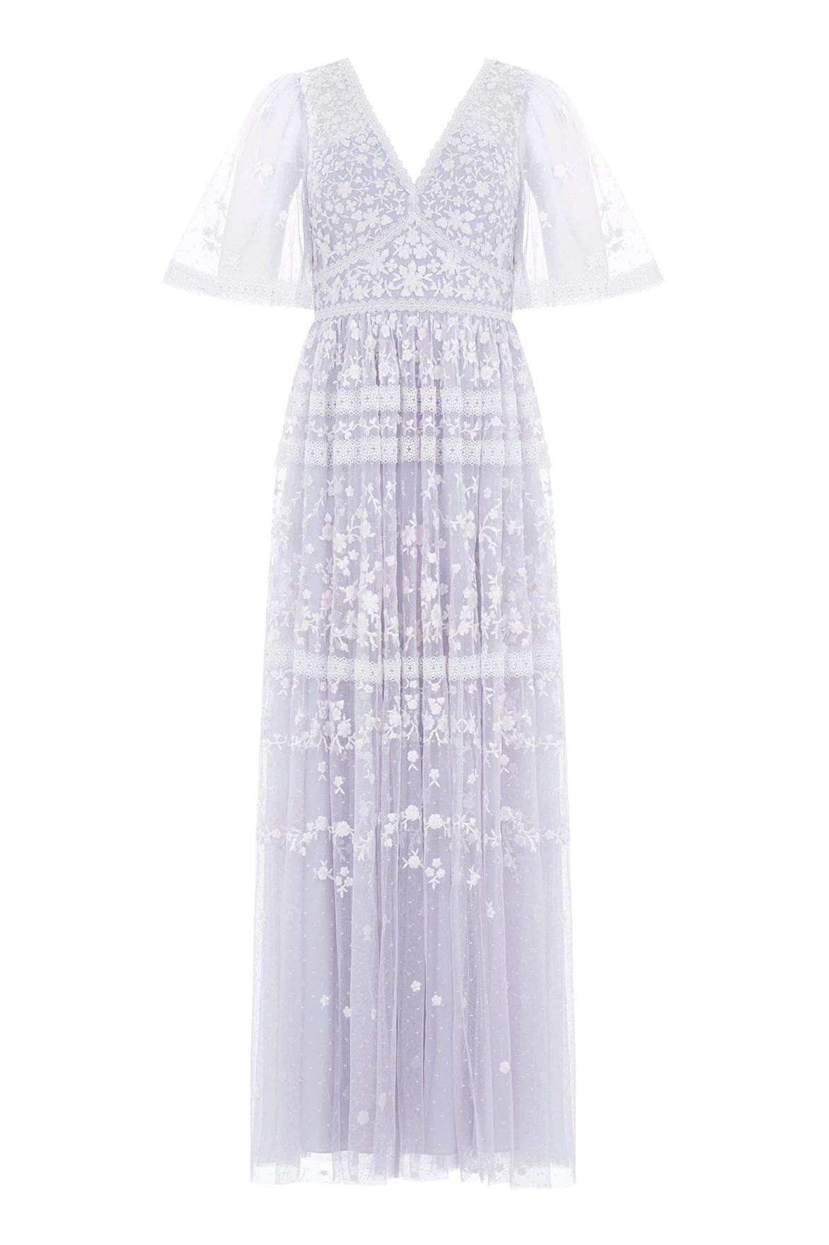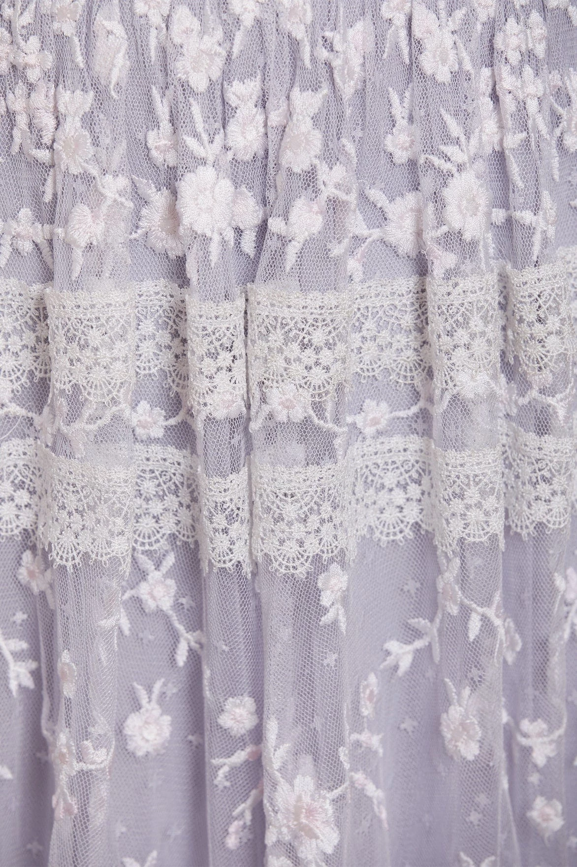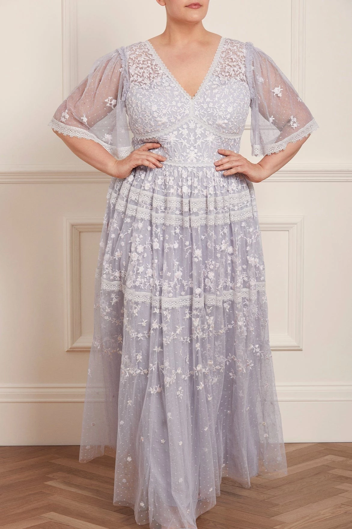 NEW SEASON. The Sweetheart Lace Gown in Porcelain Blue/White. A signature Needle & Thread style. This gown is embroidered delicately with a floral lace artwork. Designed beautifully with intricate trimmed lace in pretty border motifs and perfectly positioned tiers through the skirt. Crafted from soft, kisses tulle creating a romantic texture throughout. The perfect gown to take you from day to night.